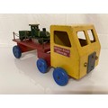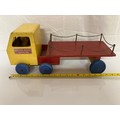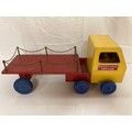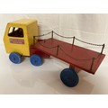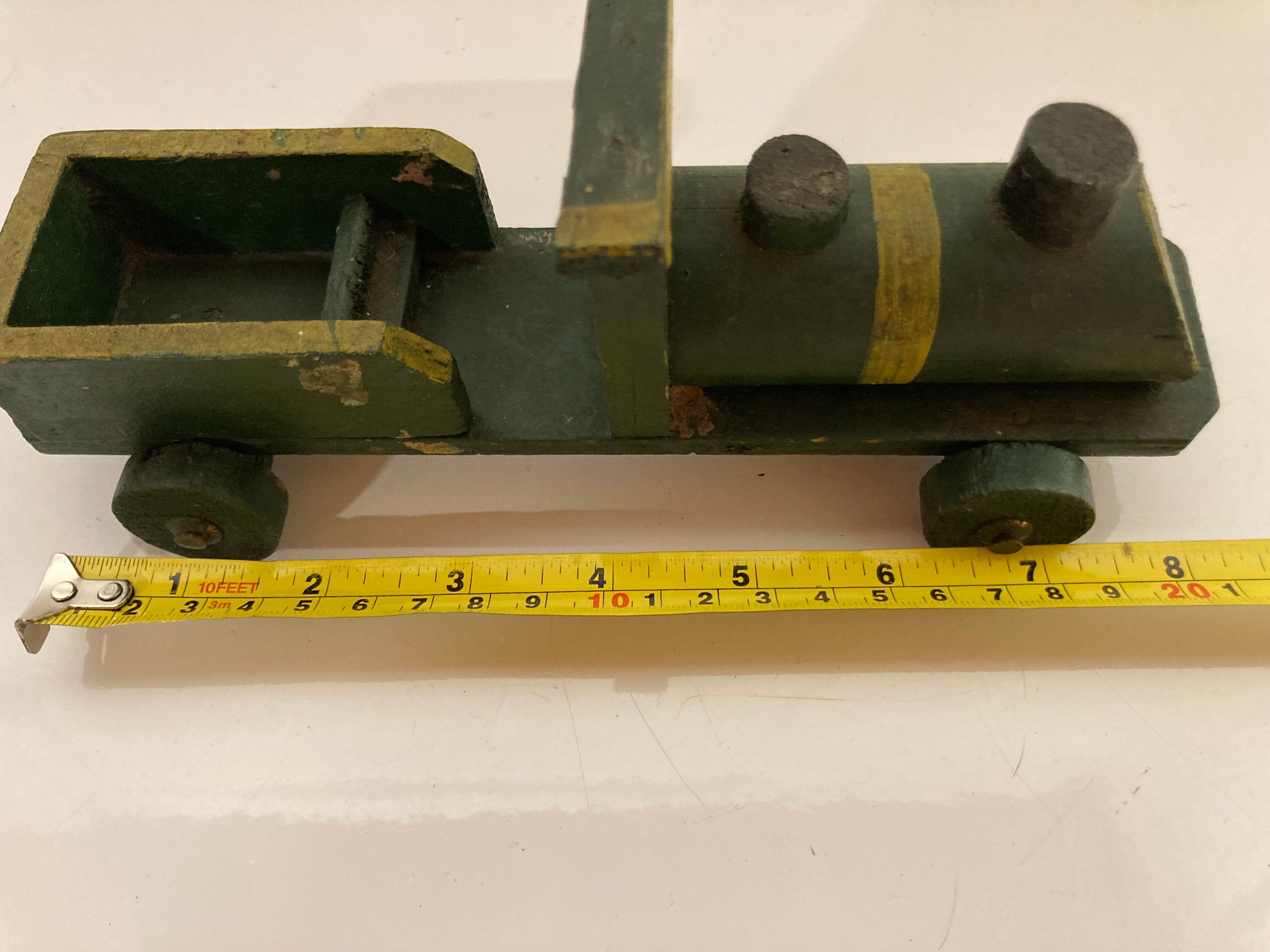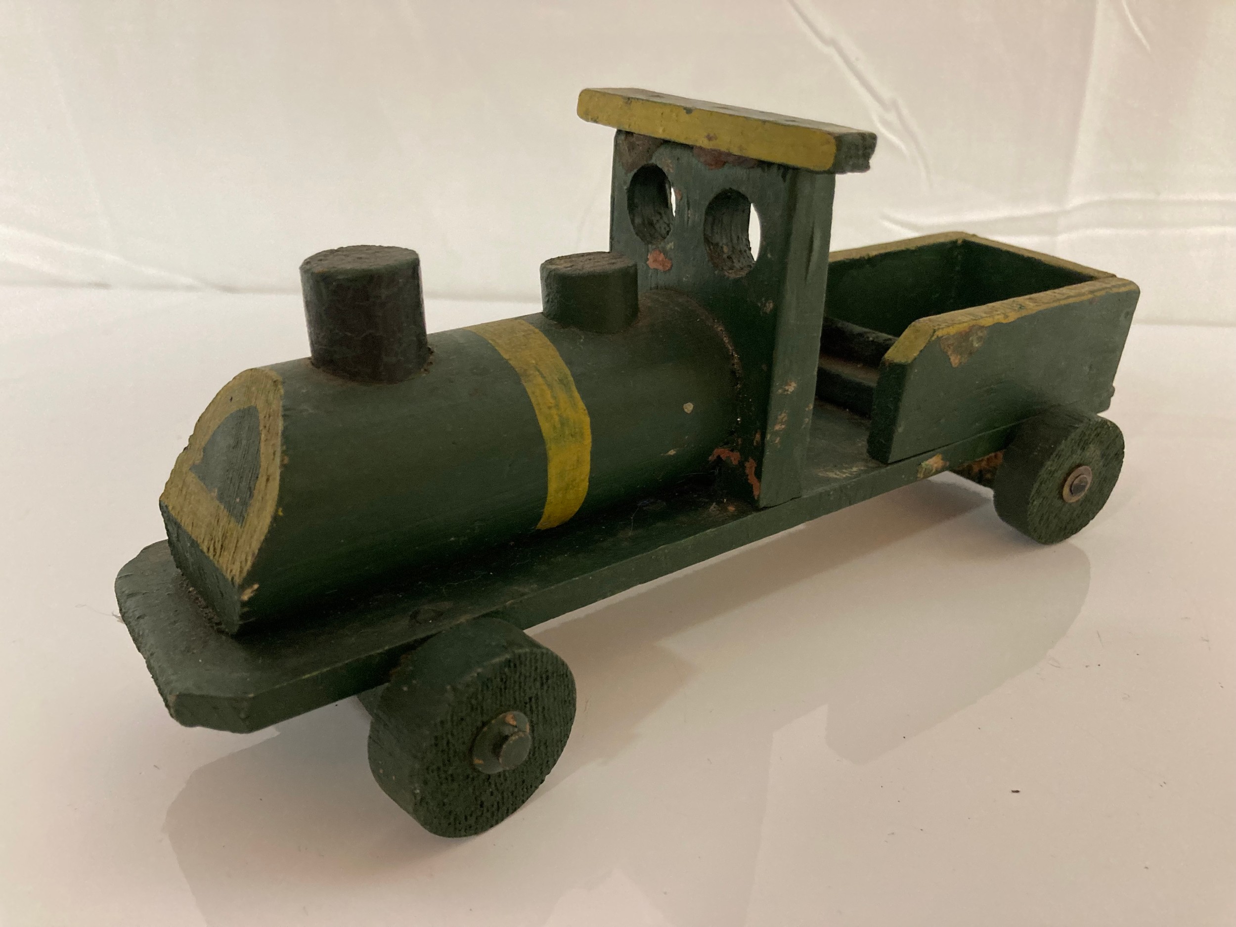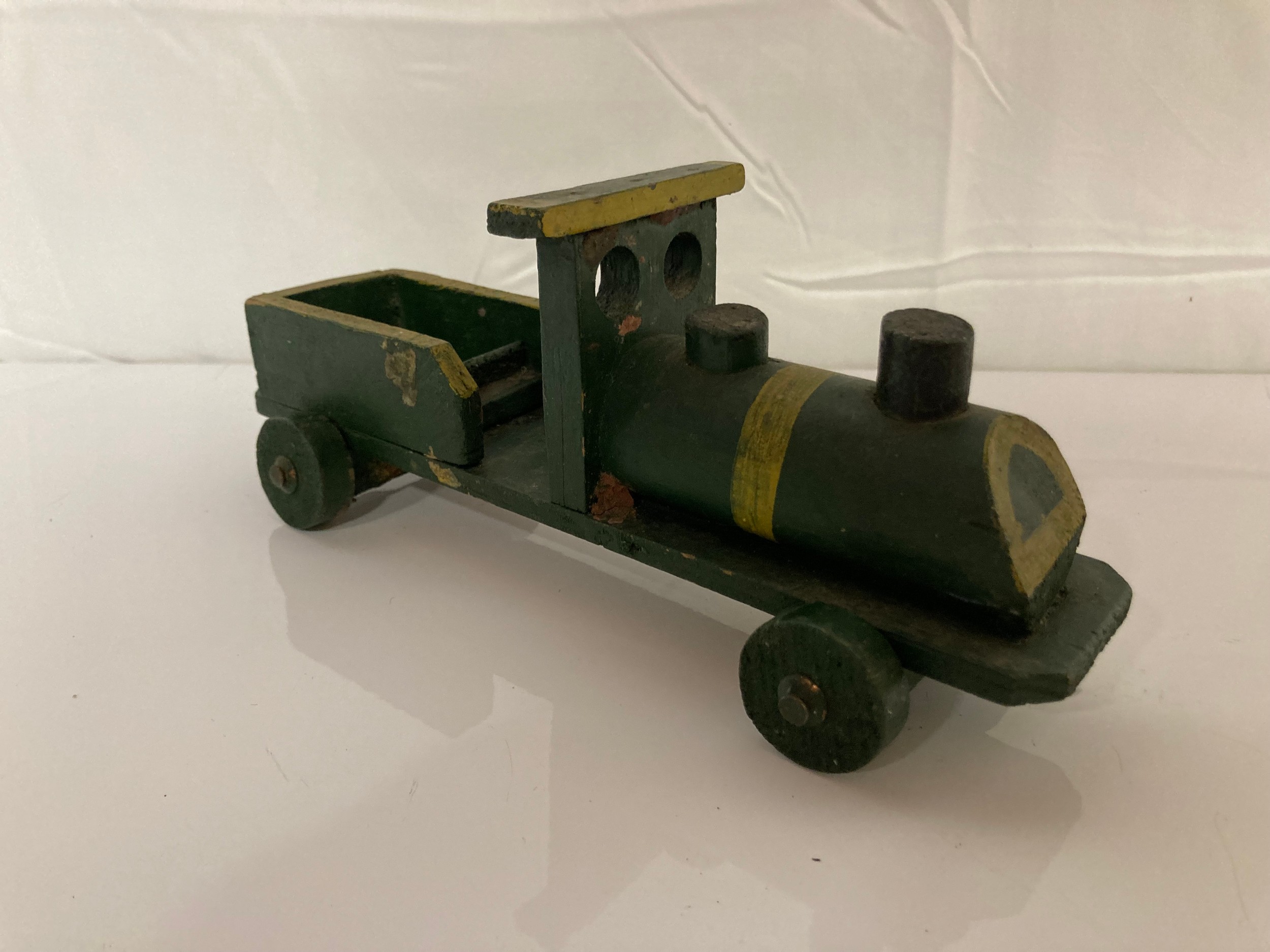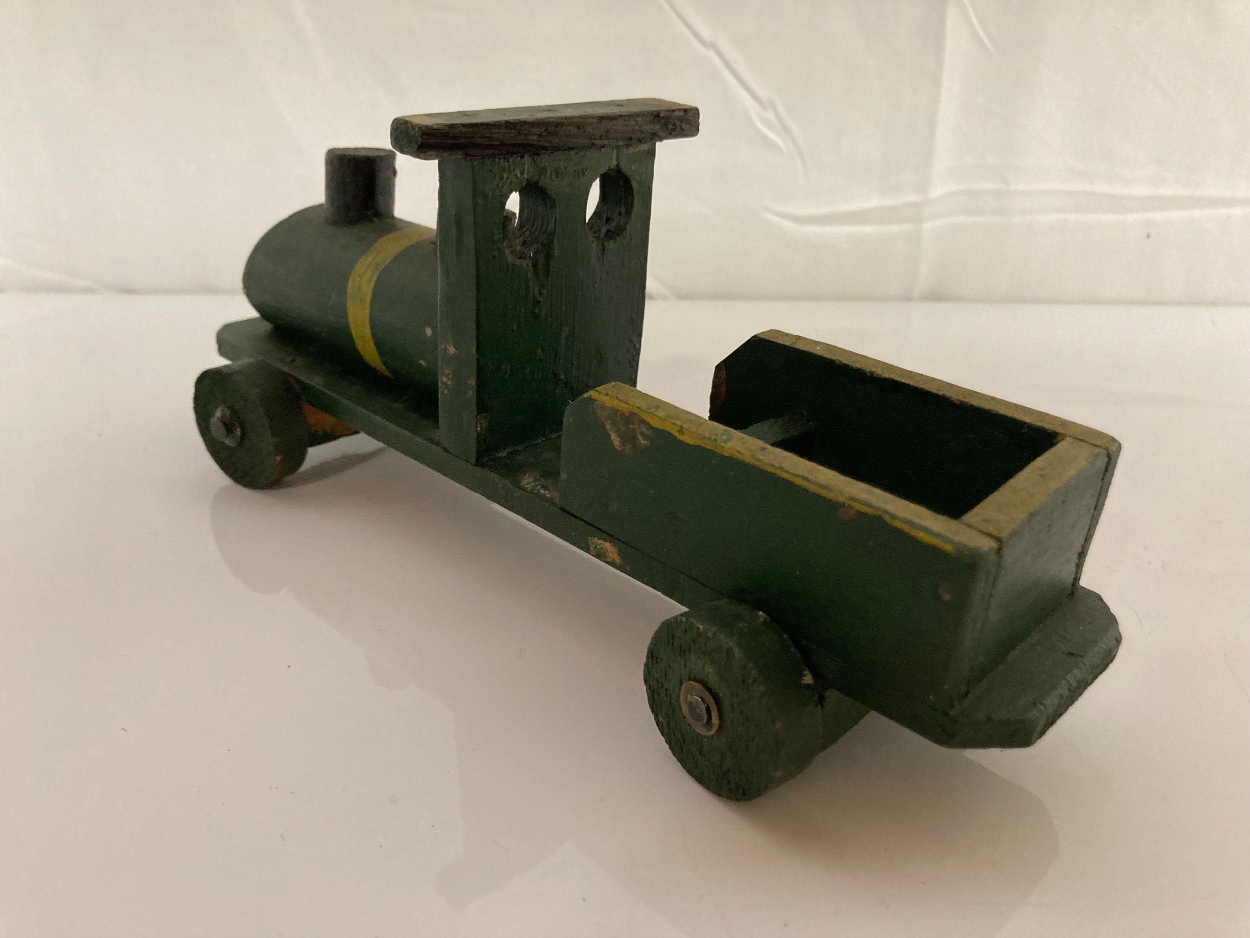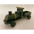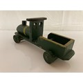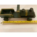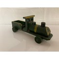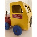 Toy lorry and train, a large wooden flat bed lorry marked for British Road Services, 19 inches long, and a painted wooden toy train 9 inches long.