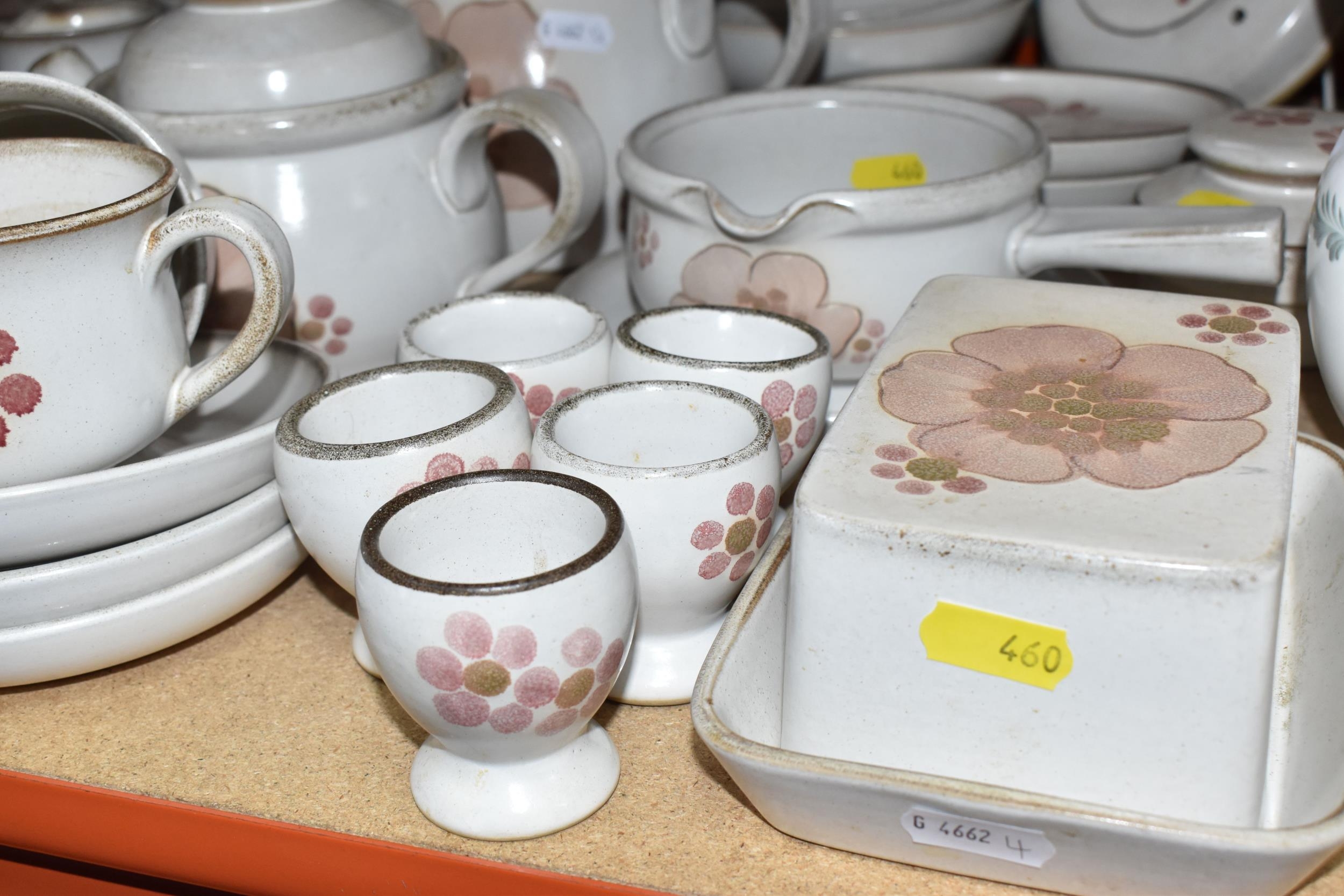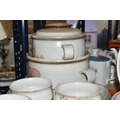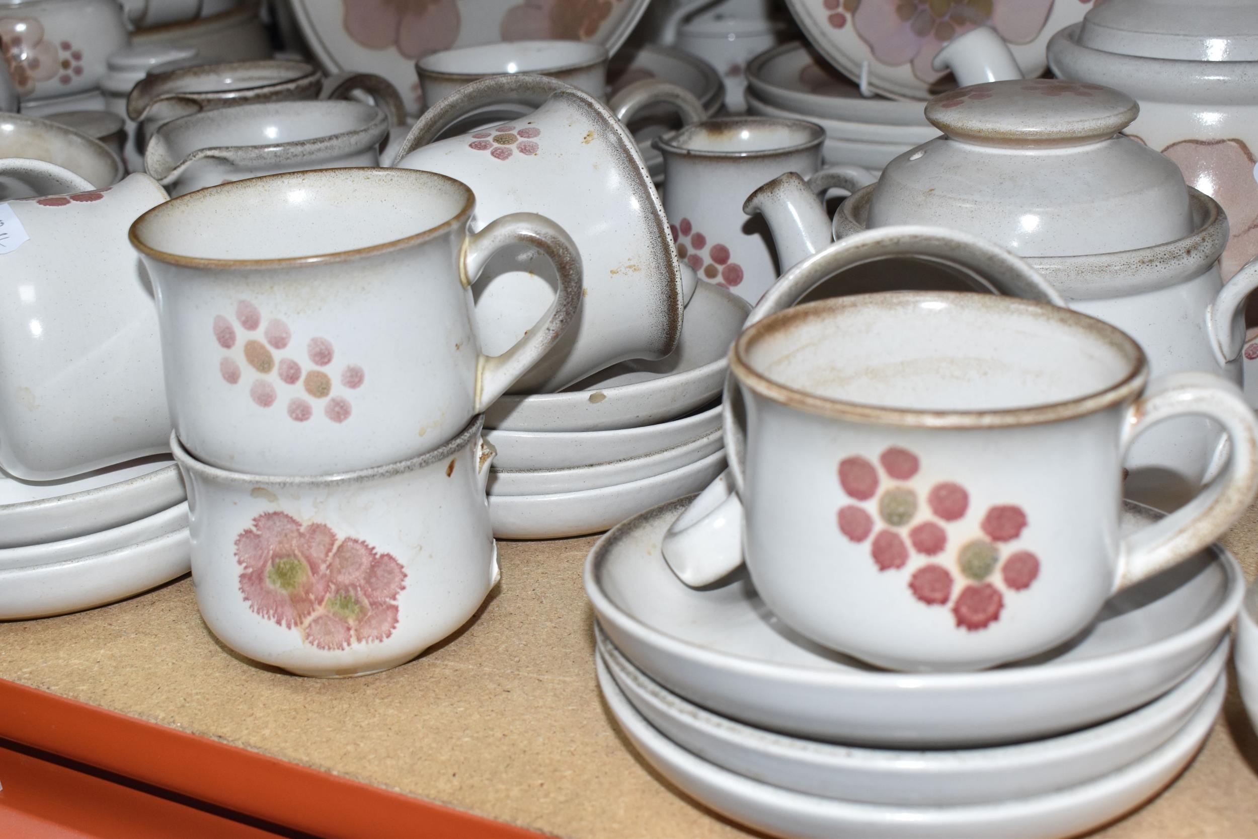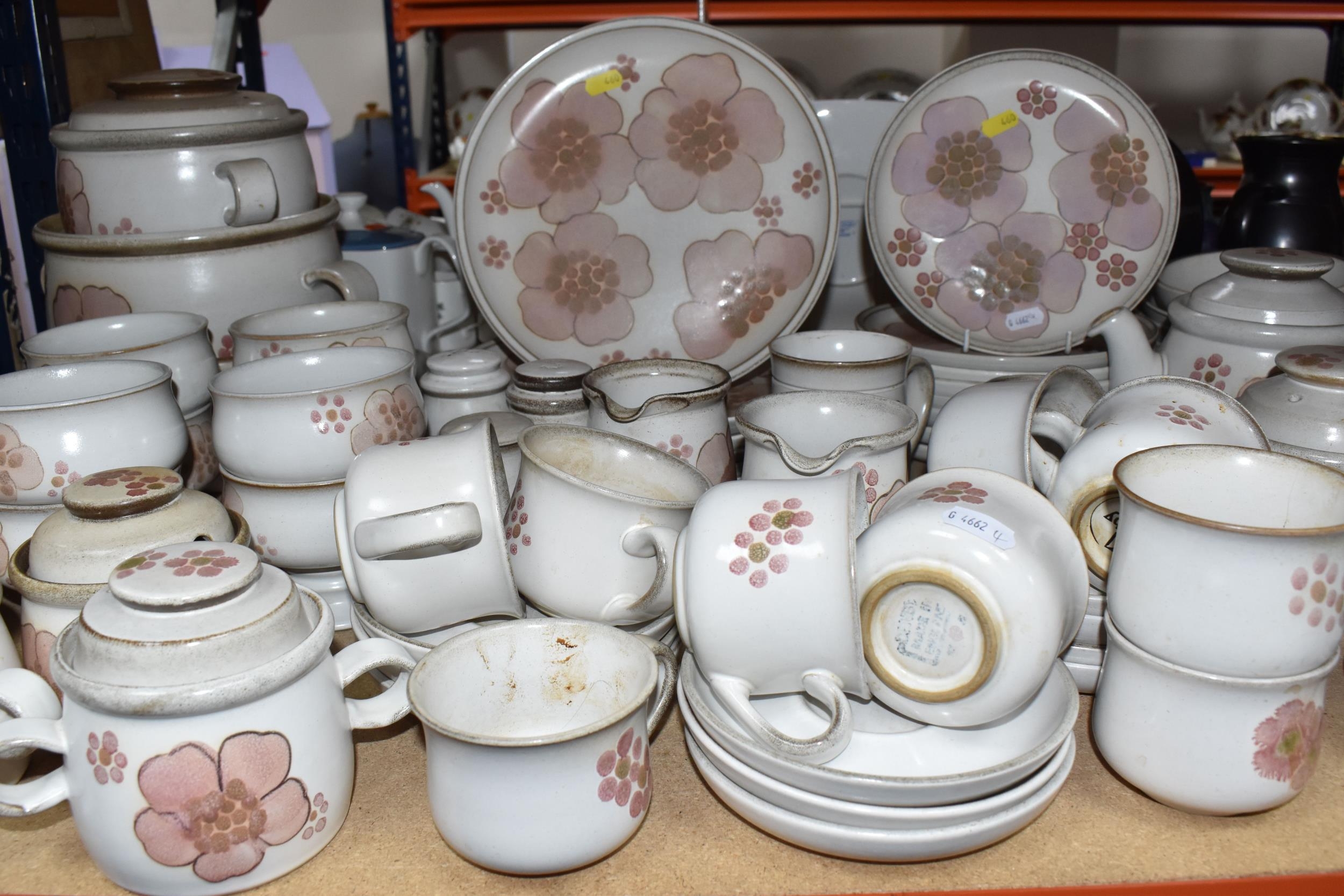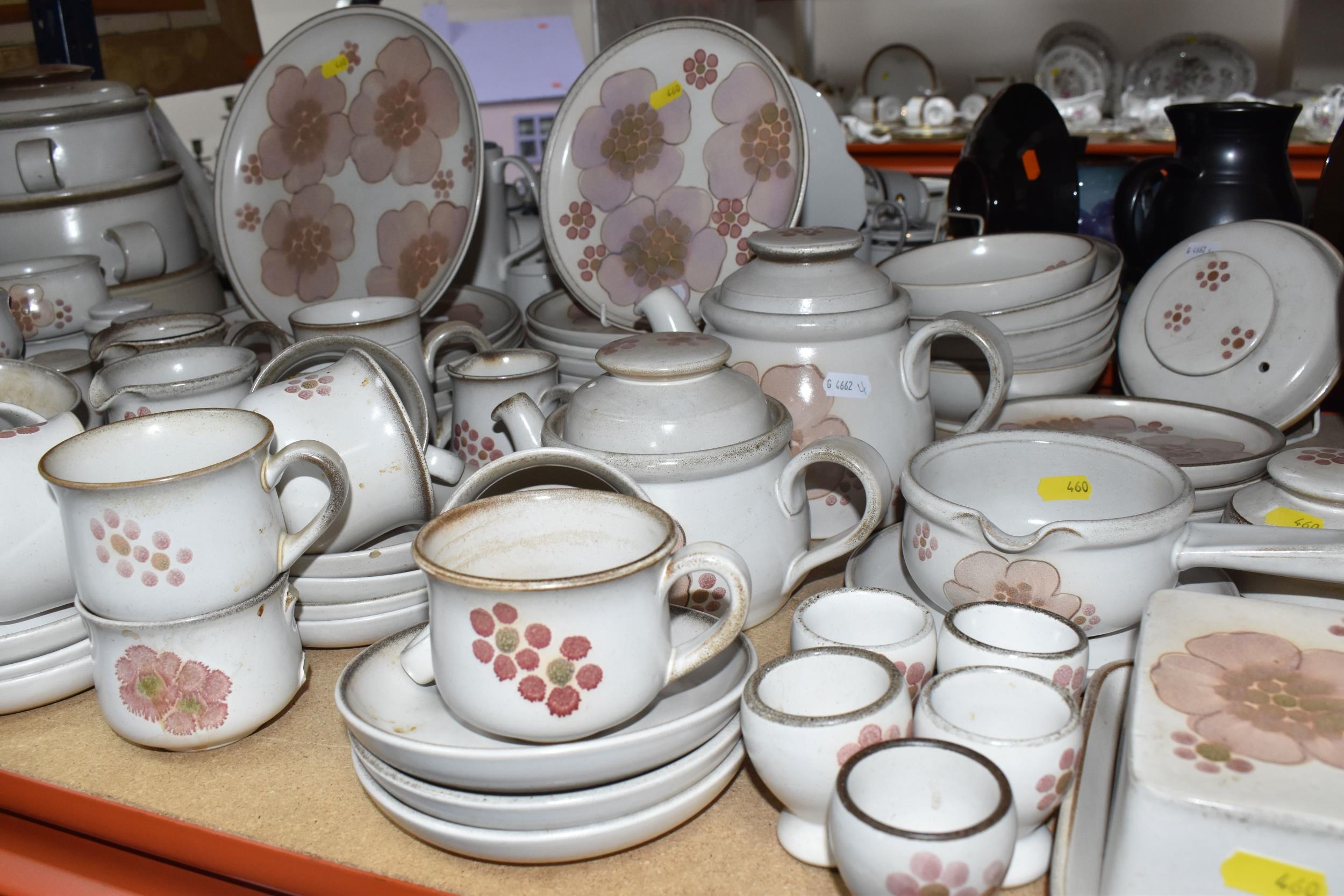 A DENBY 'GYPSY' DINNER AND TEA SET comprising a butter dish, five egg cups, a salt and a pepper shaker, a mustard pot, a preserve put, a sauce boat and stand, a small teapot with an additional lid, one large tea pot (lid has chips to the interior rim), eleven tea cups (one with a missing handle, three with hairline cracks, heavy staining across most), thirteen saucers (two chipped), two milk jugs, a cream jug, one mug (crack to the rim), three side plates, four breakfast bowls (one chipped), one fruit dish (chipped lip), eight dessert bowl, eight tea plates, six dinner plates (some scratches), two double-handled lidded soup pots (marked second quality), two ovoid serving plates, a small lidded tureen (with additional lid), a large tureen (lid missing), and a large serving bowl (qty) (Condition Report: many items are stained or dirty and would benefit from a comprehensive clean, individual conditions described above)