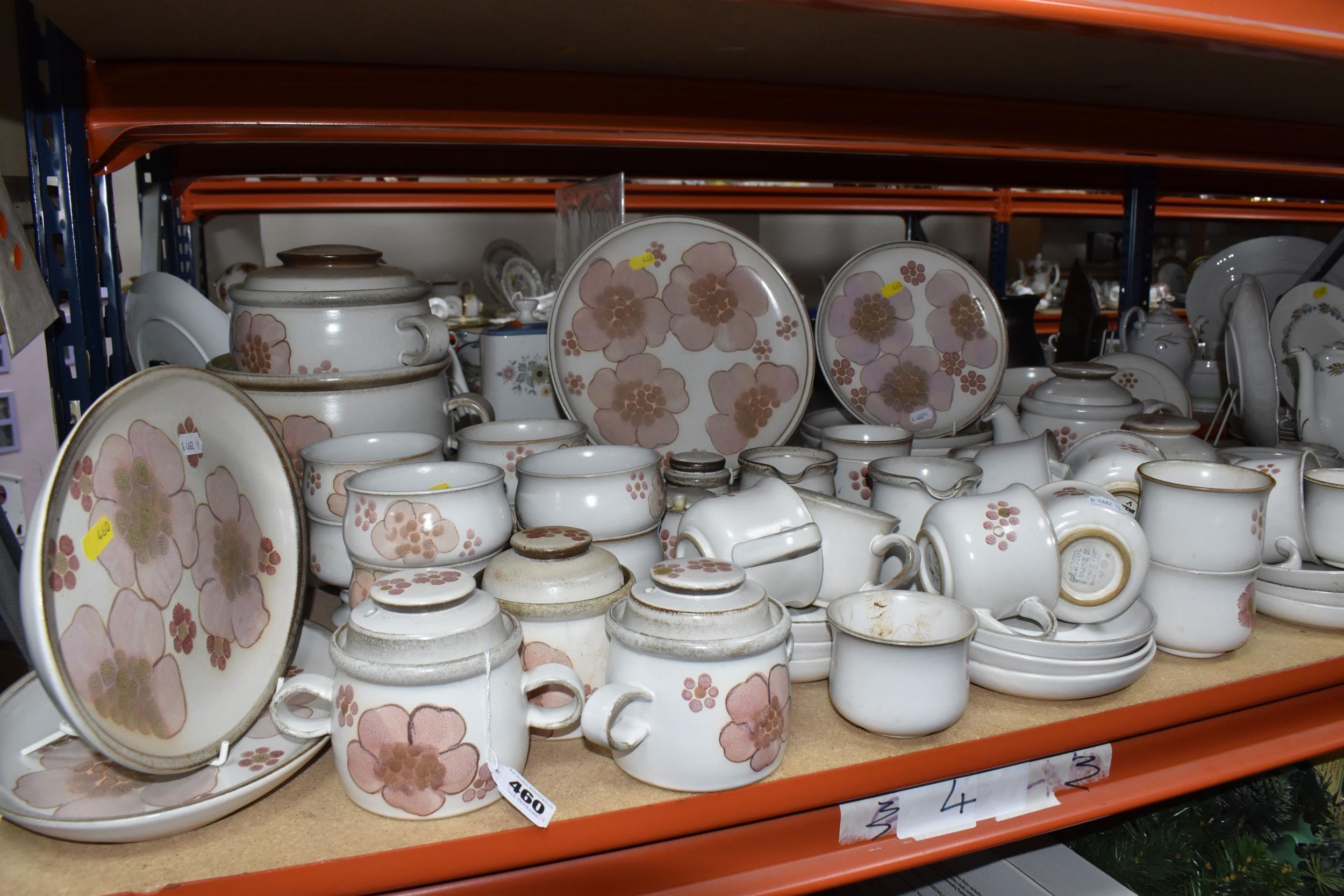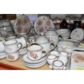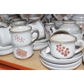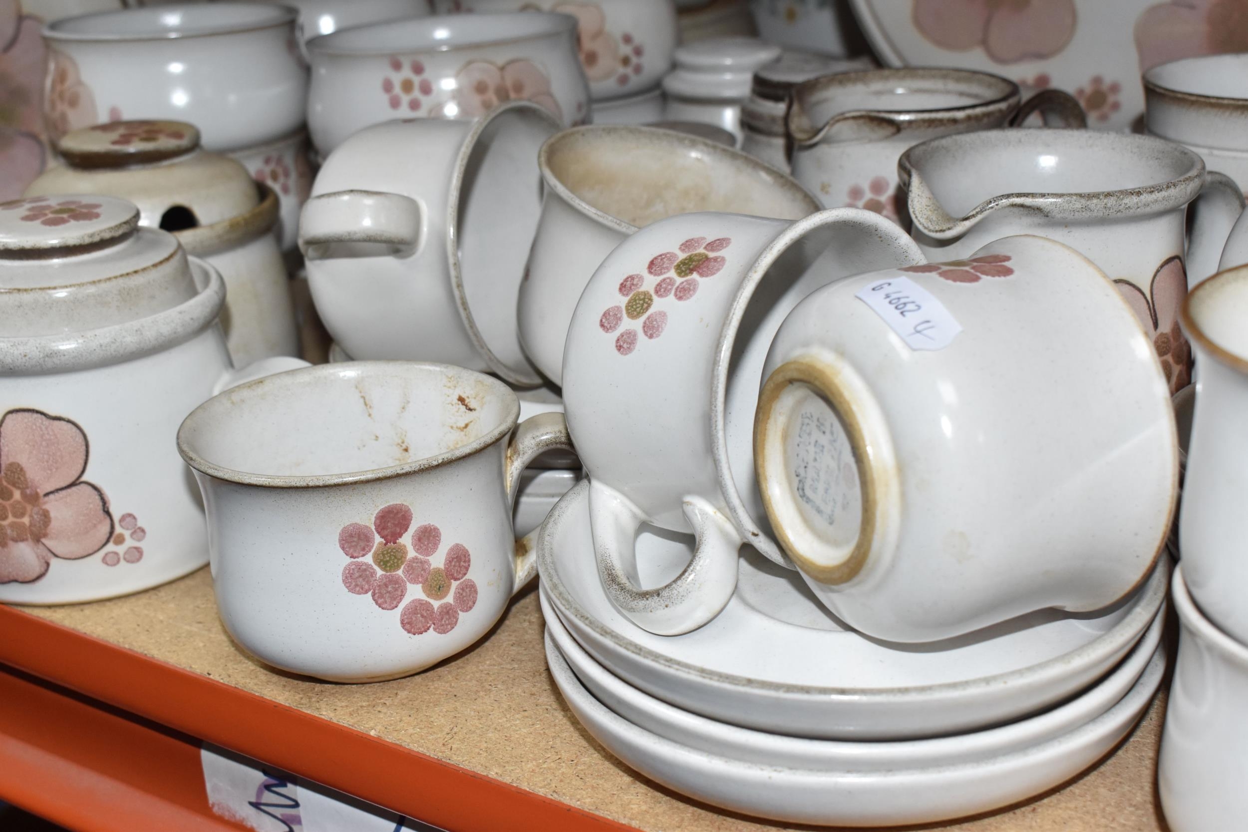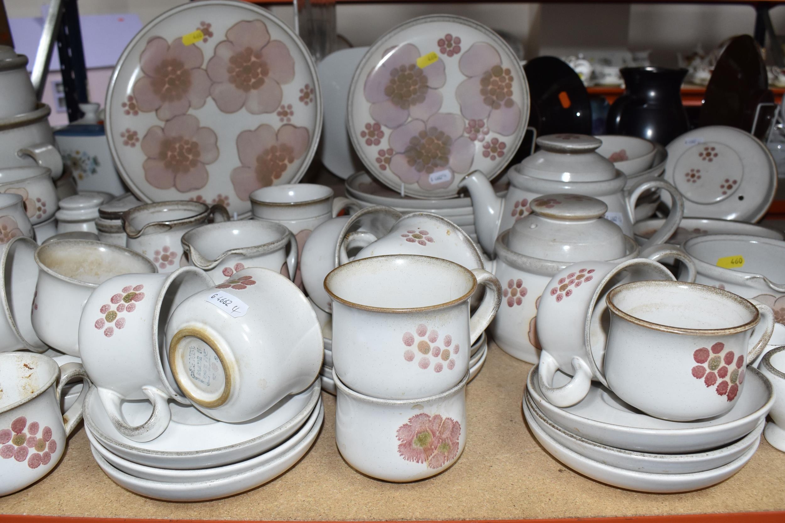 A DENBY 'GYPSY' DINNER AND TEA SET comprising a butter dish, five egg cups, a salt and a pepper shaker, a mustard pot, a preserve put, a sauce boat and stand, a small teapot with an additional lid, one large tea pot (lid has chips to the interior rim), eleven tea cups (one with a missing handle, three with hairline cracks, heavy staining across most), thirteen saucers (two chipped), two milk jugs, a cream jug, one mug (crack to the rim), three side plates, four breakfast bowls (one chipped), one fruit dish (chipped lip), eight dessert bowl, eight tea plates, six dinner plates (some scratches), two double-handled lidded soup pots (marked second quality), two ovoid serving plates, a small lidded tureen (with additional lid), a large tureen (lid missing), and a large serving bowl (qty) (Condition Report: many items are stained or dirty and would benefit from a comprehensive clean, individual conditions described above)