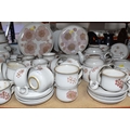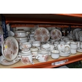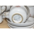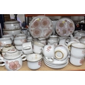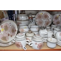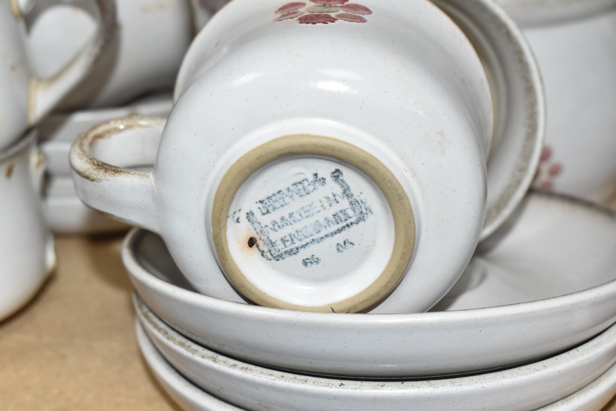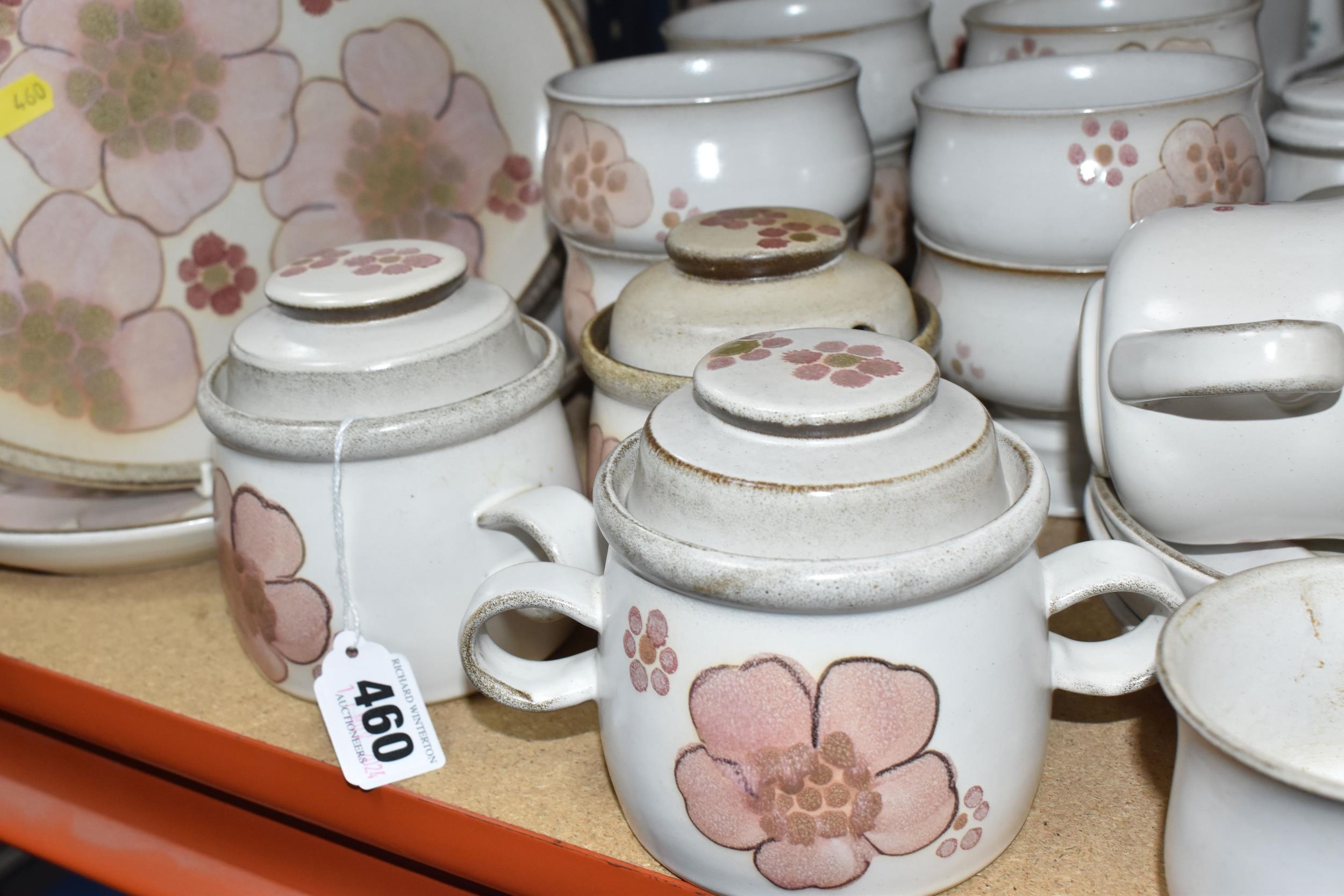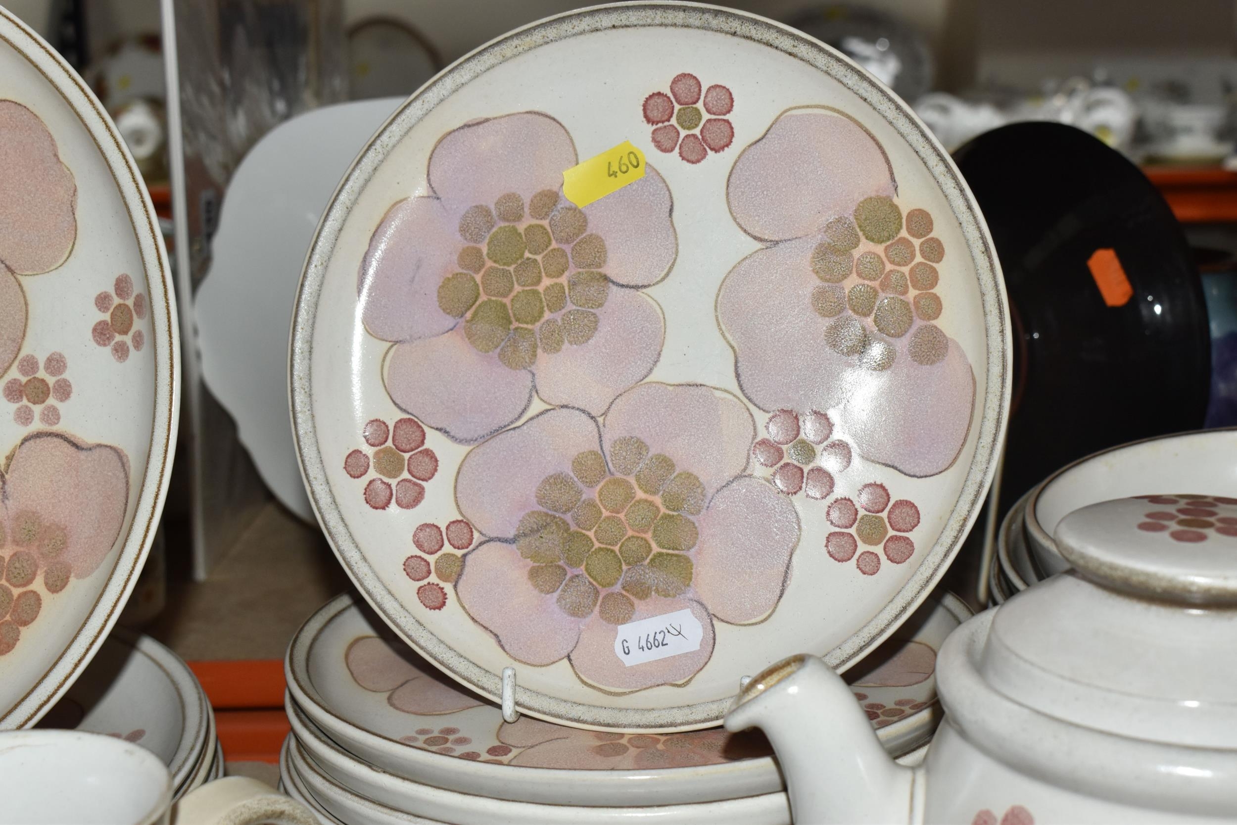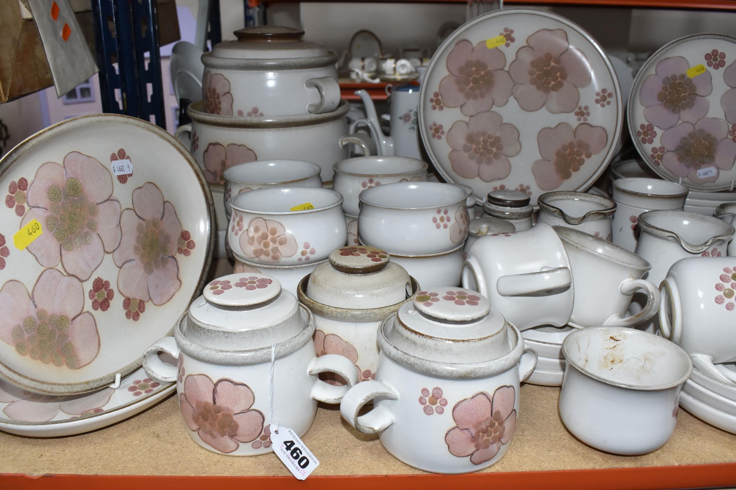 A DENBY 'GYPSY' DINNER AND TEA SET comprising a butter dish, five egg cups, a salt and a pepper shaker, a mustard pot, a preserve put, a sauce boat and stand, a small teapot with an additional lid, one large tea pot (lid has chips to the interior rim), eleven tea cups (one with a missing handle, three with hairline cracks, heavy staining across most), thirteen saucers (two chipped), two milk jugs, a cream jug, one mug (crack to the rim), three side plates, four breakfast bowls (one chipped), one fruit dish (chipped lip), eight dessert bowl, eight tea plates, six dinner plates (some scratches), two double-handled lidded soup pots (marked second quality), two ovoid serving plates, a small lidded tureen (with additional lid), a large tureen (lid missing), and a large serving bowl (qty) (Condition Report: many items are stained or dirty and would benefit from a comprehensive clean, individual conditions described above)