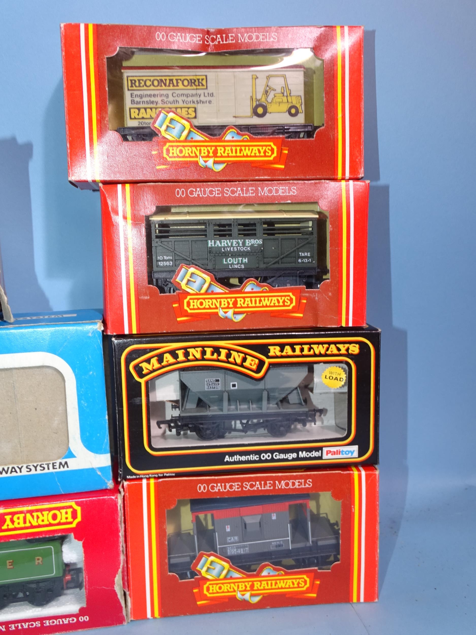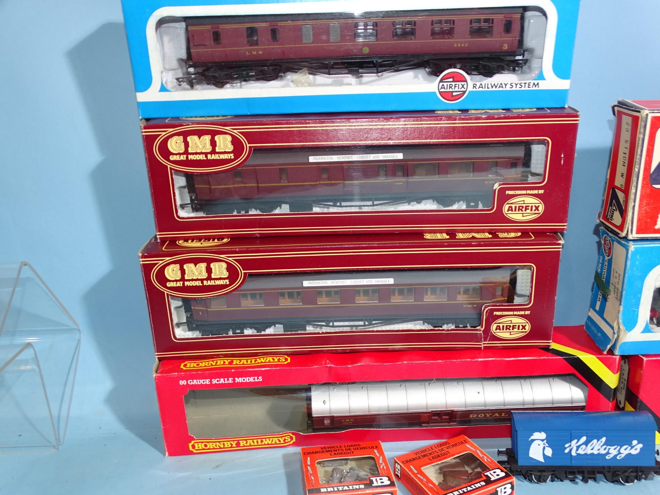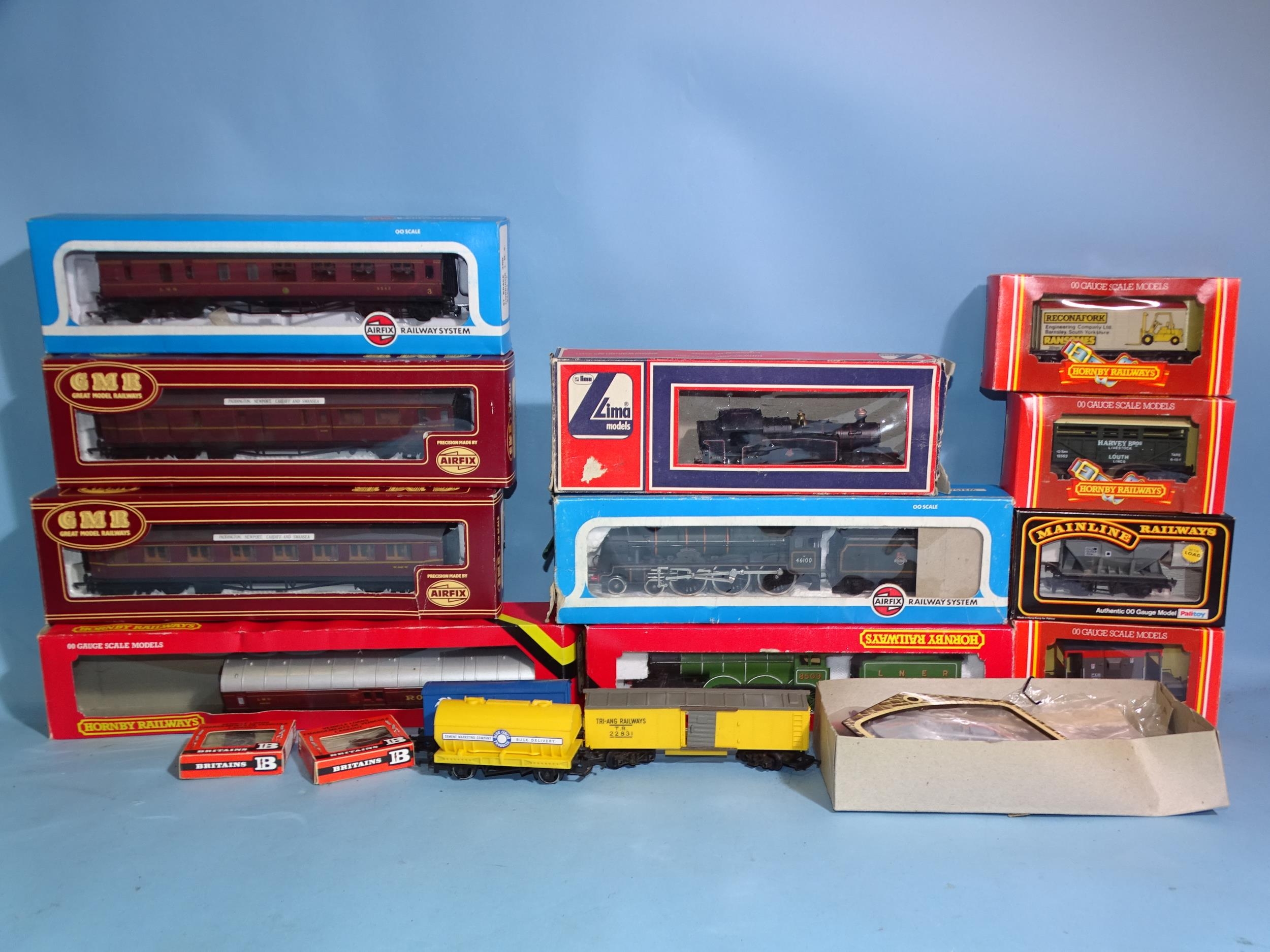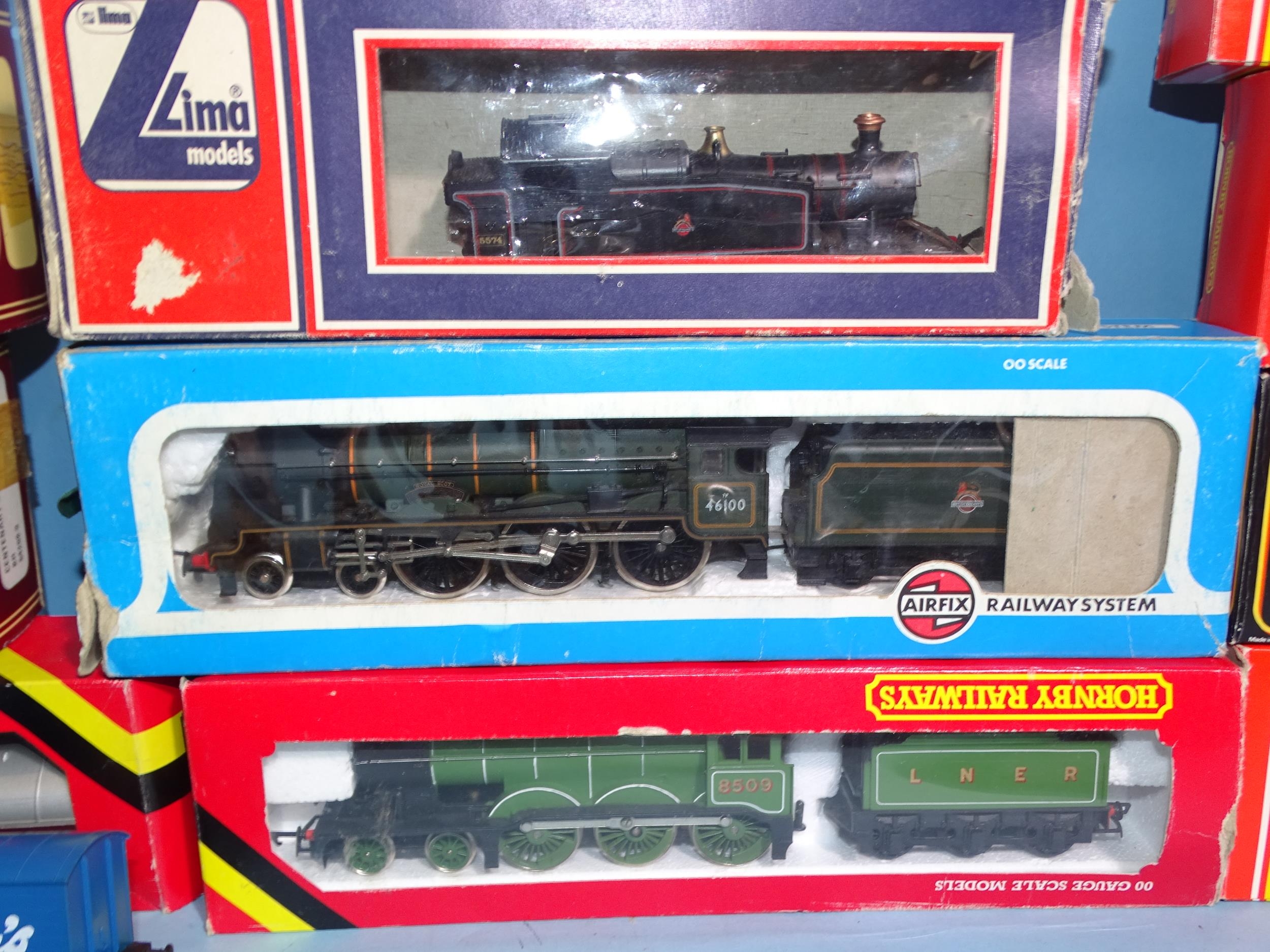 Hornby OO gauge, R866 4-6-0 LNER B12 locomotive, (boxed, box a/f), Airfix 54121-3 4-6-0 BR Royal Scot locomotive, (boxed, box a/f), a Lima 2-6-2 tank engine, four coaches, seven wagons, (some boxed), track, buildings, etc.
