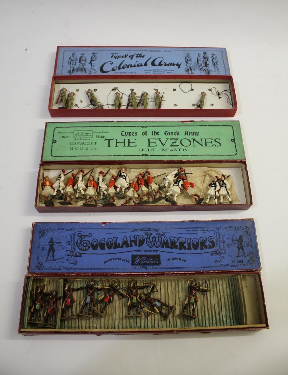 BRITAINS BOXED SETS including No 196 The Evzones, now comprising 16 Evzones marching at the slope, two variations in Types of the Greek Army box. Together with No 202 Togoland Warriors, comprising 8 native figures with bows and arrows, traditional head dress and loincloths, in Whisstock box and 8 Australian Infantry in No 1544 Australian Infantry 'Types of the Colonial Army Box.
