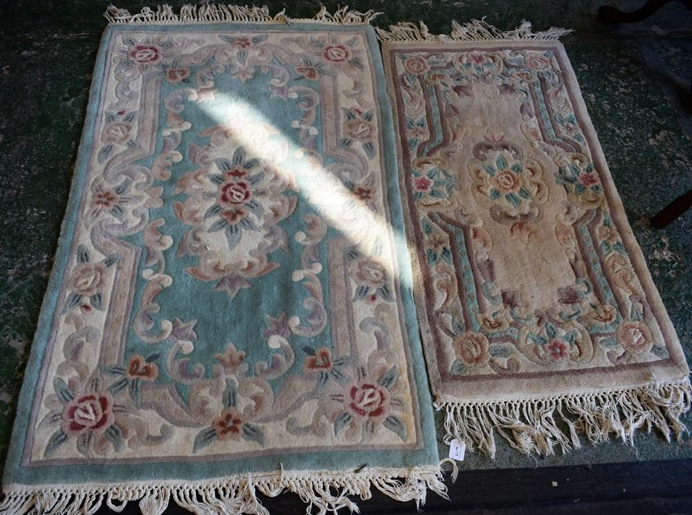 A Chinese woven wool carpet, stylised flowers of cream, pink, green and mink on a pale green ground, 150cm x 90cm; another similar, 125cm x 62cm (2)