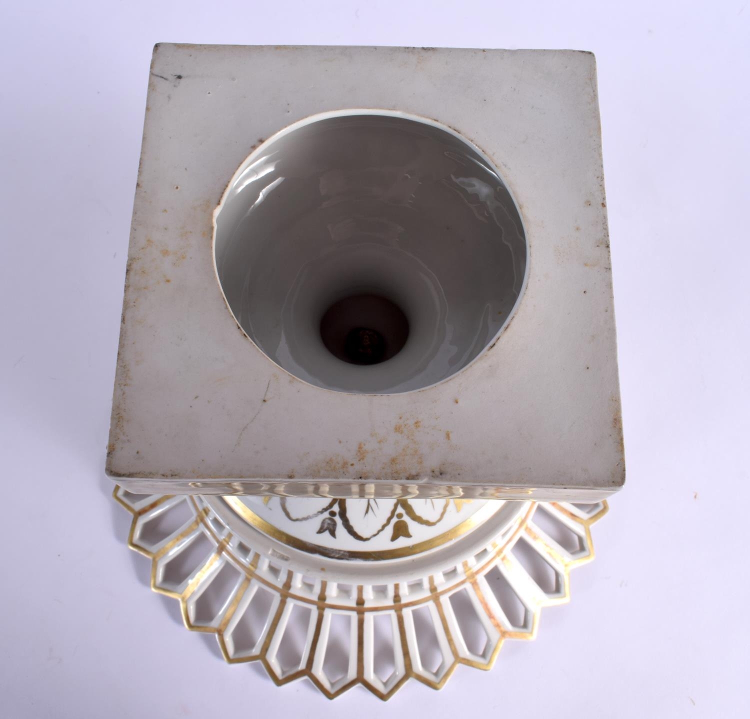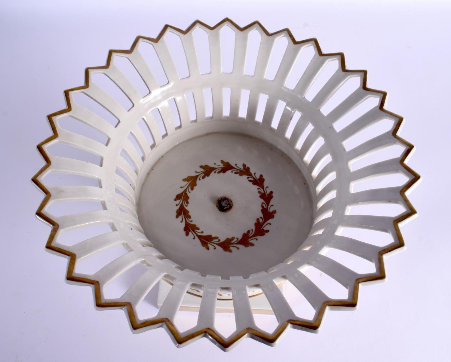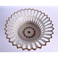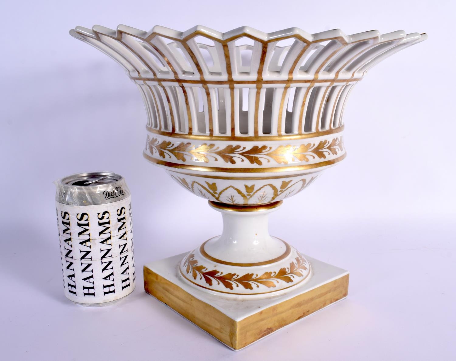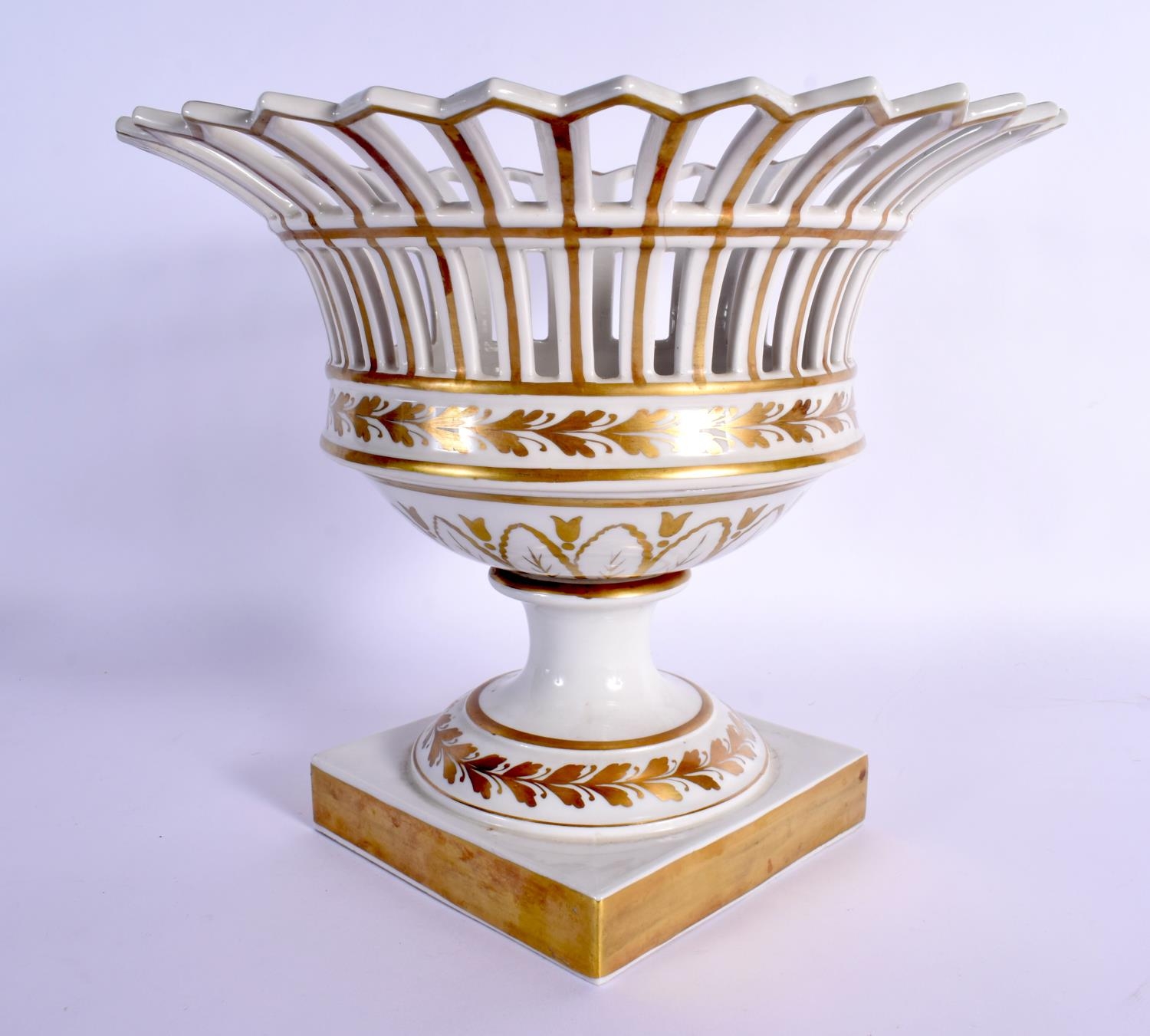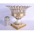 A LATE 19TH FRENCH GILT AND WHITE PORCELAIN PEDESTAL COMPORT painted with gilt sprays. 26 cm x 26 cm.