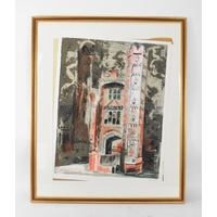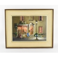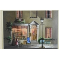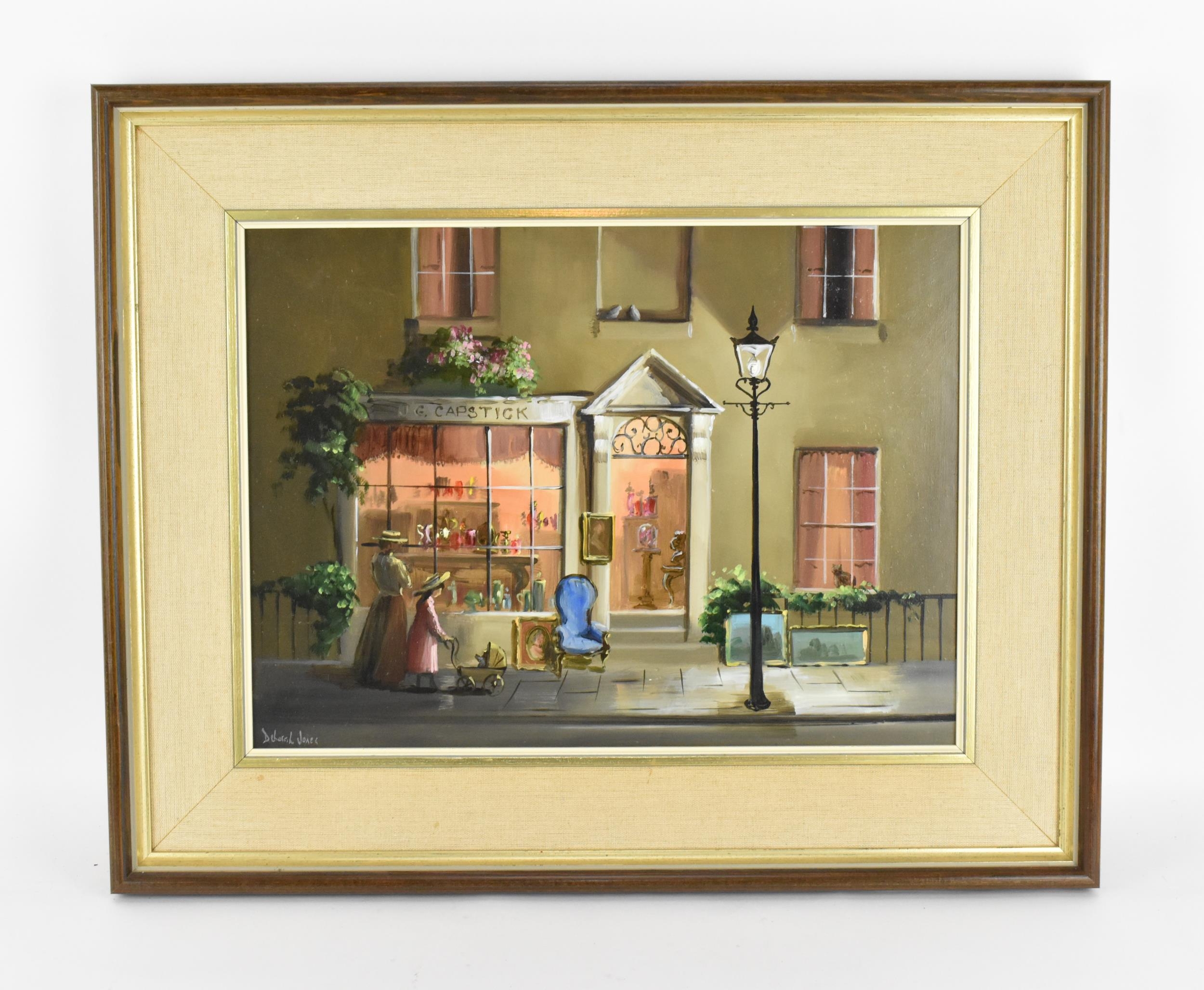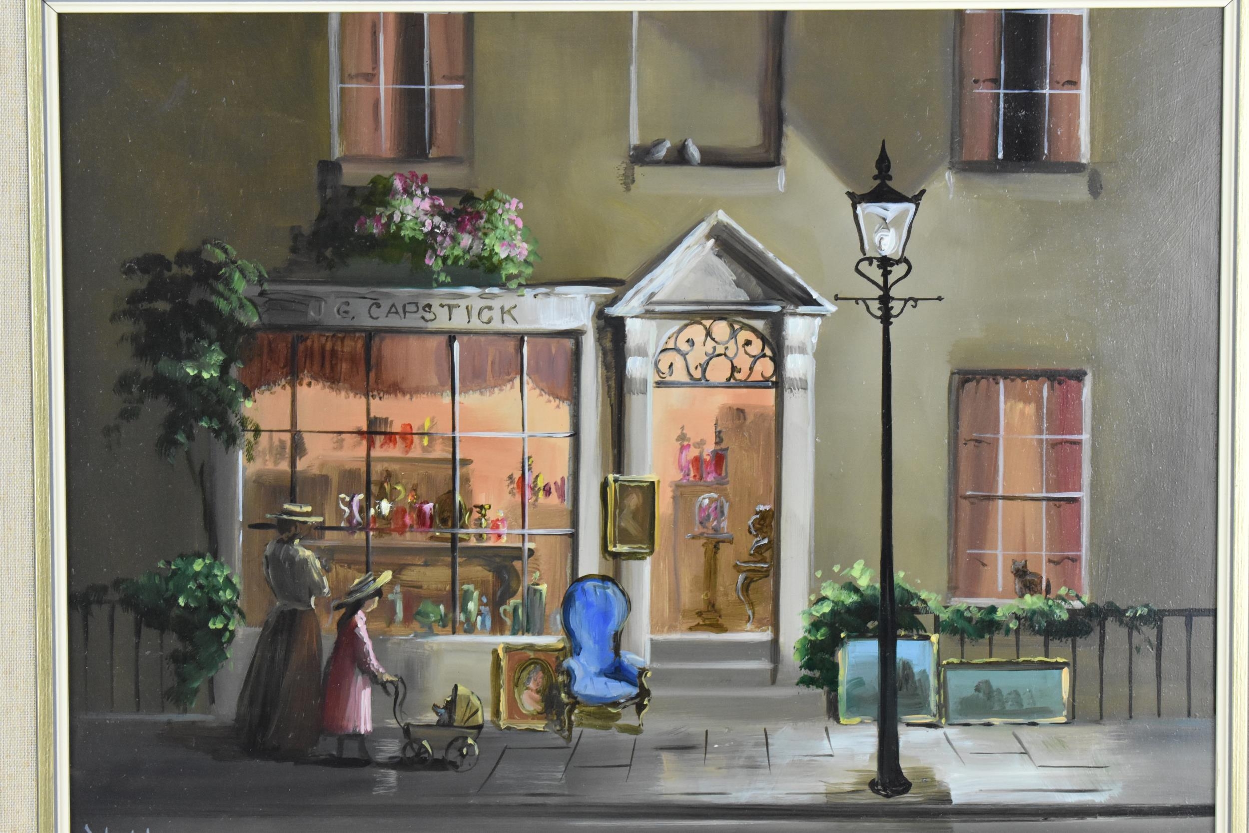 'JG Capstick', depicting an antique shop entrance on a street, signed lower left, oil on board, 28.5 cm x 39 cm, within a wooden and partial gilt frame