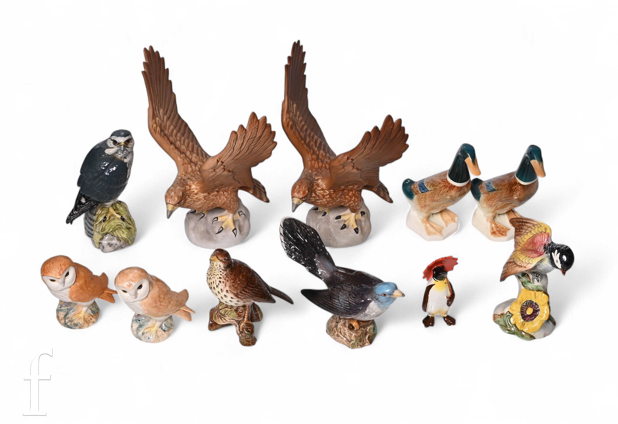A collection of Beswick bird figures, to include a Merlin Beneagles whisky flask, height 17cm, Golden Eagle, Jay, Song Thrush, Owl, and Mallard. (10)