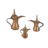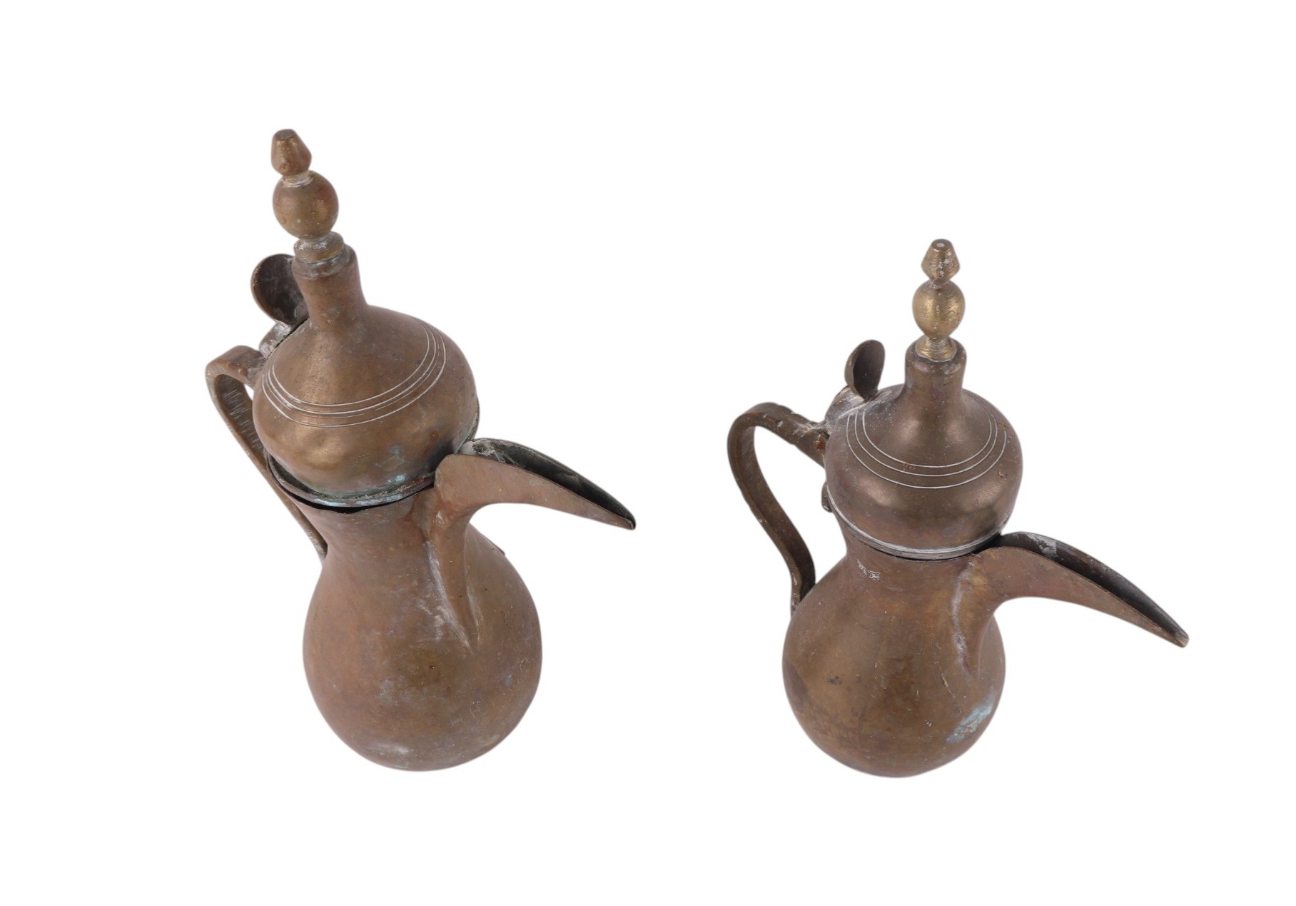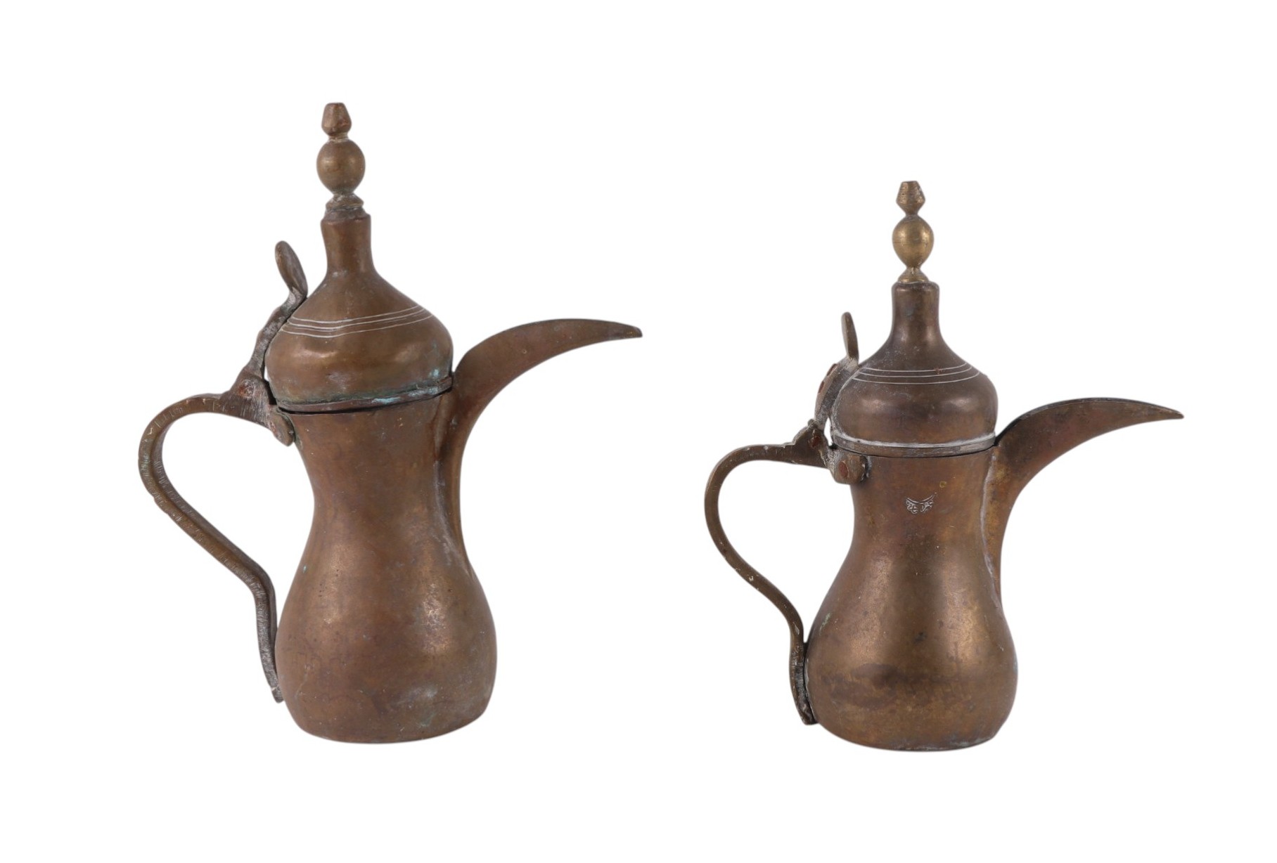 A brass Turkish / Islamic dallah / coffee pot, 25cm high, and another similar 22cm high (2).