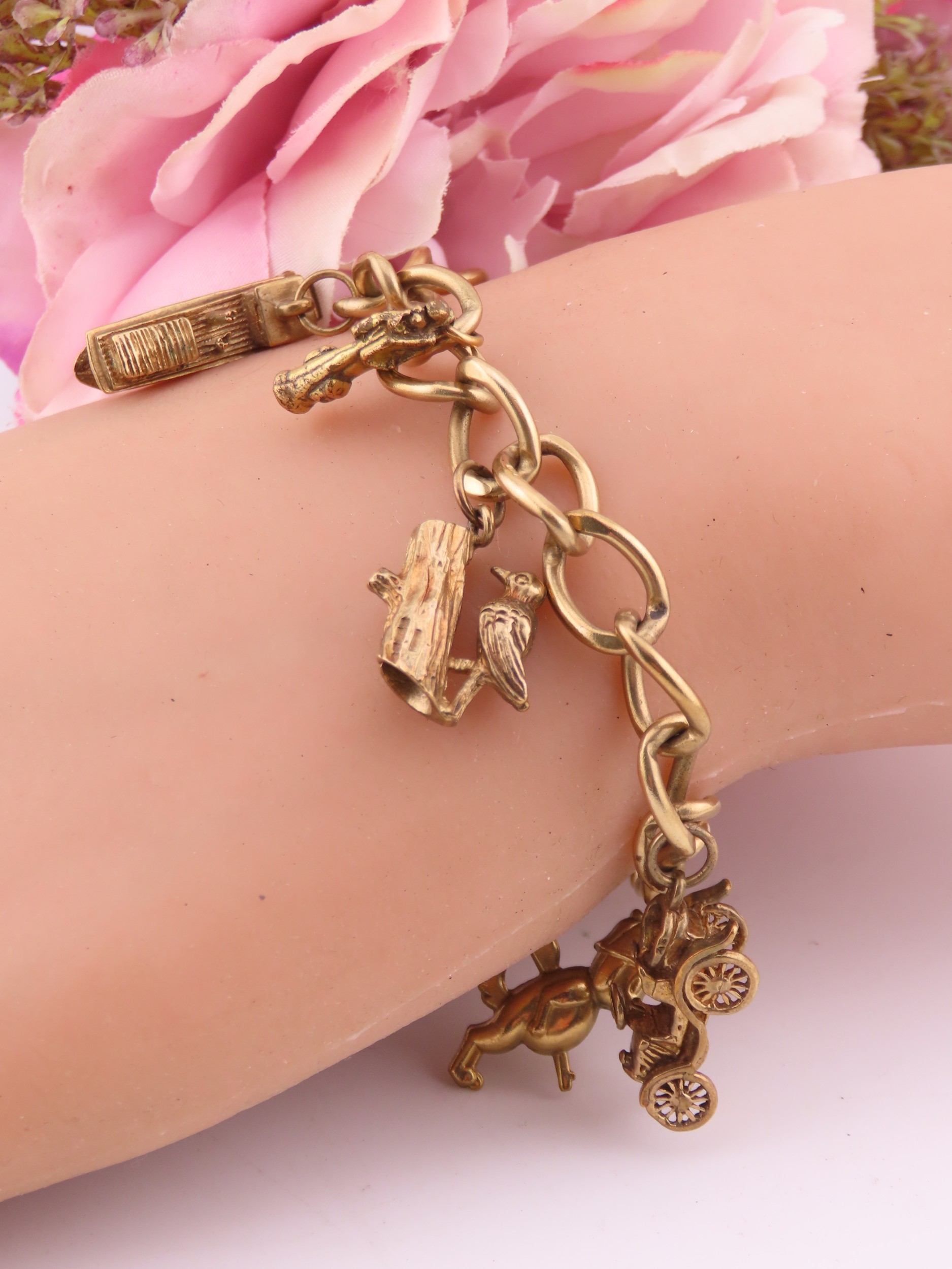 A 9 carat gold charm bracelet, composed of a curb link chain fitted with a padlock clasp and suspending seven assorted gold charms. Gross weight approximately 37.3 grams.