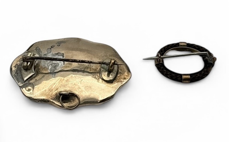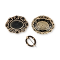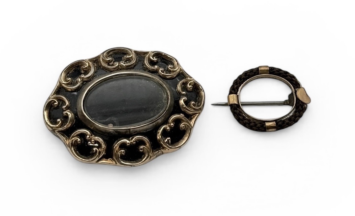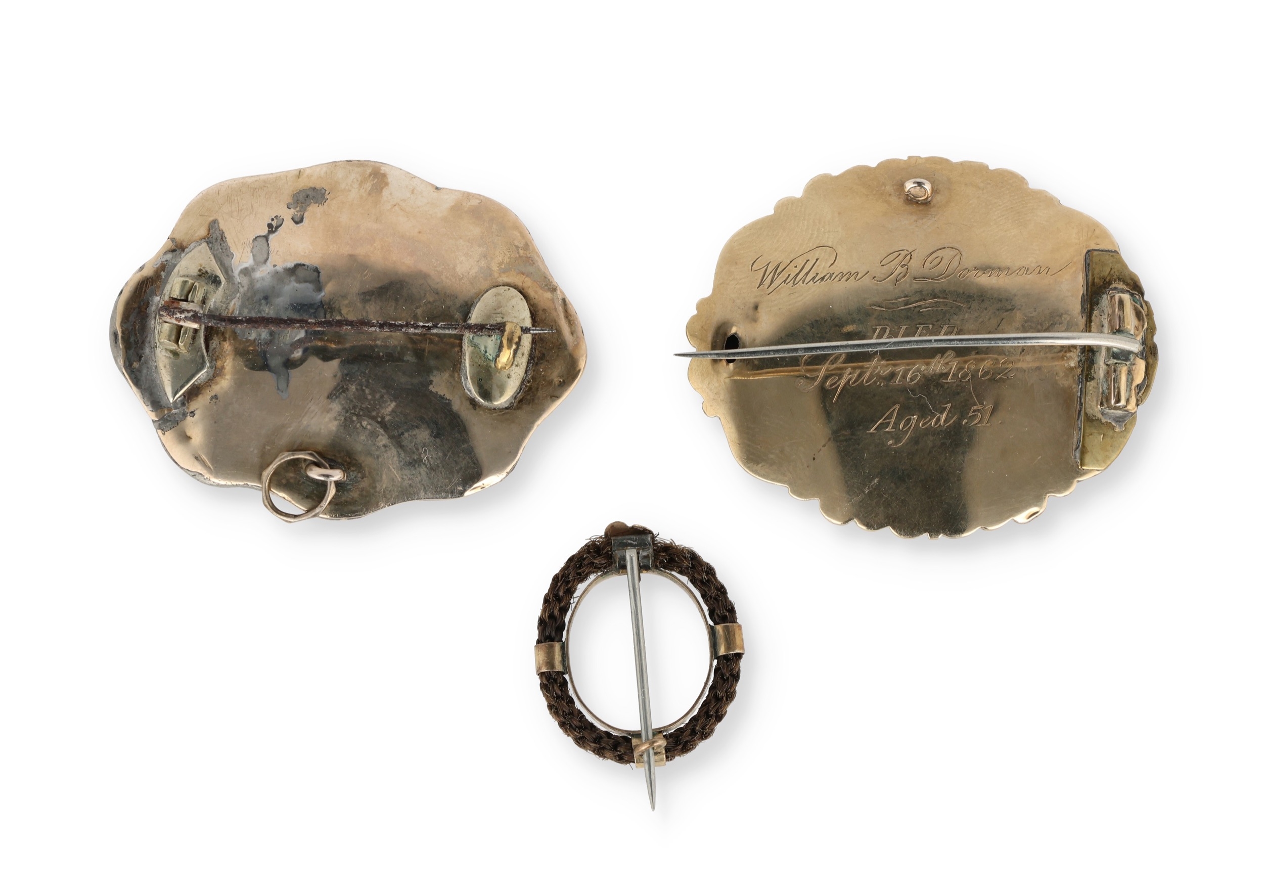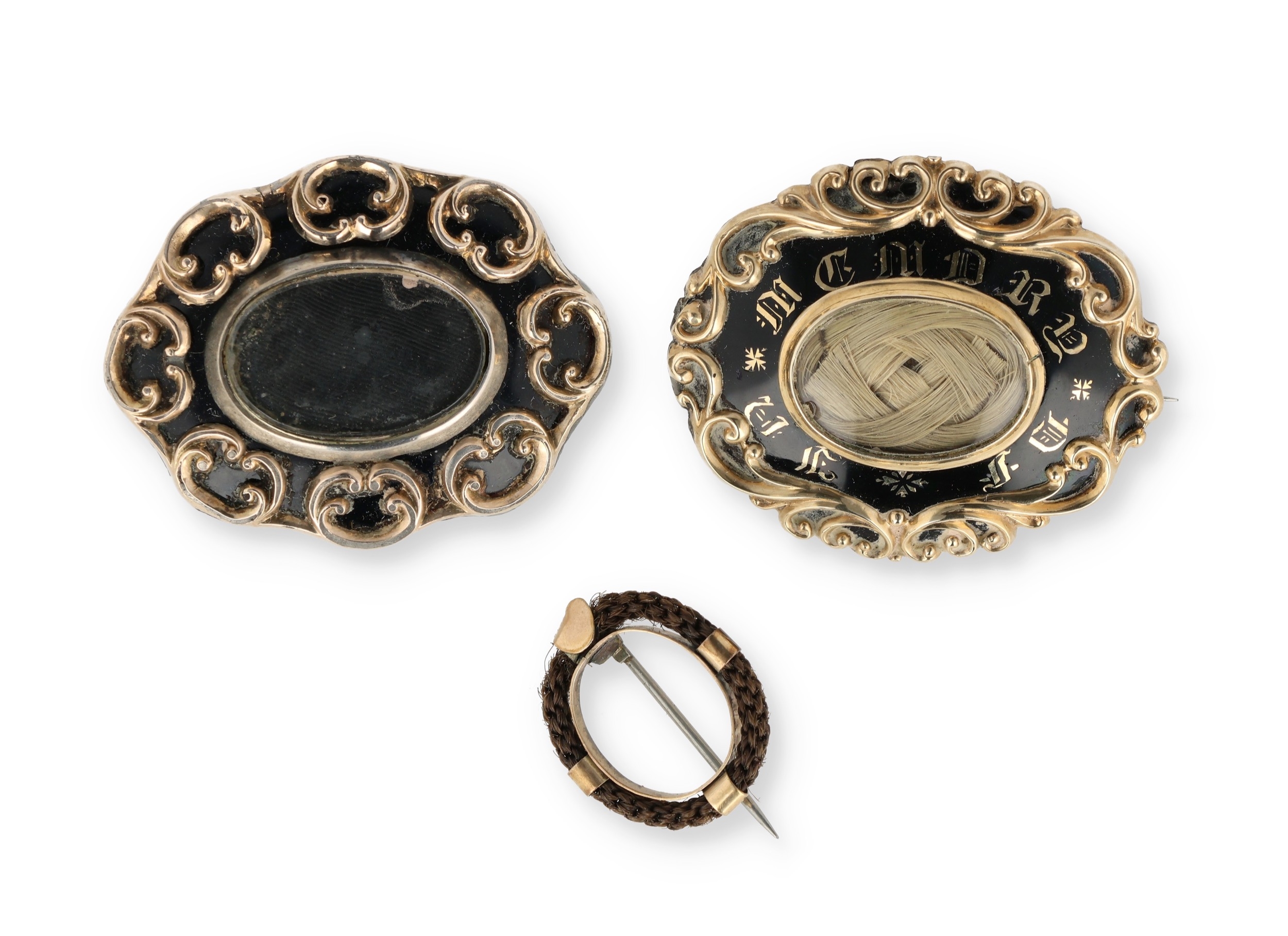 A VICTORIAN MEMEMTO MORI GOLD AND BLACK ENAMEL BROOCH, TOGETHER WITH A SIMILAR GOLD PLATED MOURNING BROOCH AND A GOLD MOUNTED HUMAN HAIR BROOCH