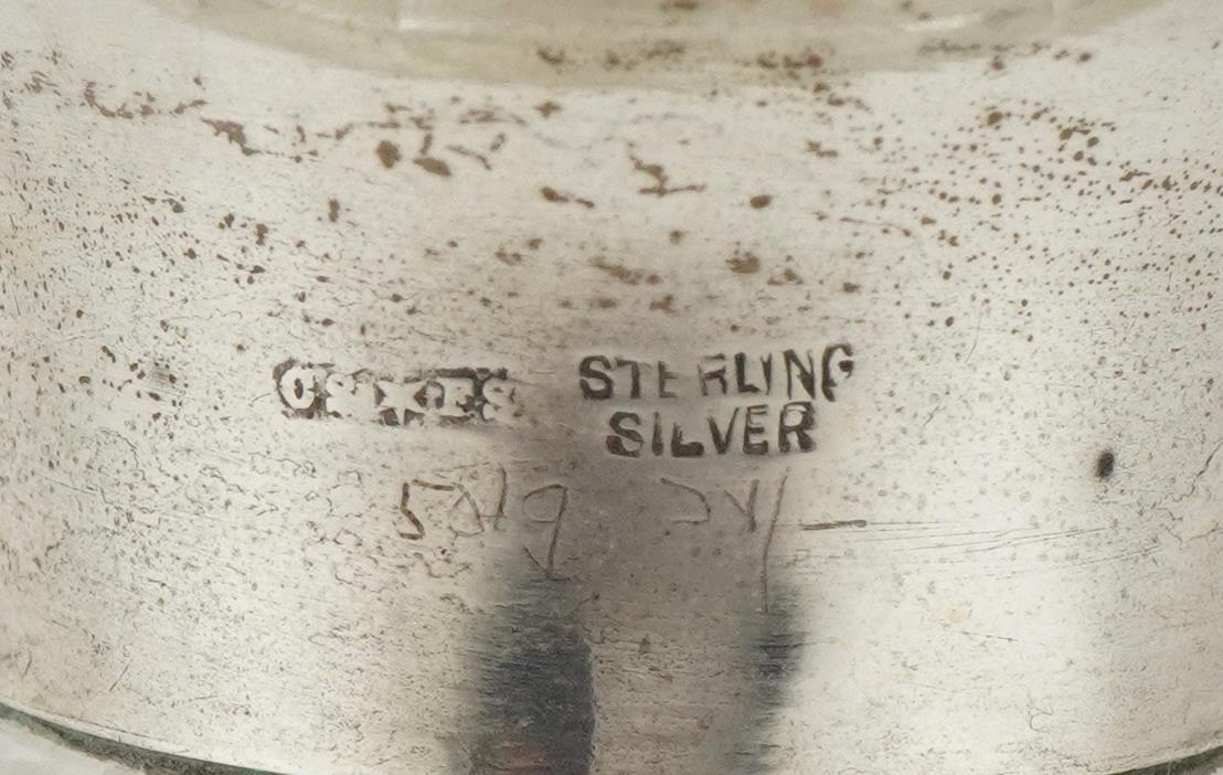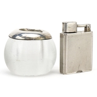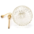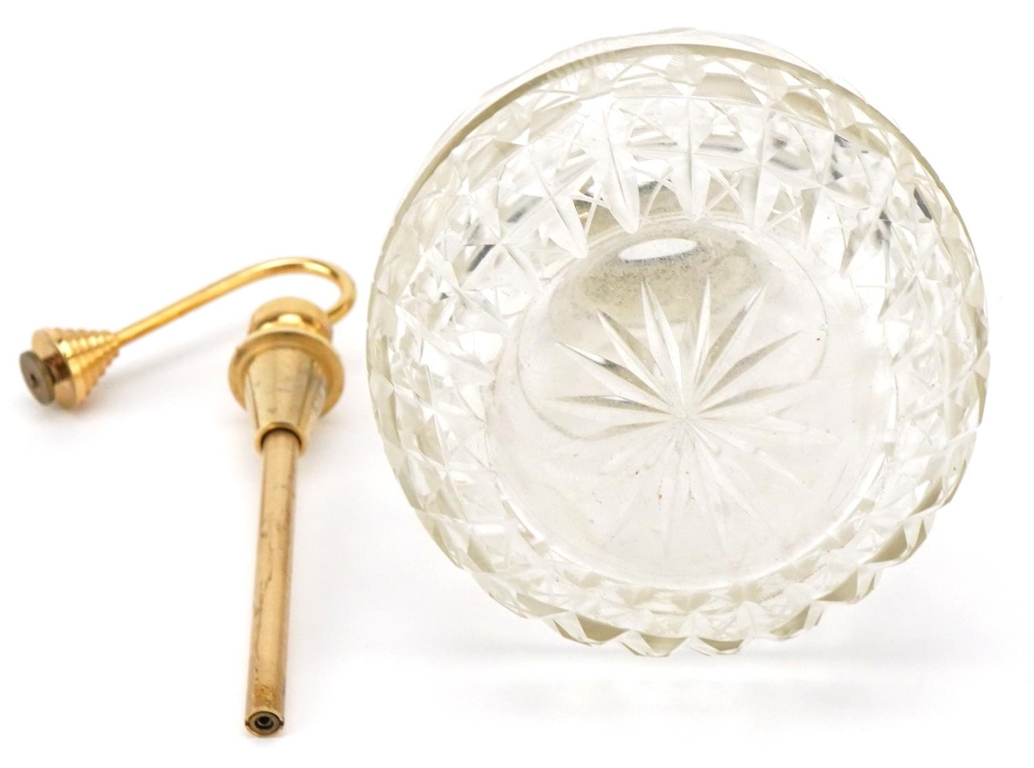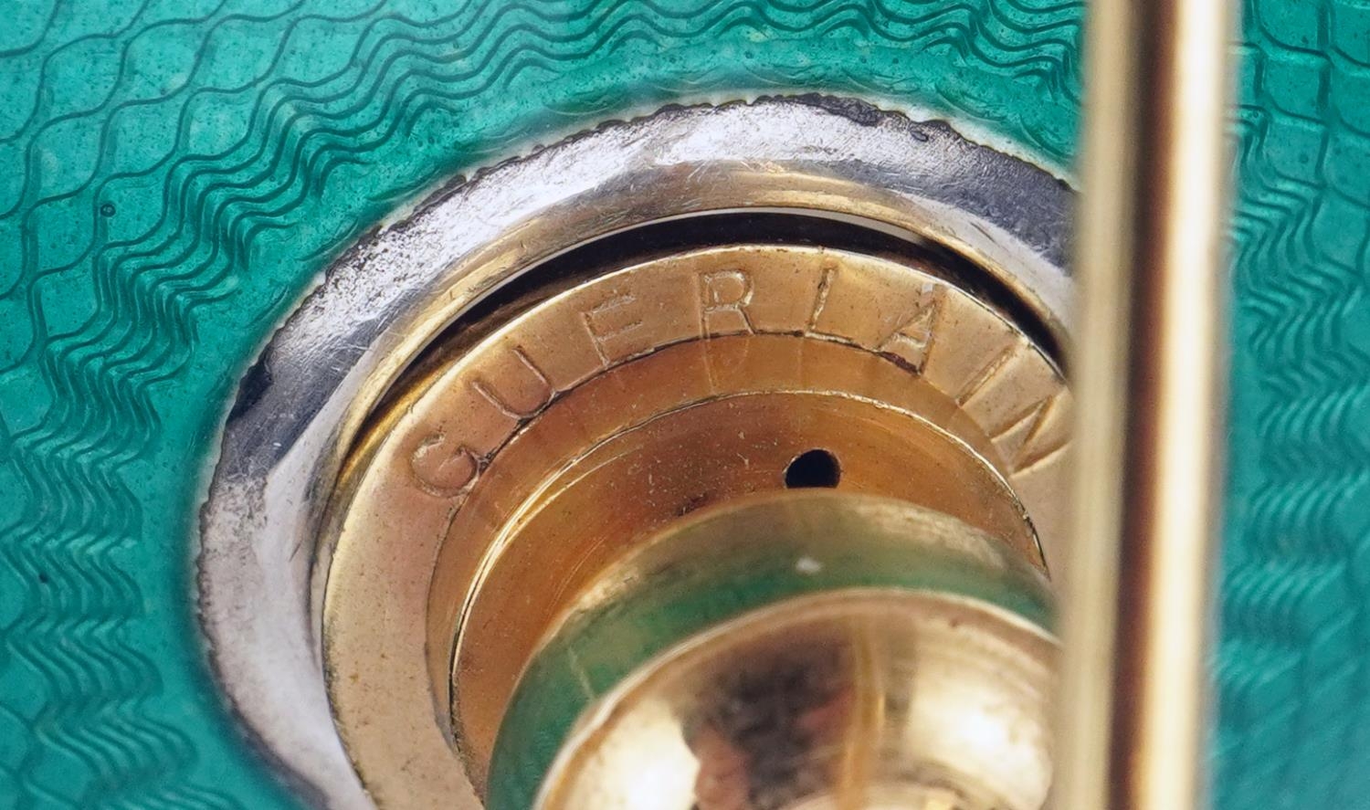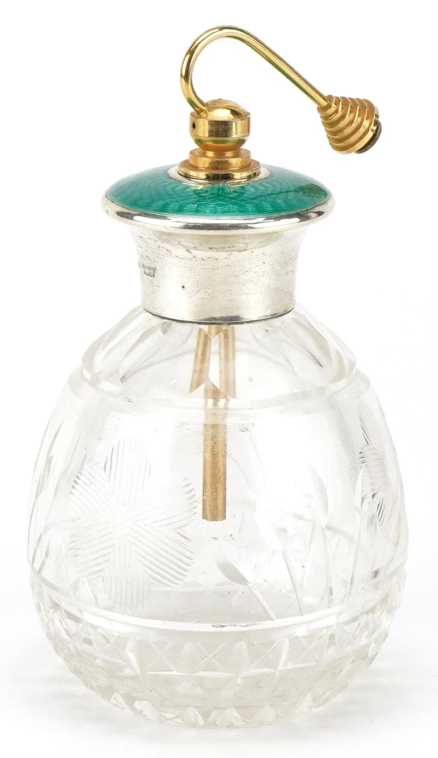 An Art Deco glass atomiser with sterling silver and green guilloche enamel lid, 13cm high.