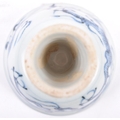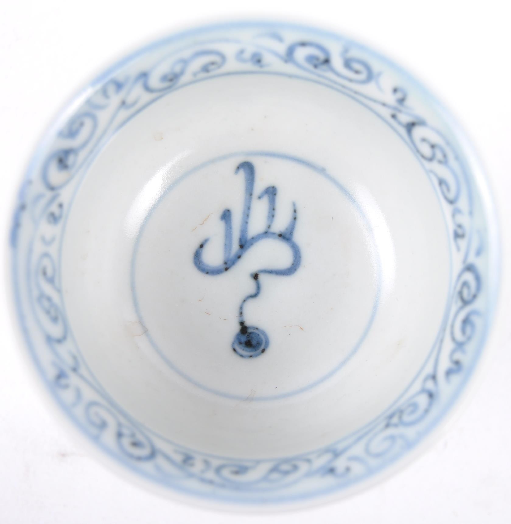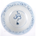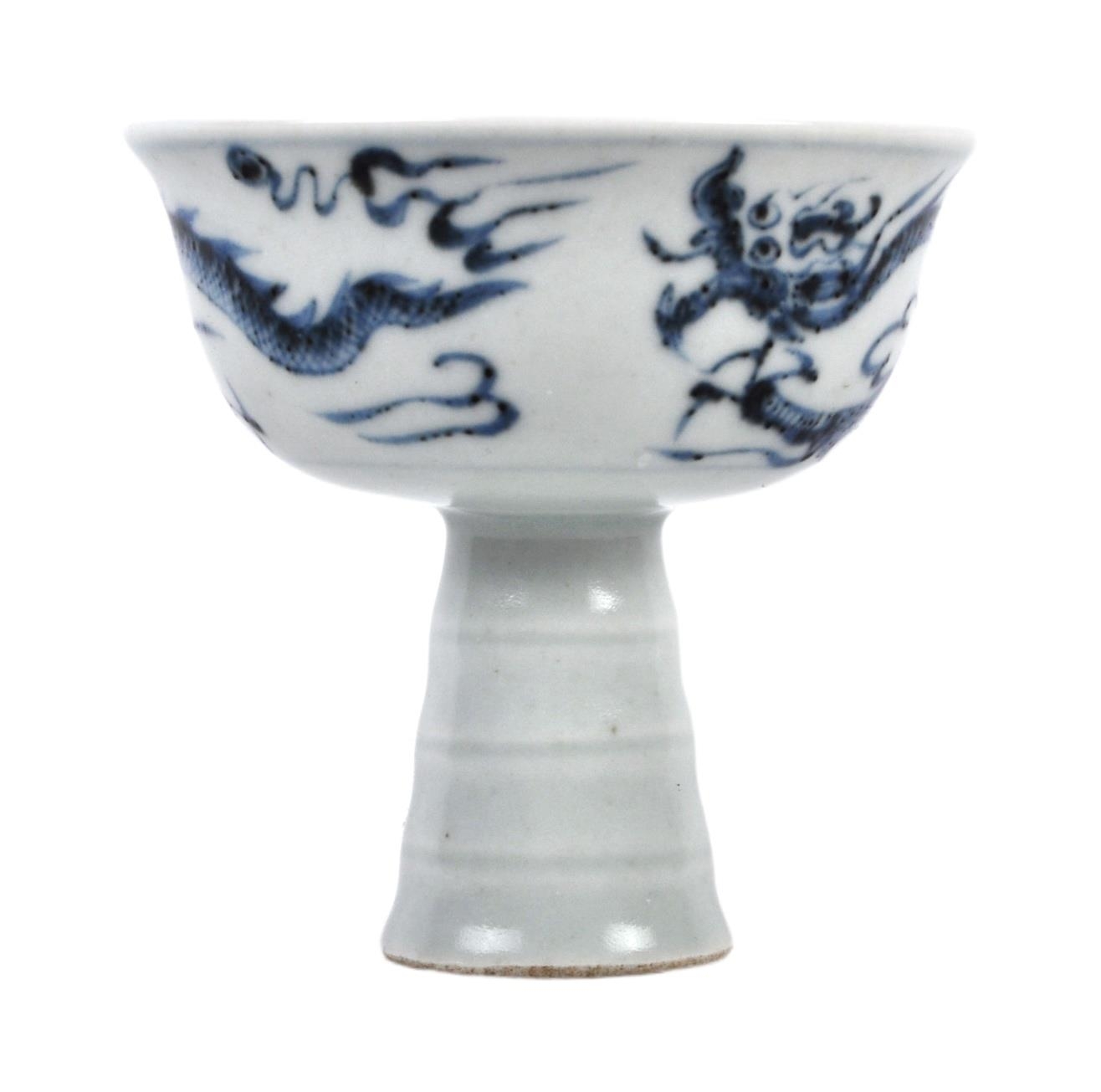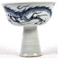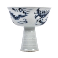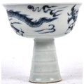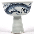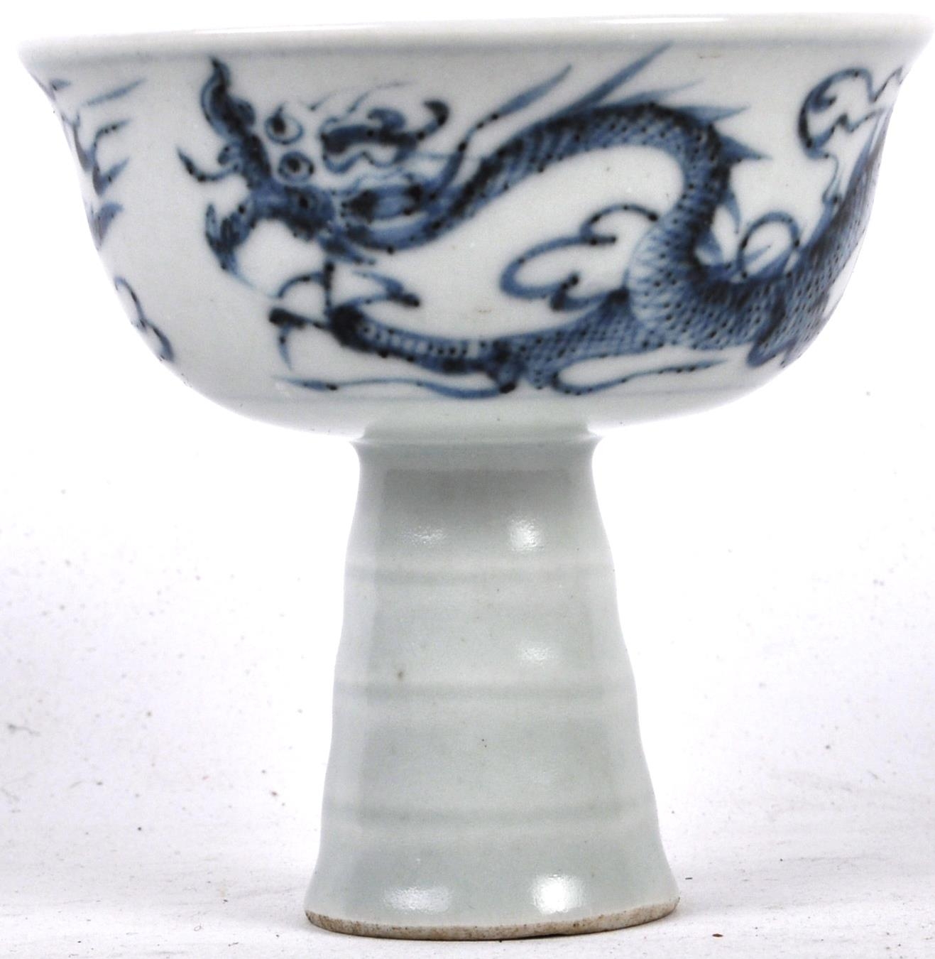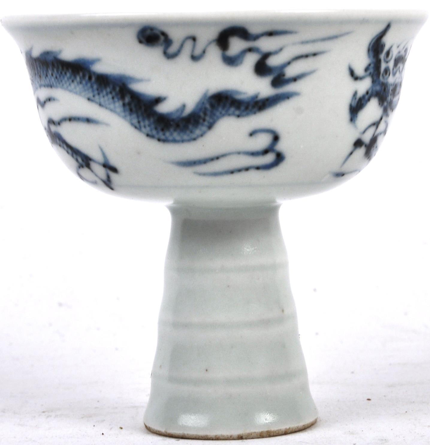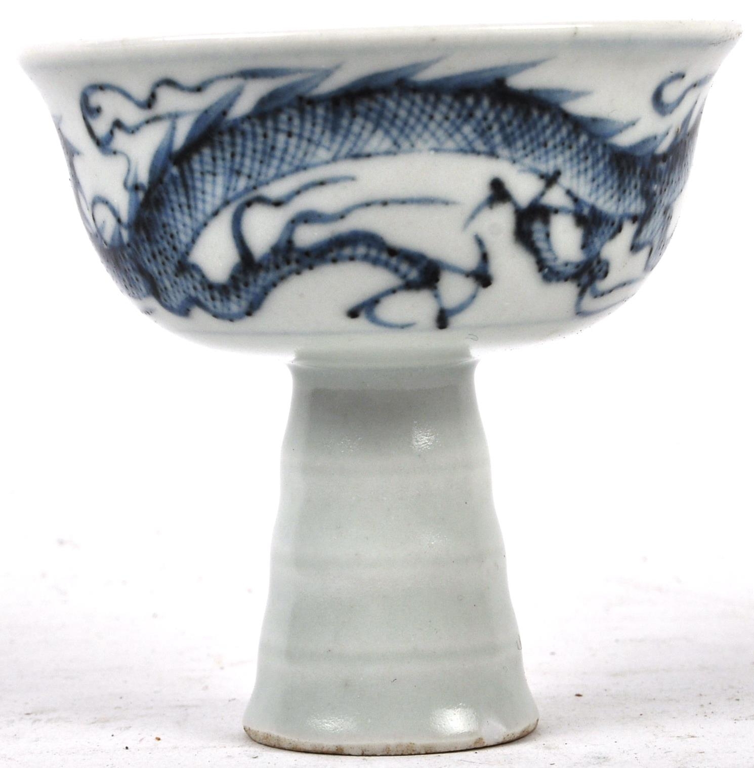 A 20th Century Chinese blue & white porcelain footed pedestal bowl. Hand painted decoration depicting dragons to he exterior with central flawing pearl to inside of bowl. Measures approx; 9cm tall.