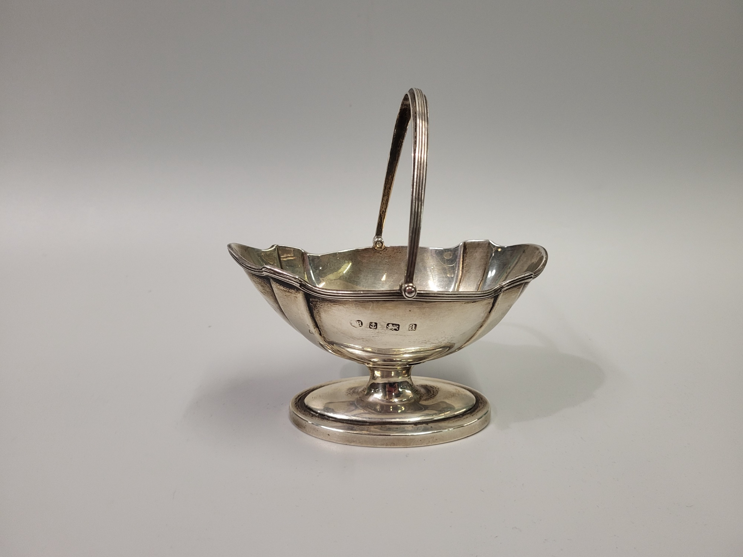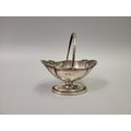 AN ATTRACTIVE ANTIQUE ENGLISH STERLING SILVER (.925) SWING HANDLED HELMET SHAPED BON BON DISH, over an oval stepped base, 142 g., Birmingham 1900