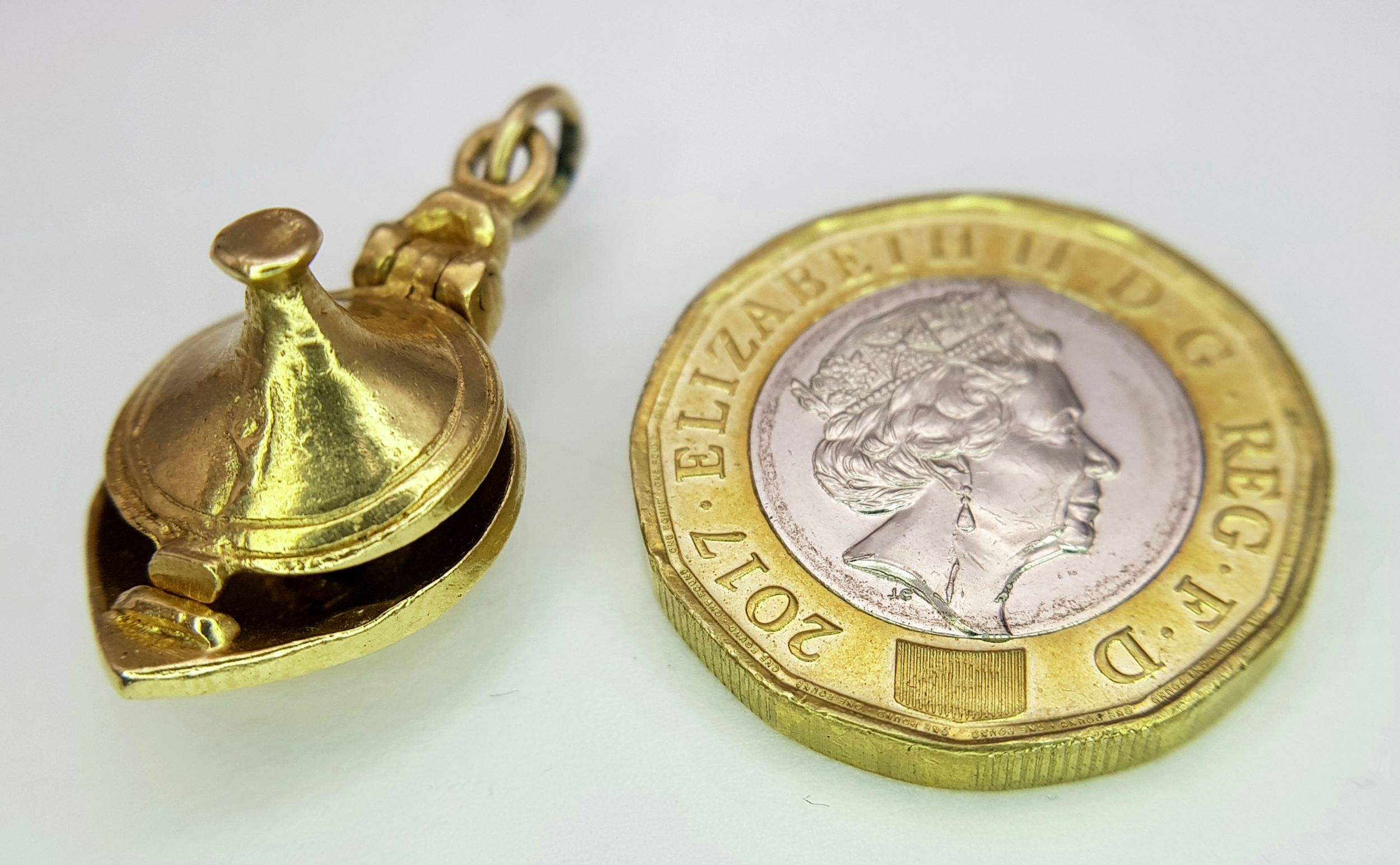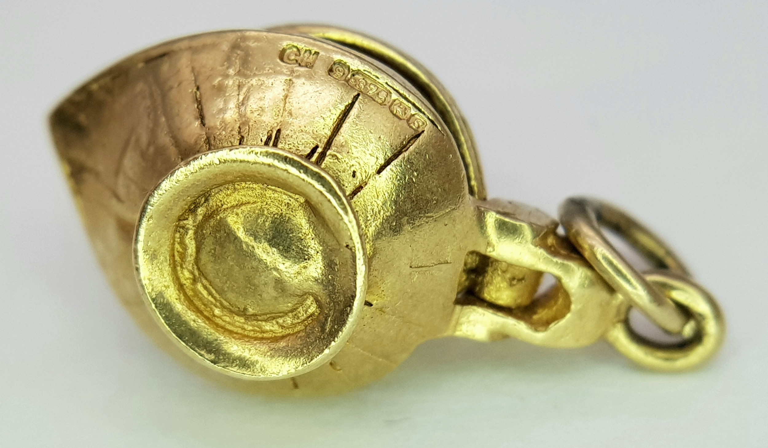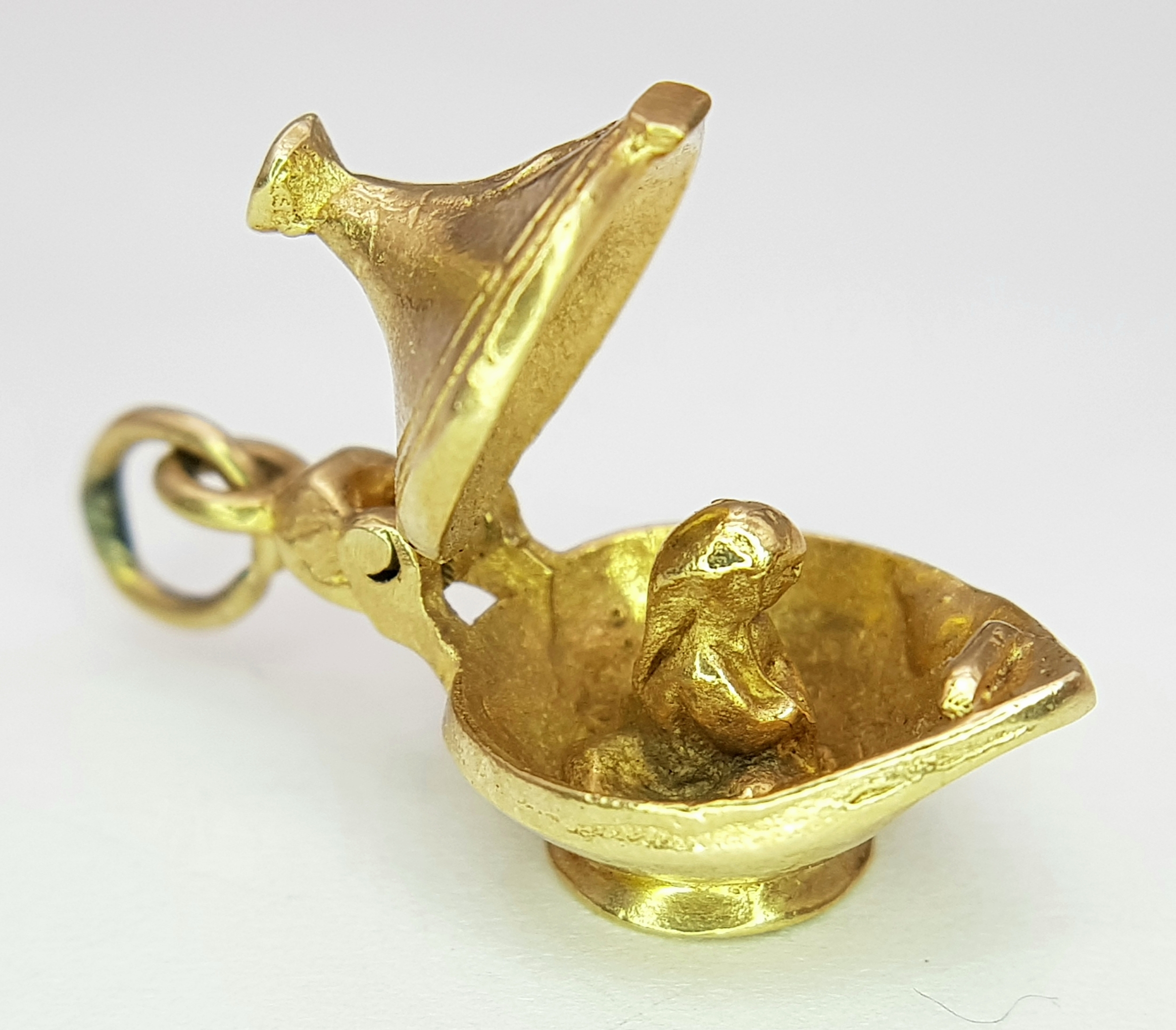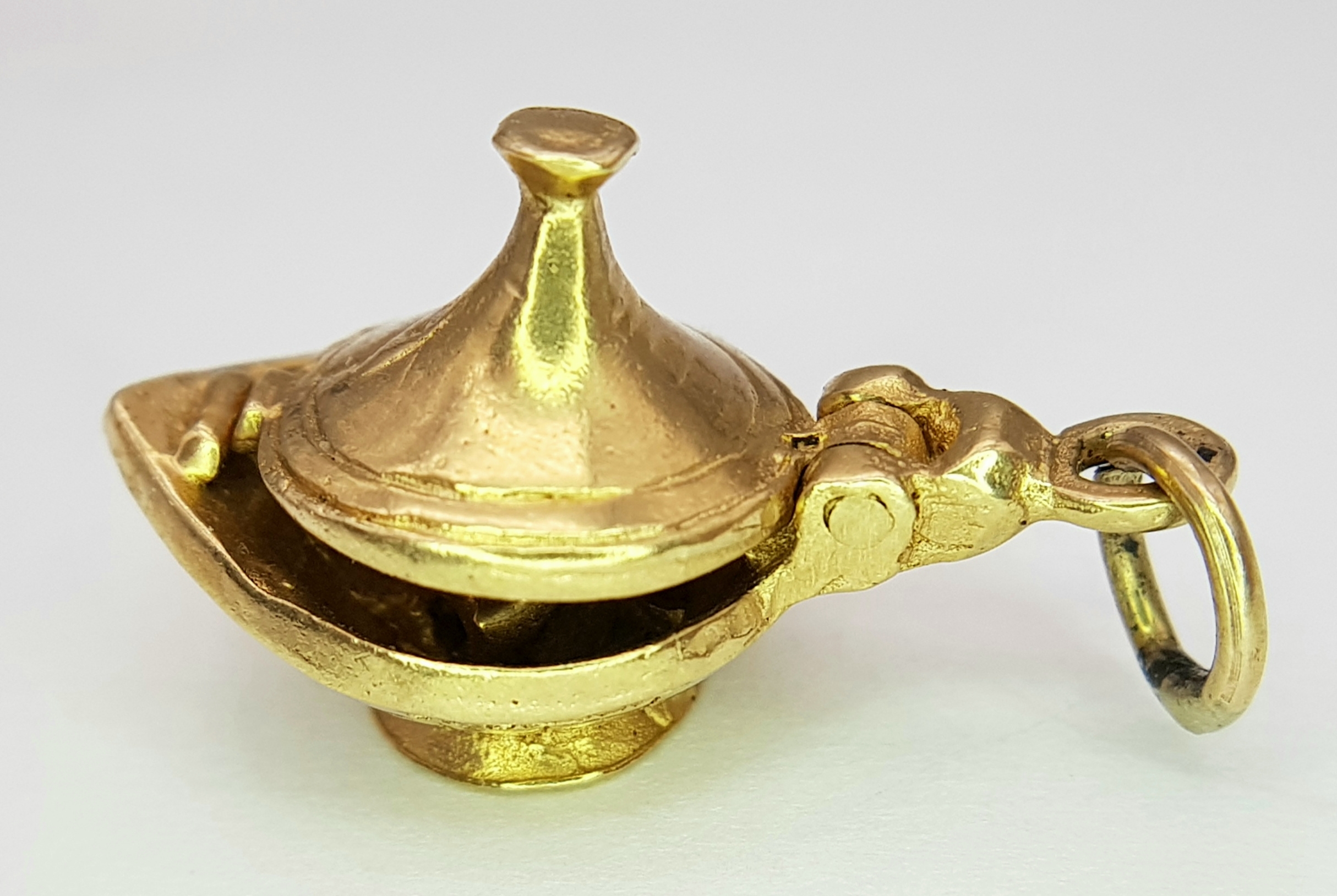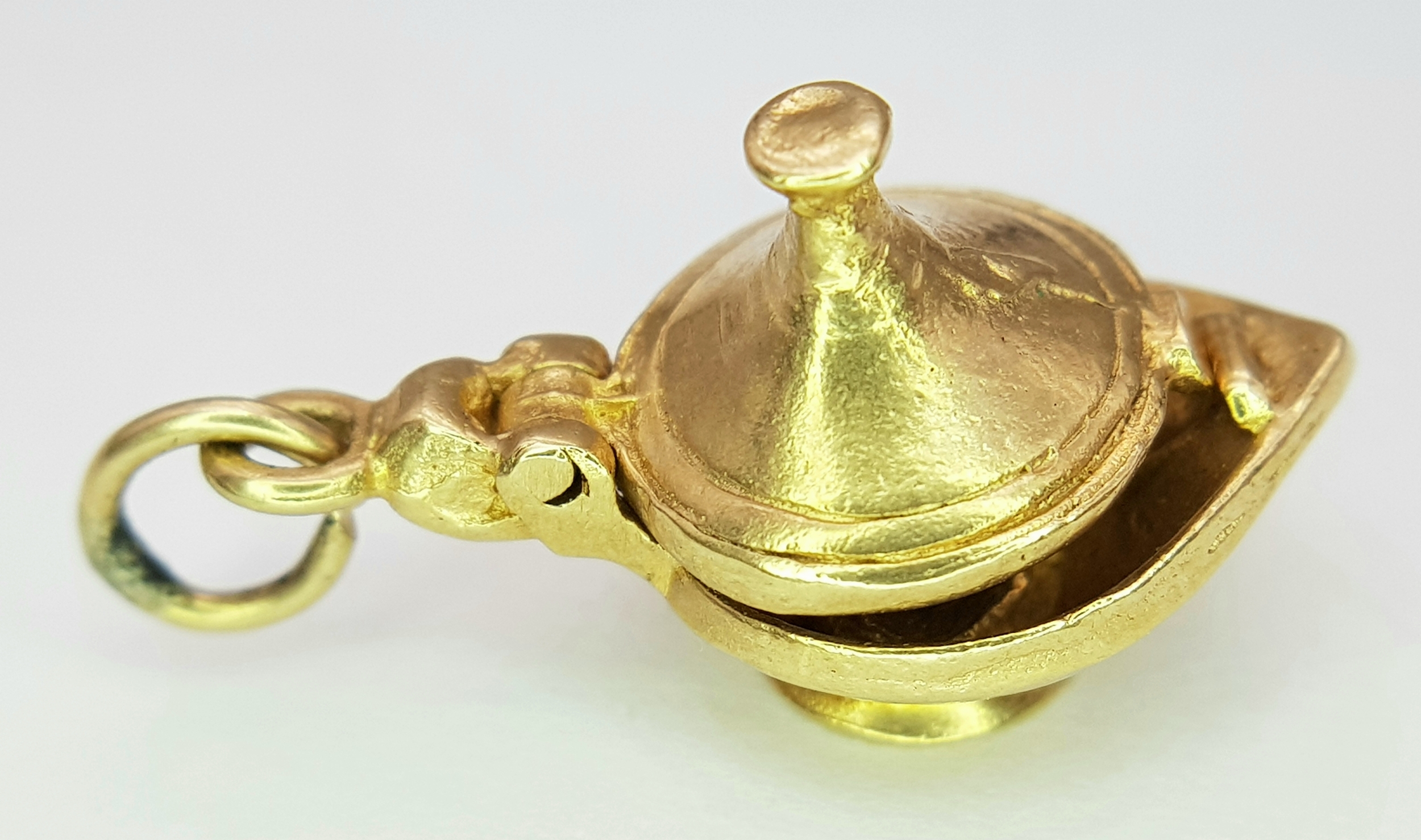 A 9k yellow gold Genie's magic lamp opening charm/pendant. 5.4g. SH2362I
