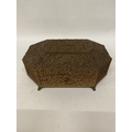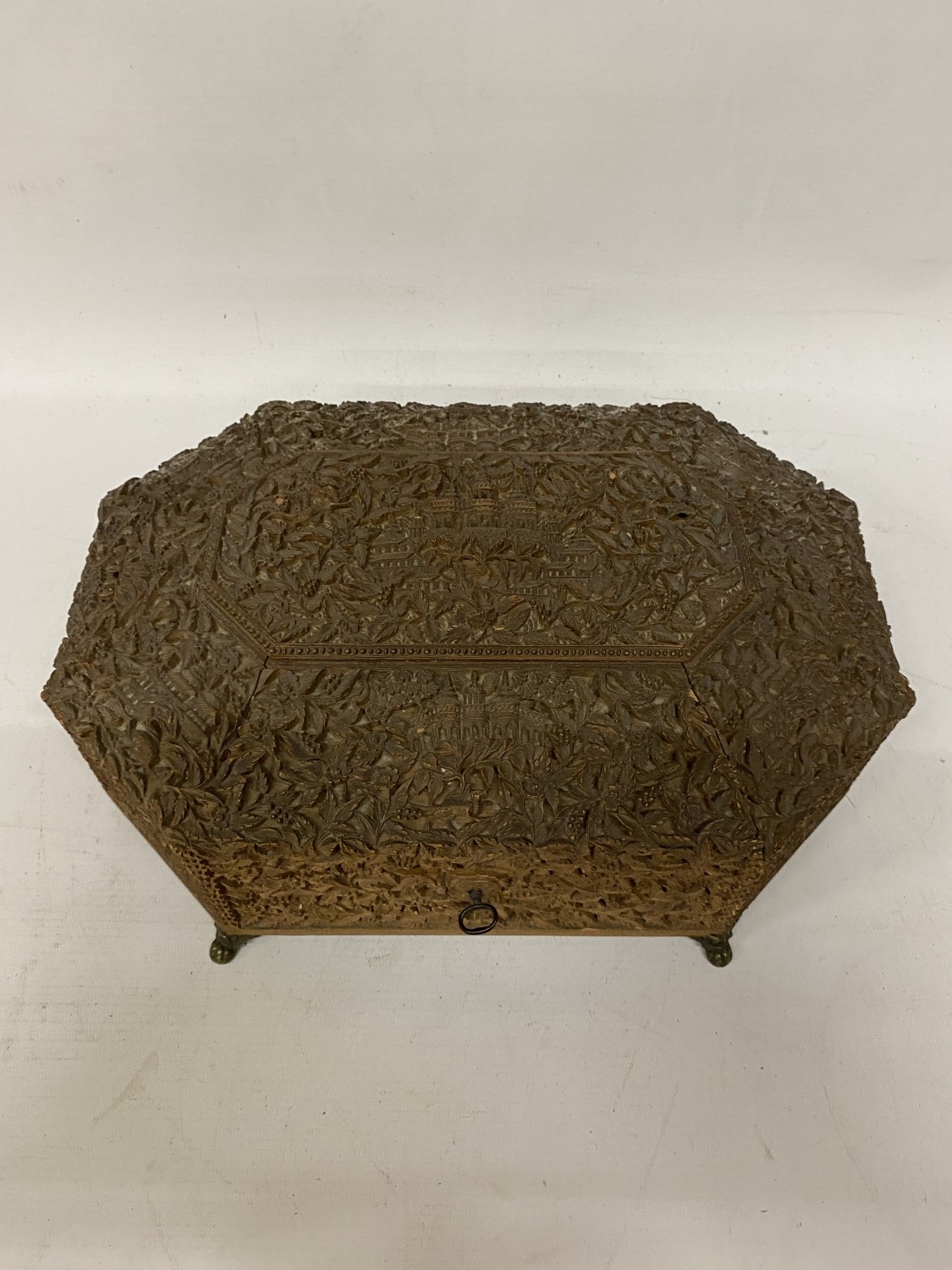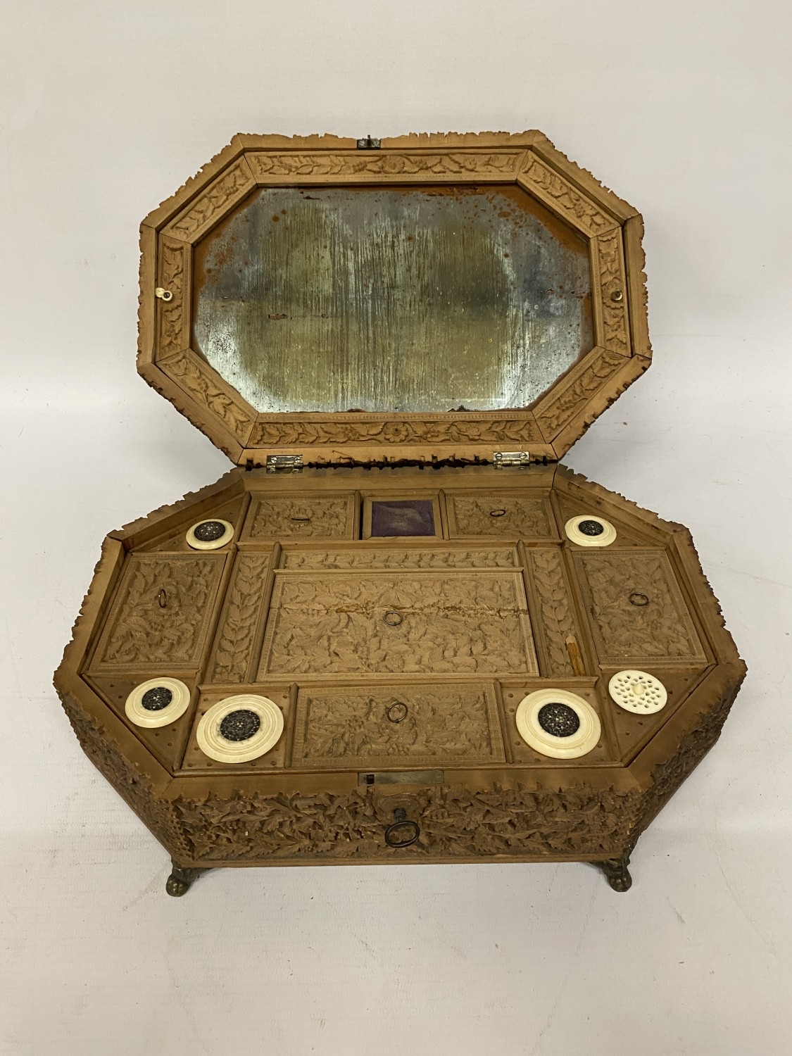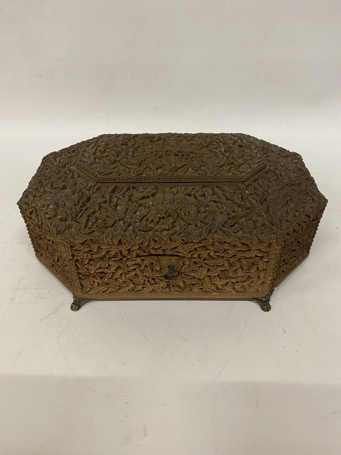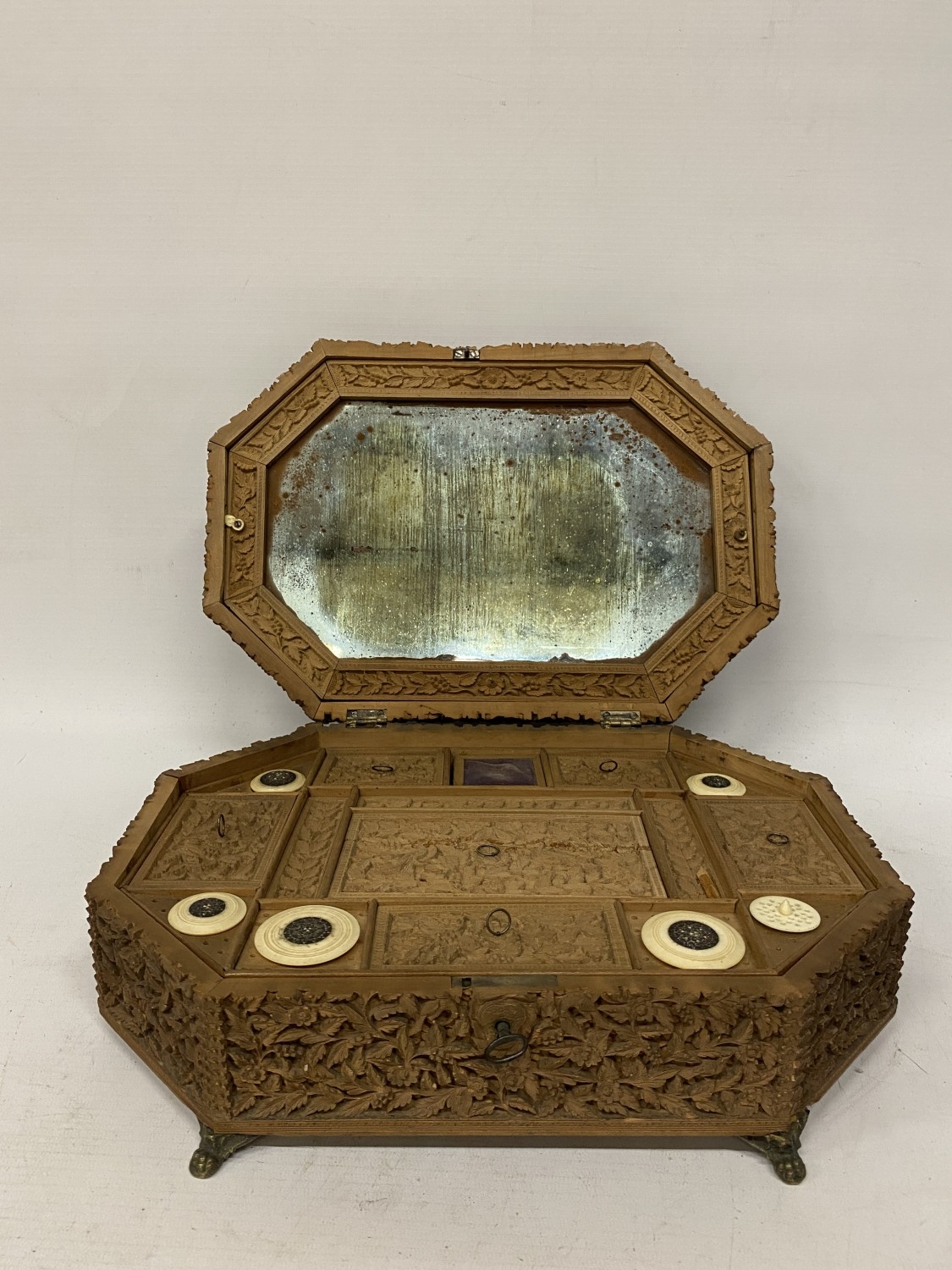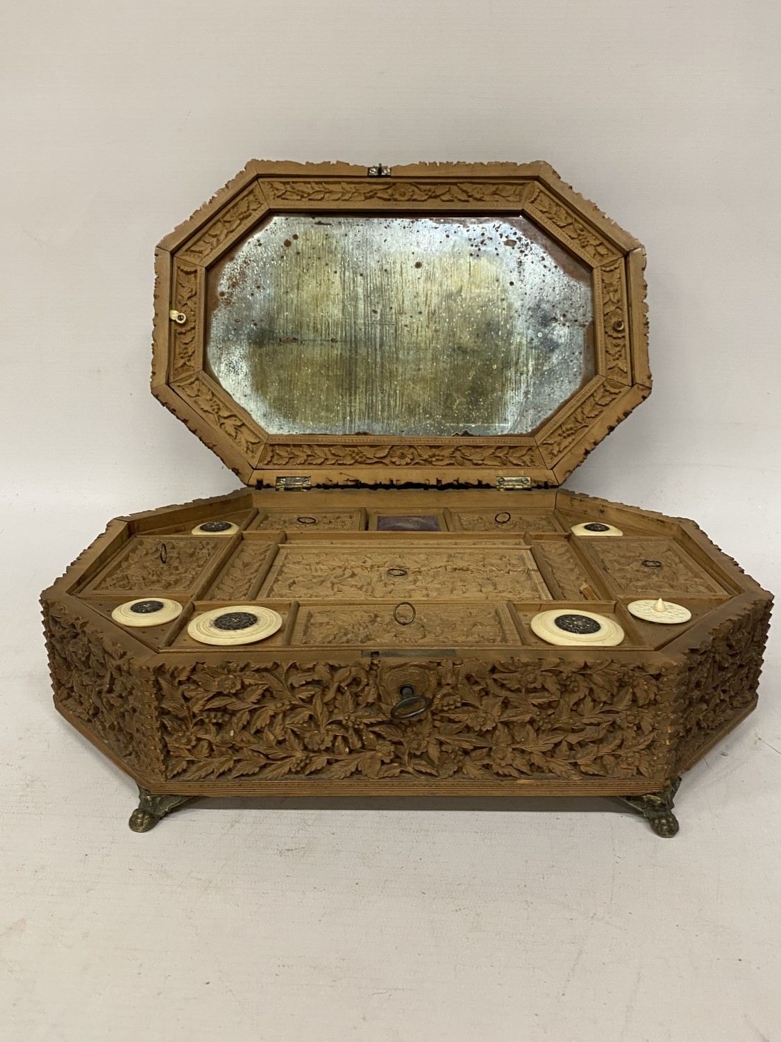 AN ANTIQUE CARVED CHINESE SEWING BOX WITH KEY