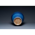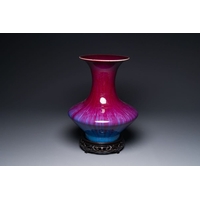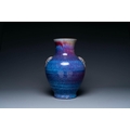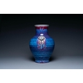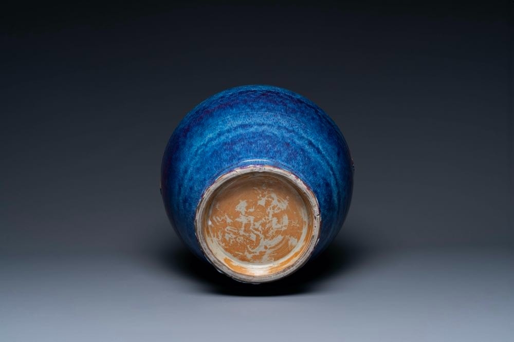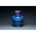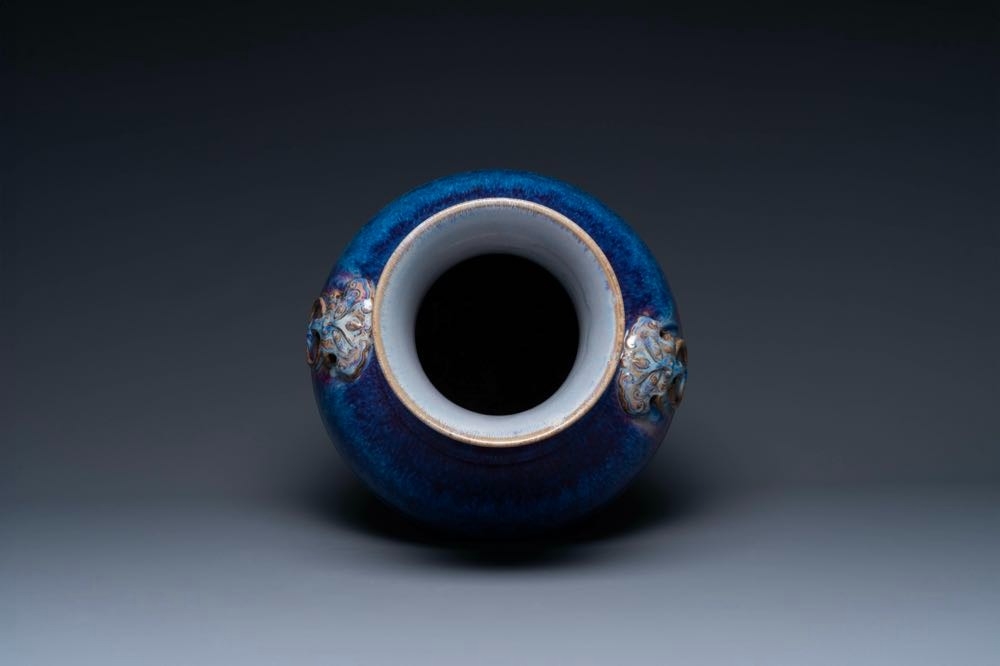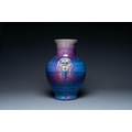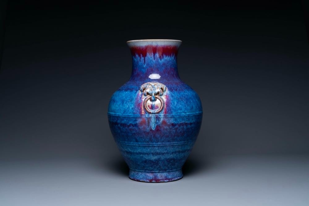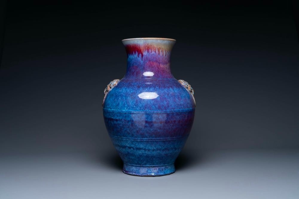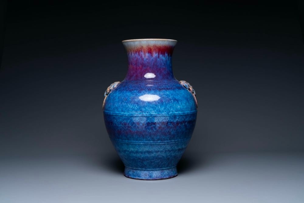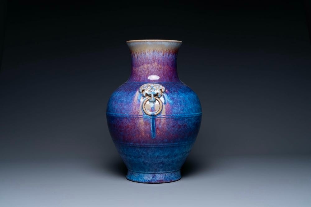 A large Chinese flambe glaze 'hu' vase with taotie handles, Qing