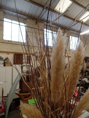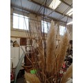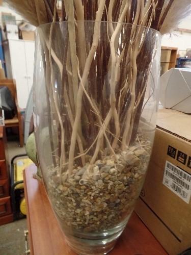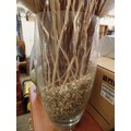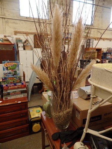 LARGE TALL GLASS VASE, FULL OF DECORATIVE TWIGS. PAMPAS GRASS ETC.