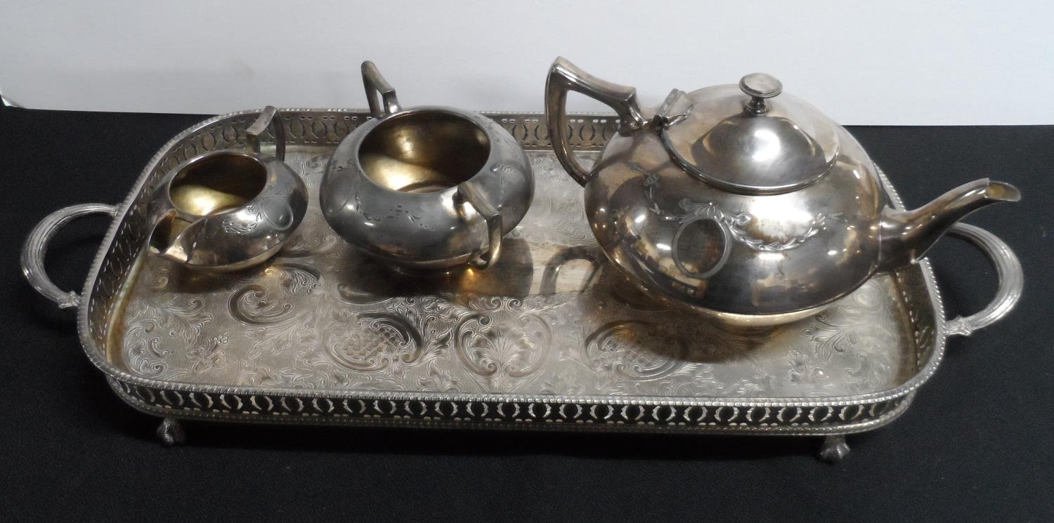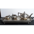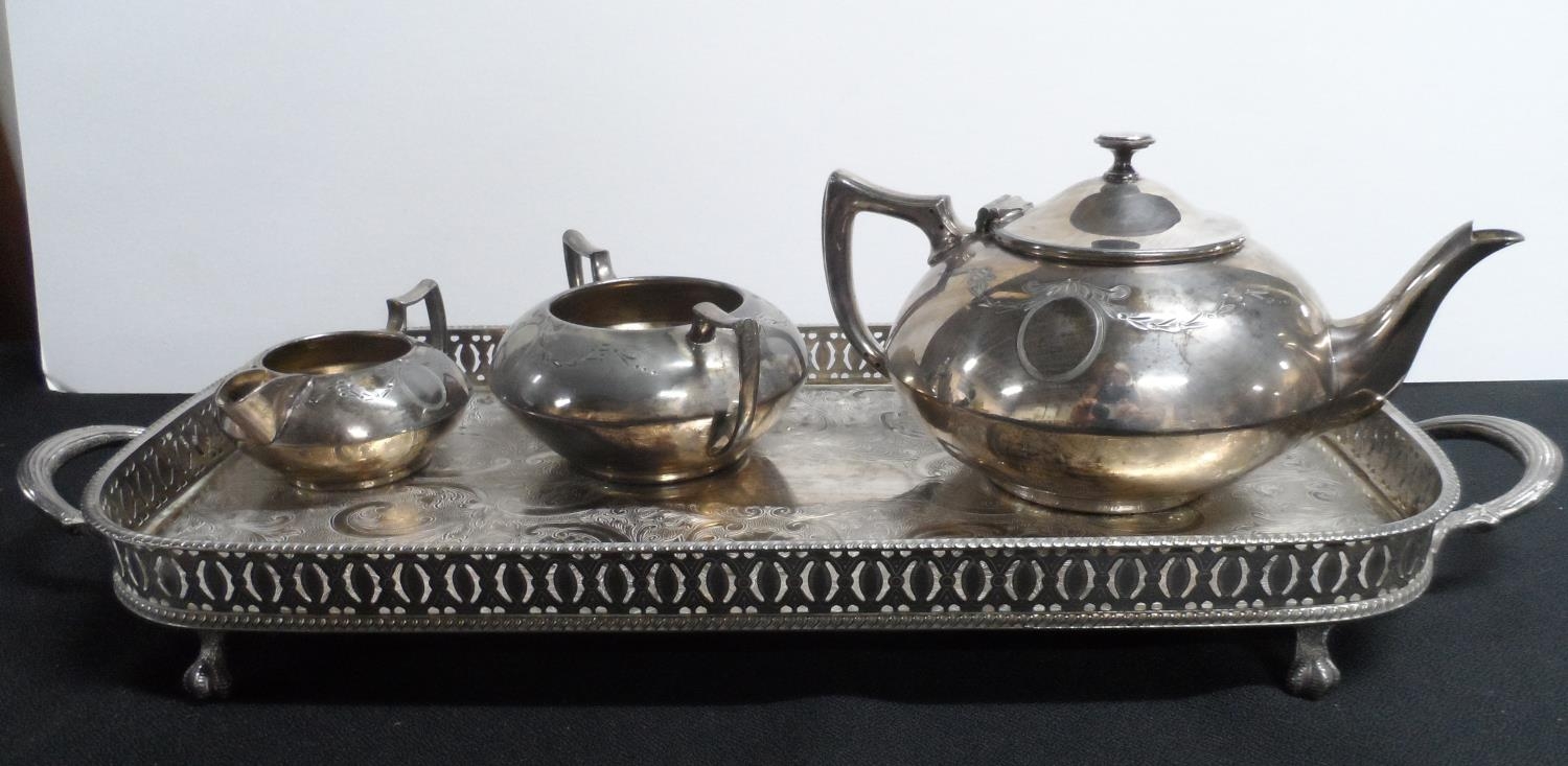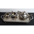 Fine quality 20thC engraved oval tray together with a 3 part plated tea service (4)