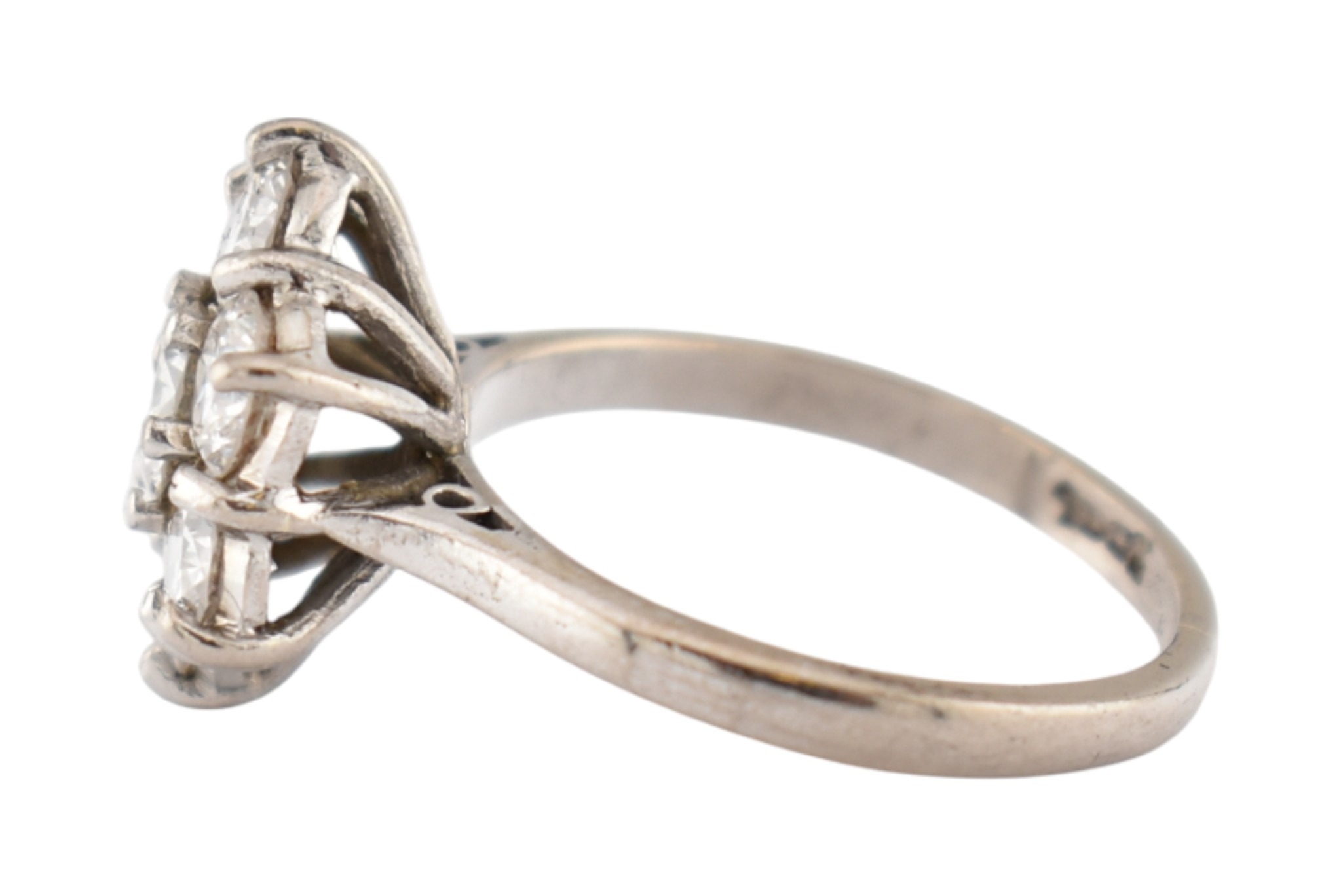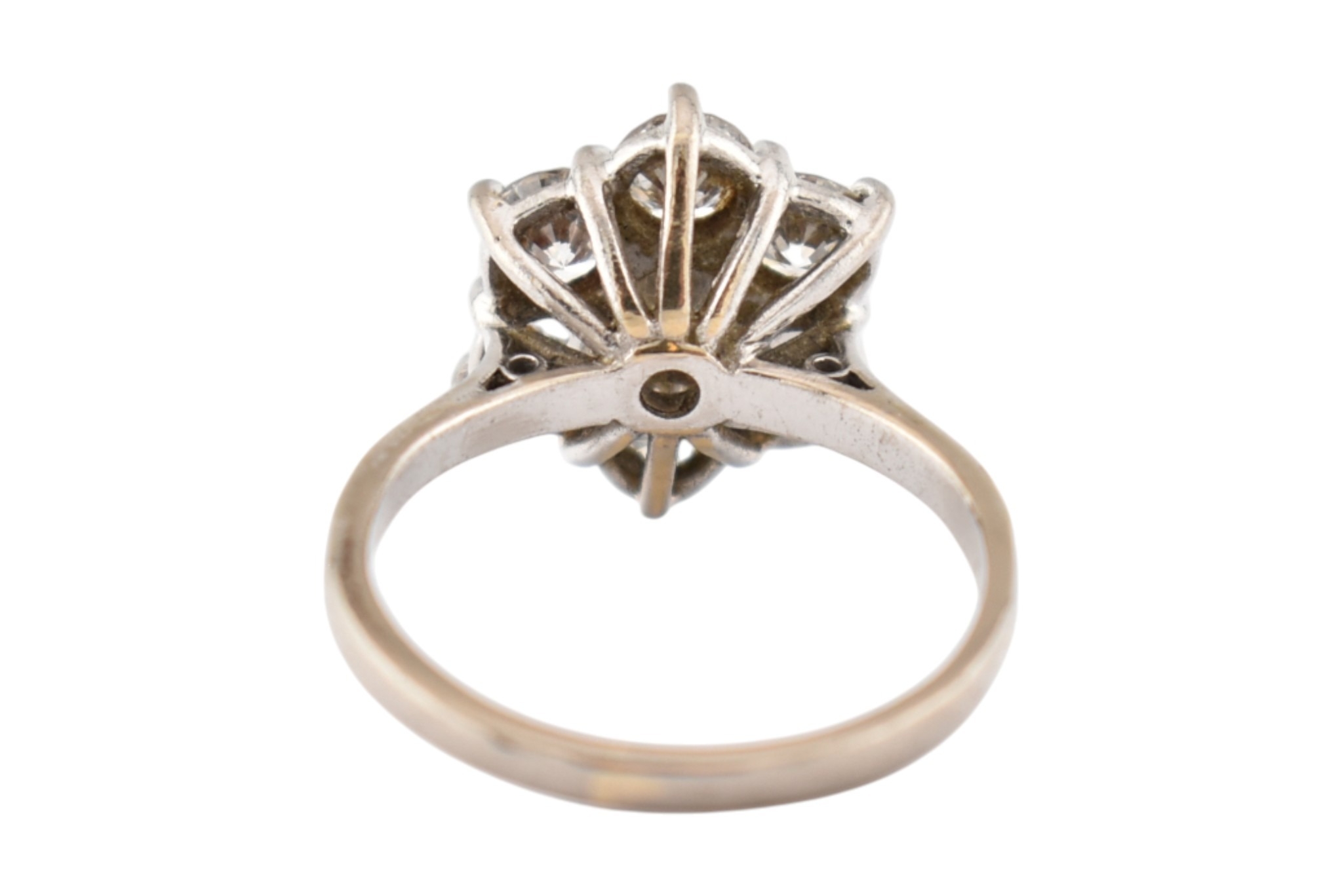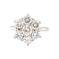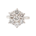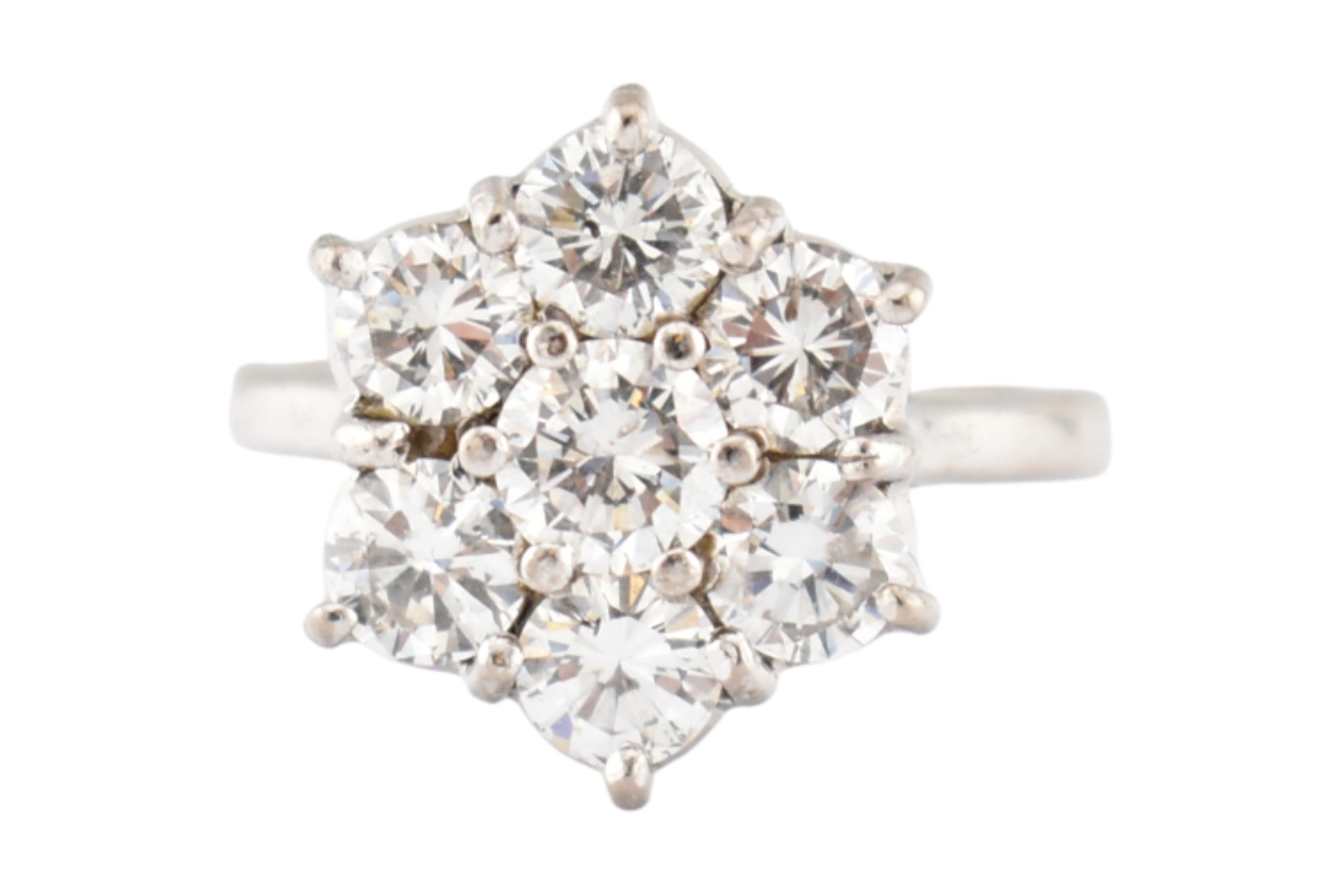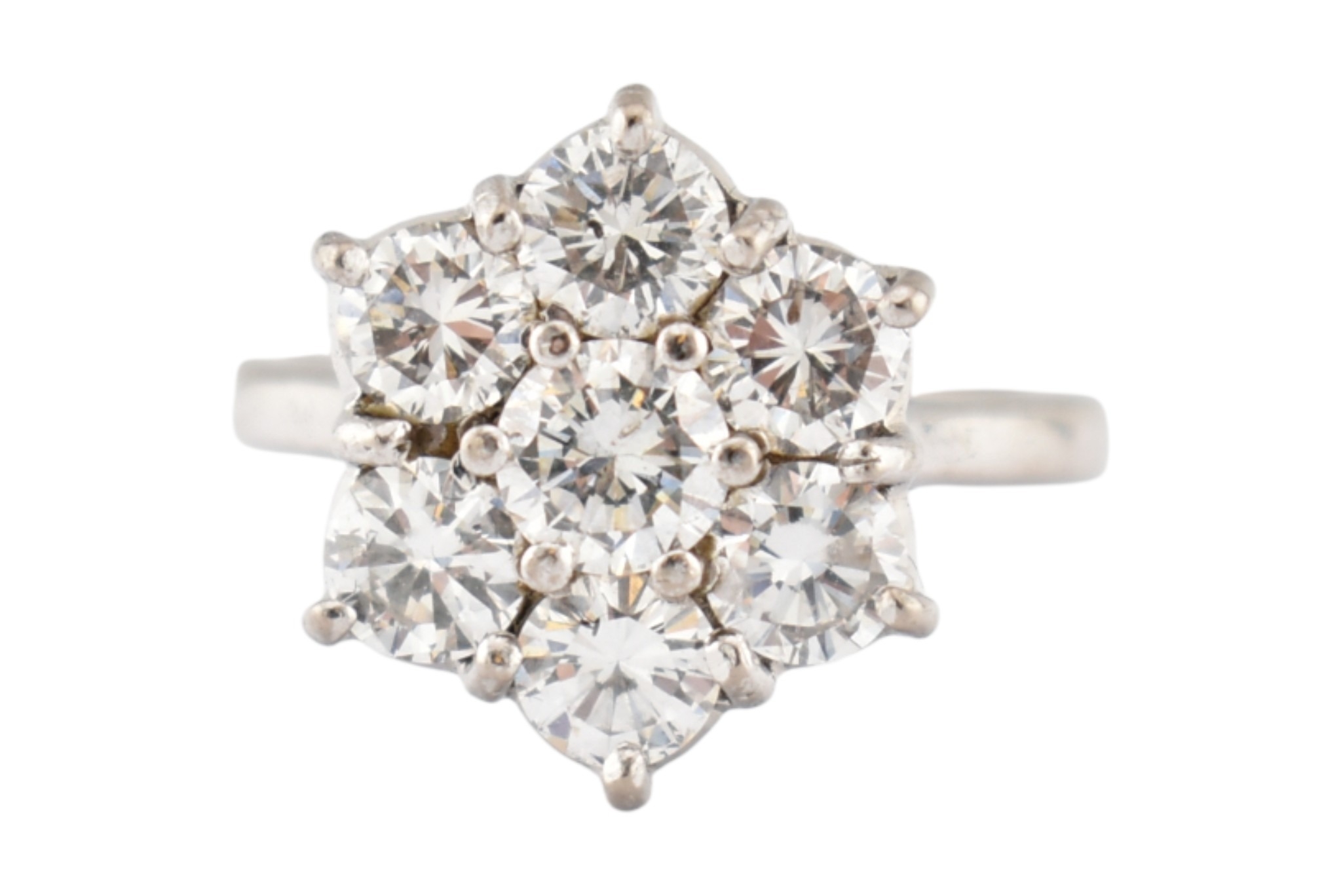 An 18ct gold and diamond cluster ring. The ring set with seven round brilliant cut diamonds. Principle diamond approx 0.38cts, estimated total diamond weight 1.88cts. Assessed colour H-I, assessed clarity SI2. Total weight of ring 4.64g. Size N.5