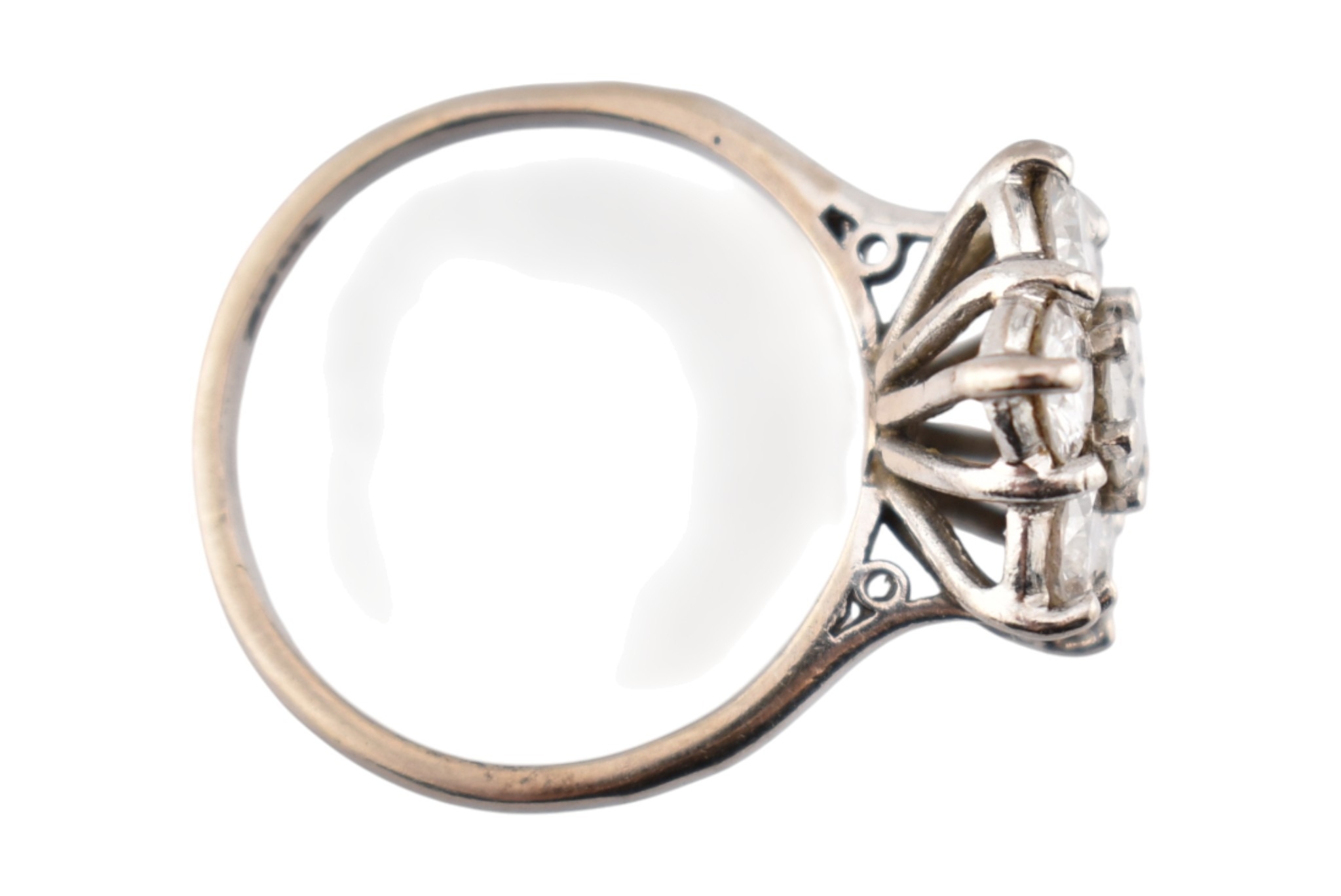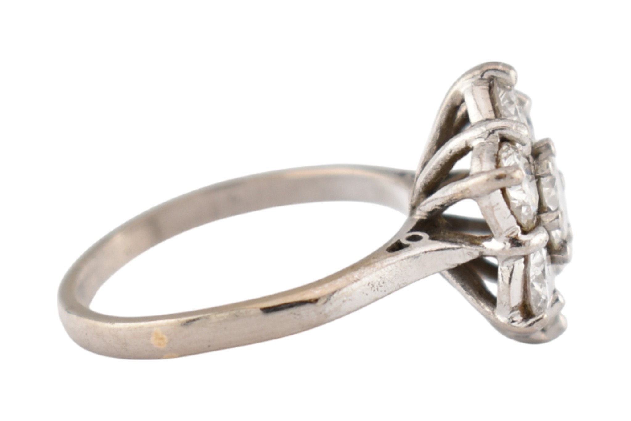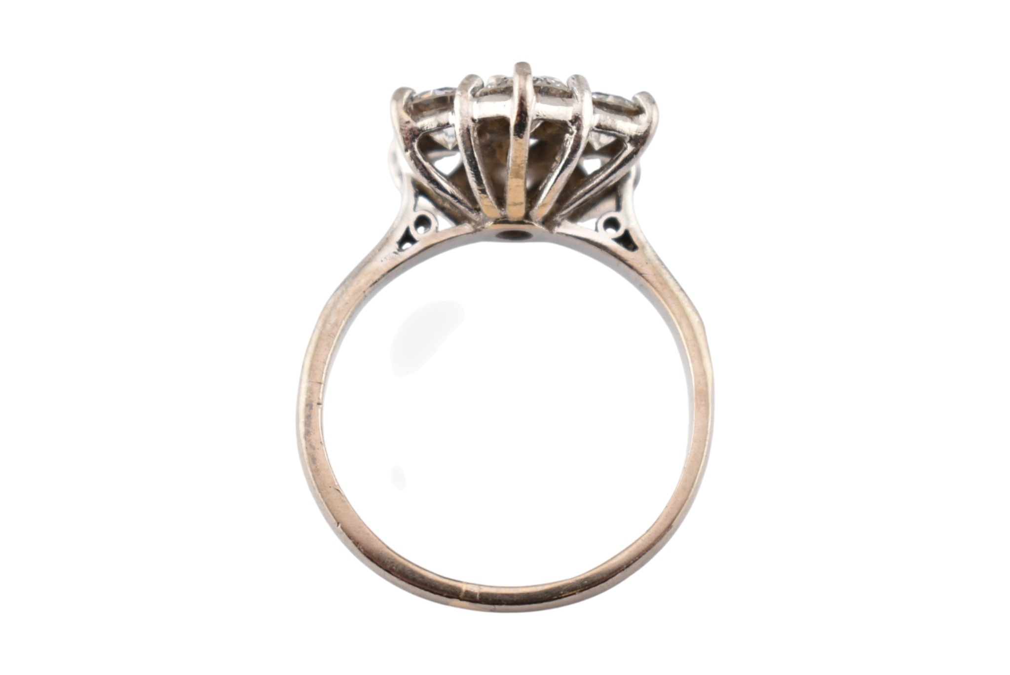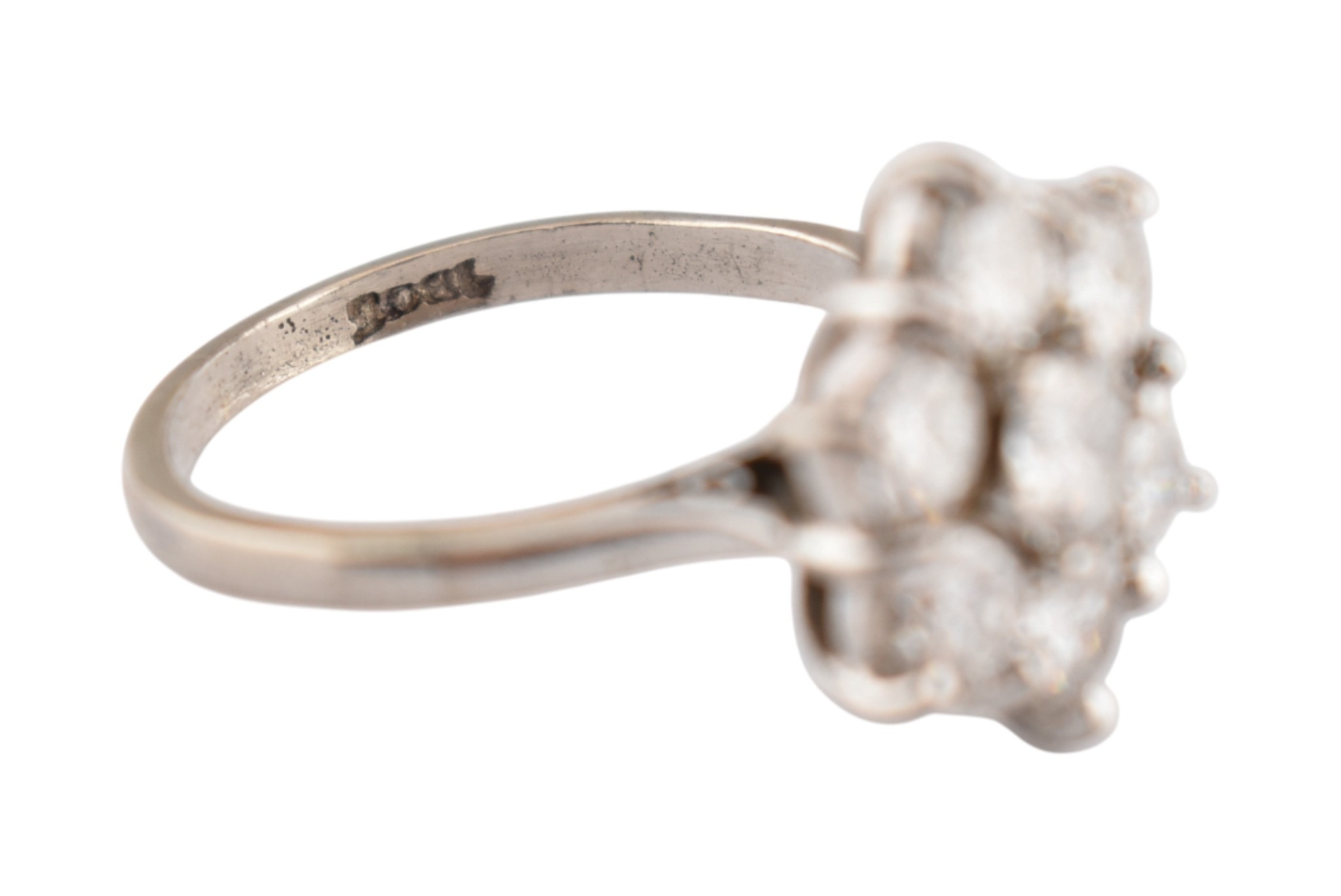 An 18ct gold and diamond cluster ring. The ring set with seven round brilliant cut diamonds. Principle diamond approx 0.38cts, estimated total diamond weight 1.88cts. Assessed colour H-I, assessed clarity SI2. Total weight of ring 4.64g. Size N.5