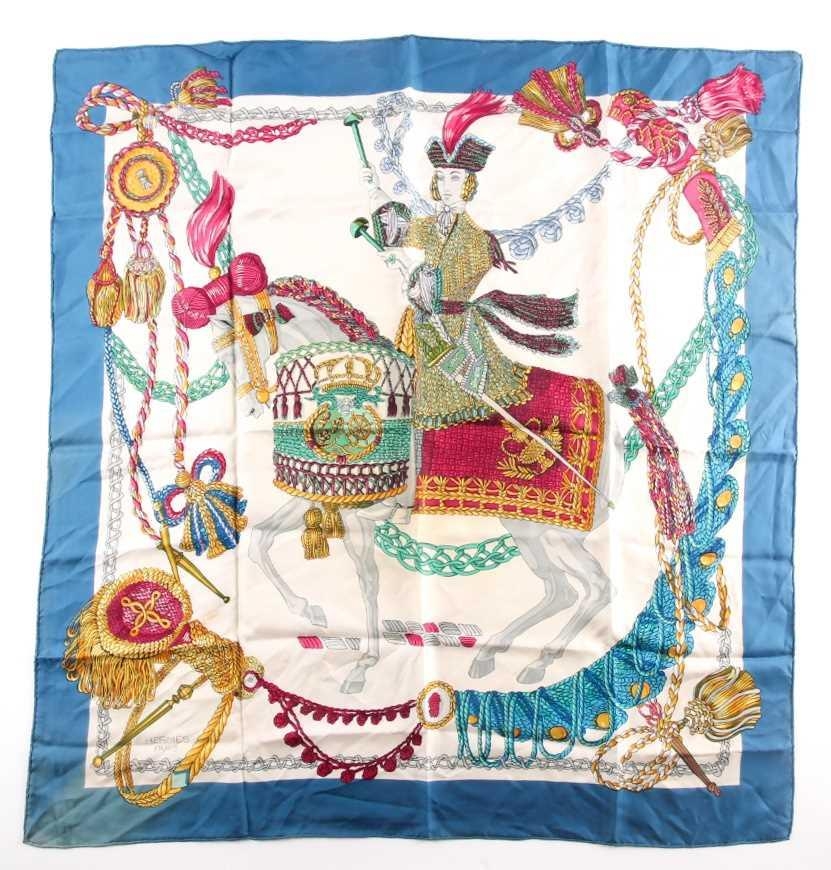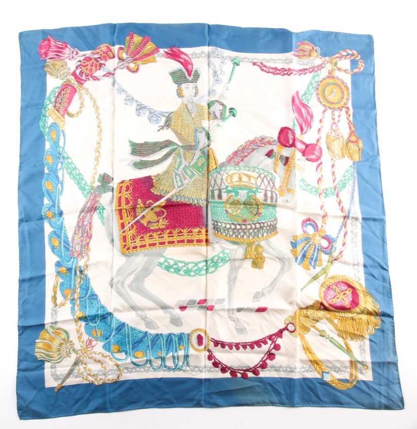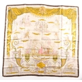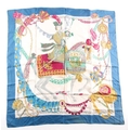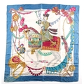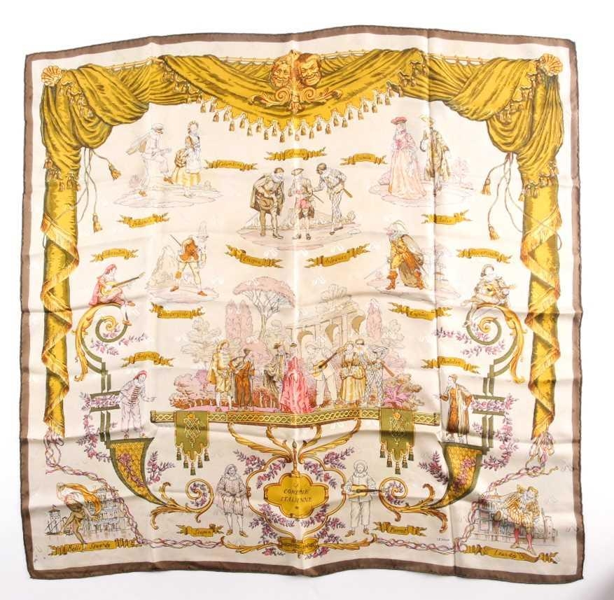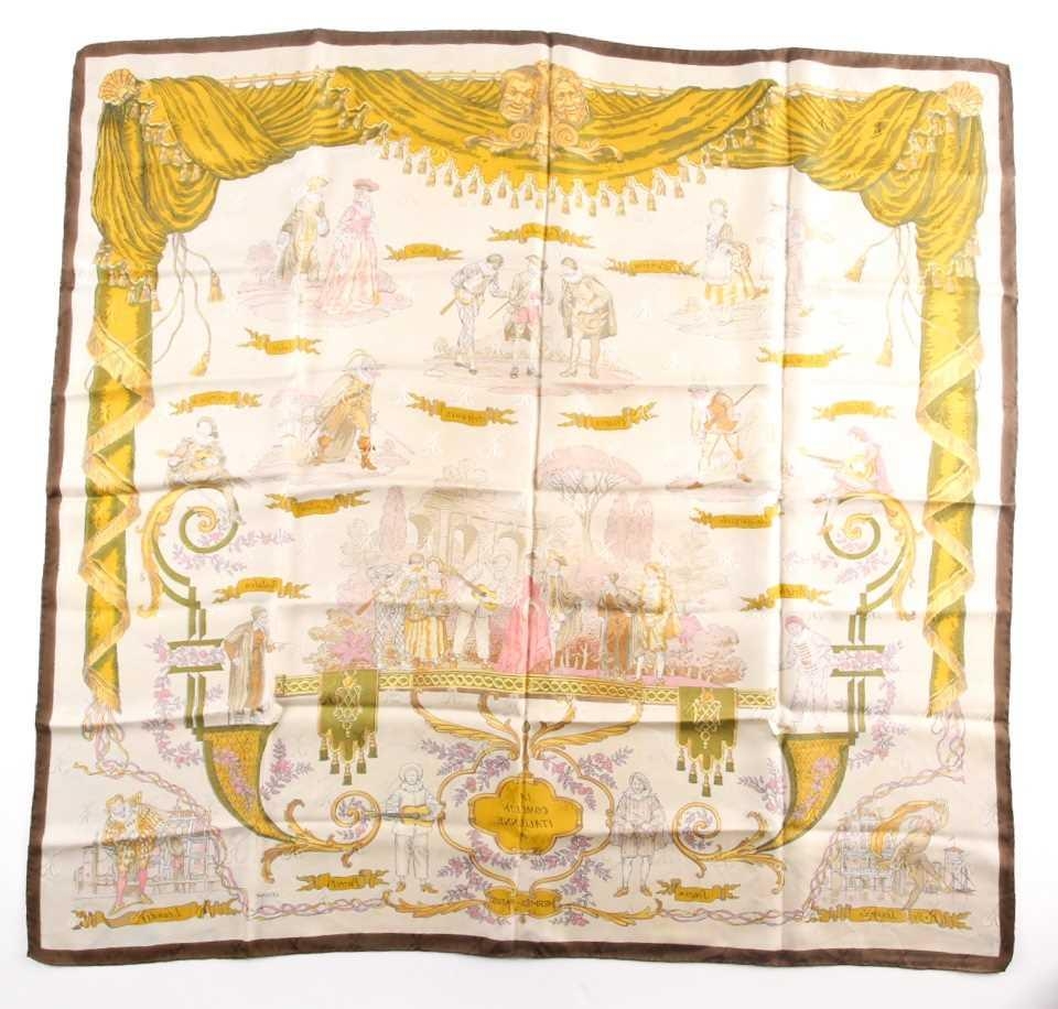 Hermes, Paris. A silk scarf depicting Italian theatrical figures including Colombine, Crispin, and Giangurgiolo, light gold ground with a dark brown border, together with another Hermes silk scarf, polychrome decorated with a blue border.