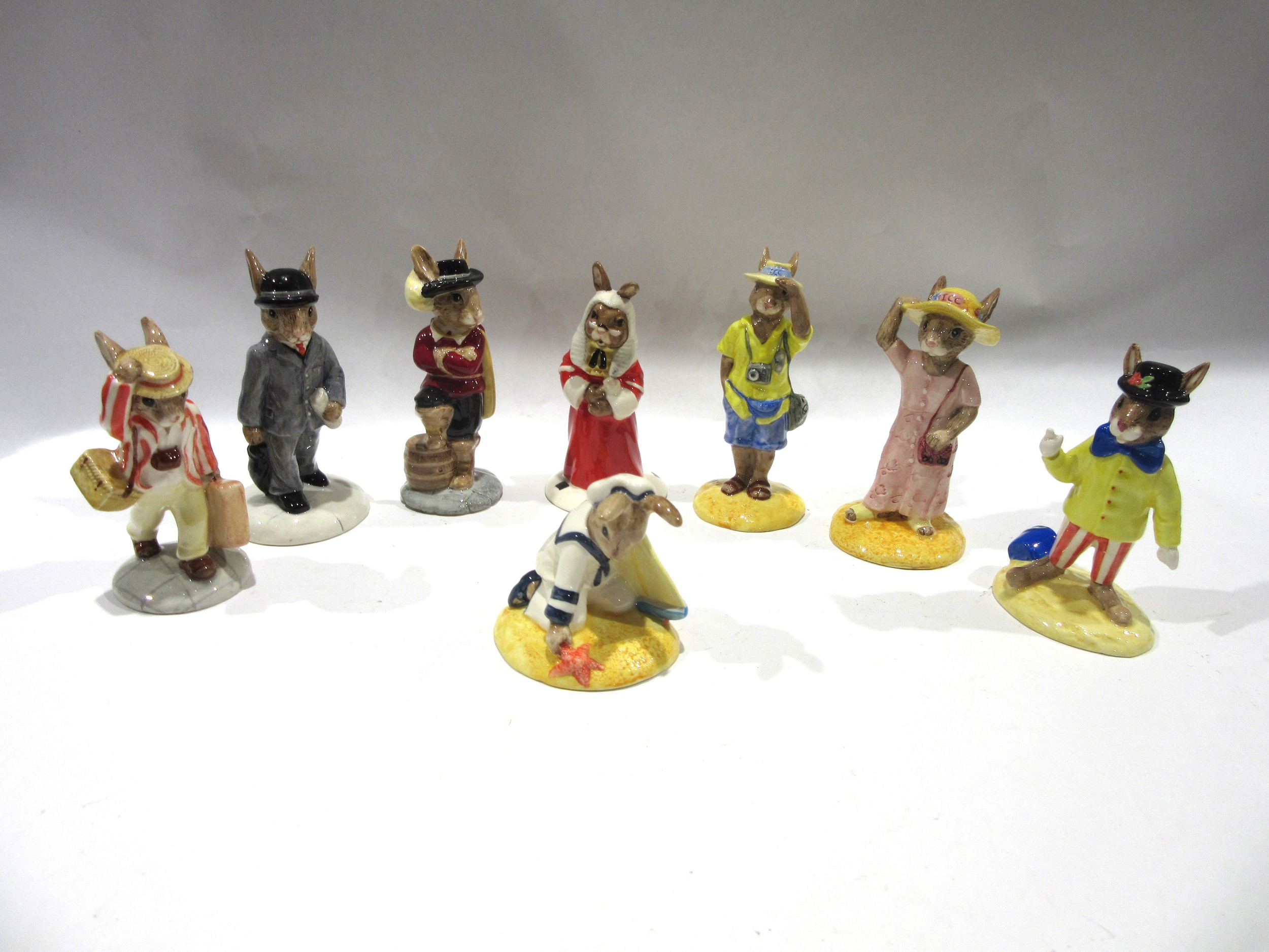 Eight Royal Doulton Bunnykins figures - "Tourist Bunnykins", "Judge Bunnykins", "Cavalier Bunnykins", "Father Bunnykins", "Sightseer Bunnykins", "Sailor Bunnykins", "Businessman Bunnykins" and "Joker Bunnykins"
