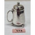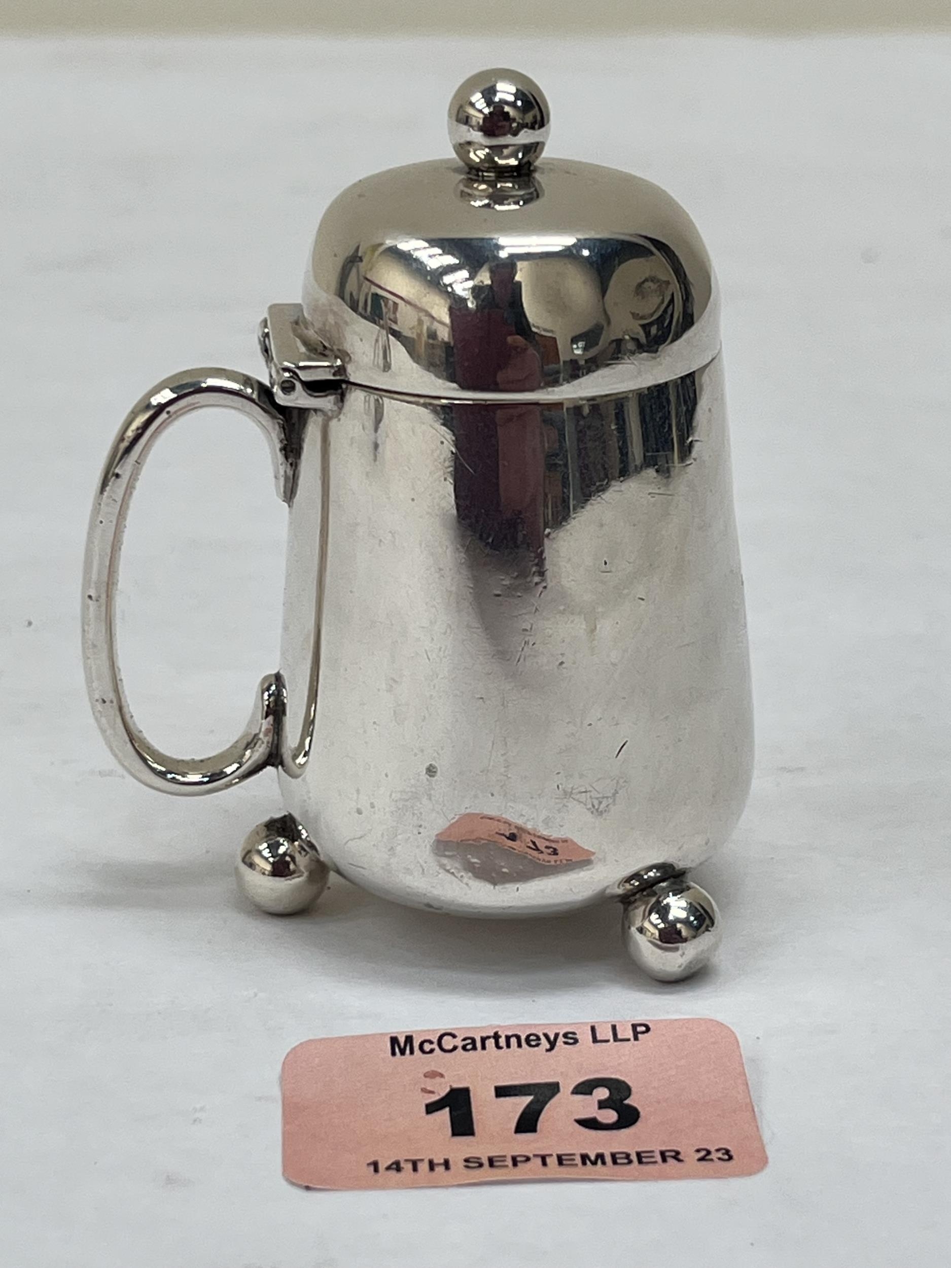 A Victorian silver mustard pot of tankard form. London 1888. 3' high. Hinge worn. 2ozs 13dwts