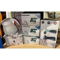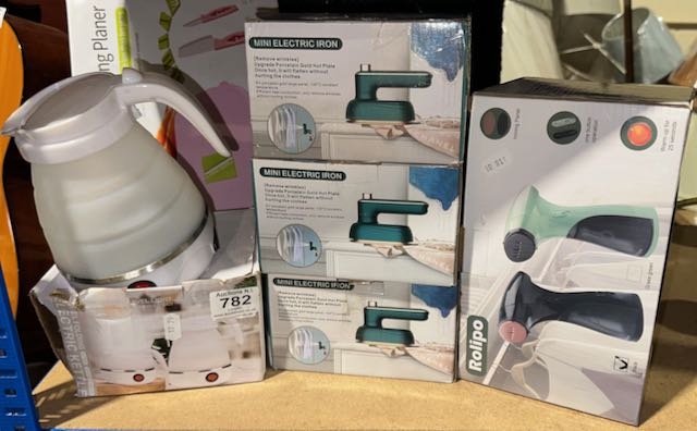 Assortment Of Boxed Travel Electricals Incl Kettle, Irons & Steamer + Slicing Board