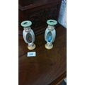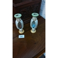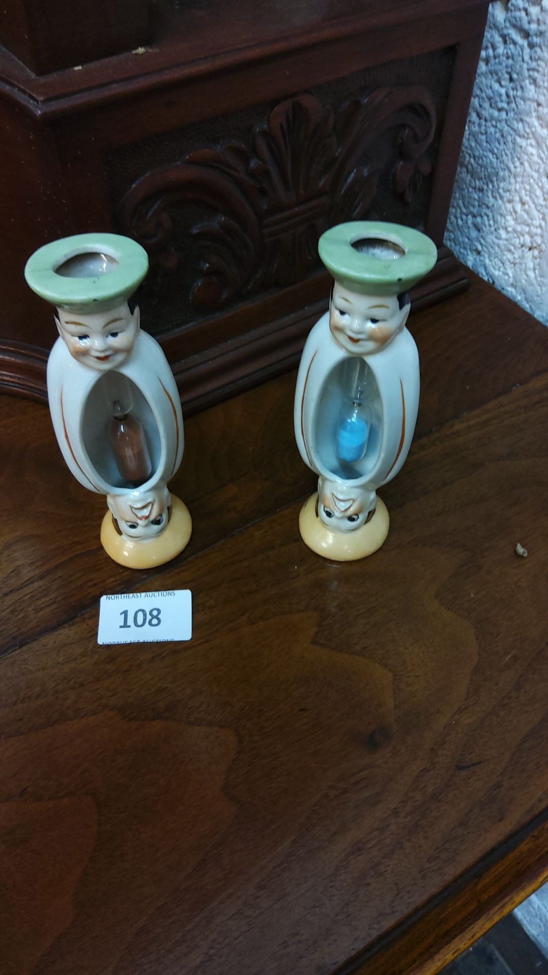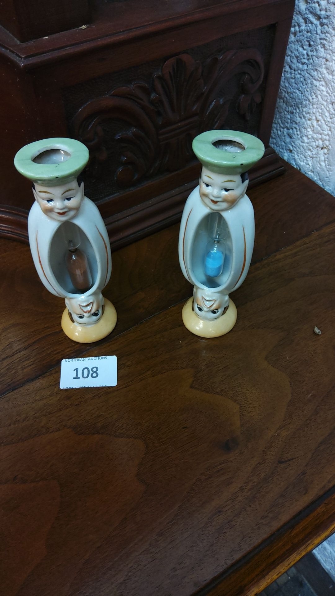 Pair of ceramic hourglasses with dual-faced characters, featuring green hat tops and smiling visages.