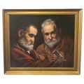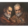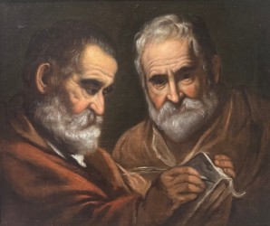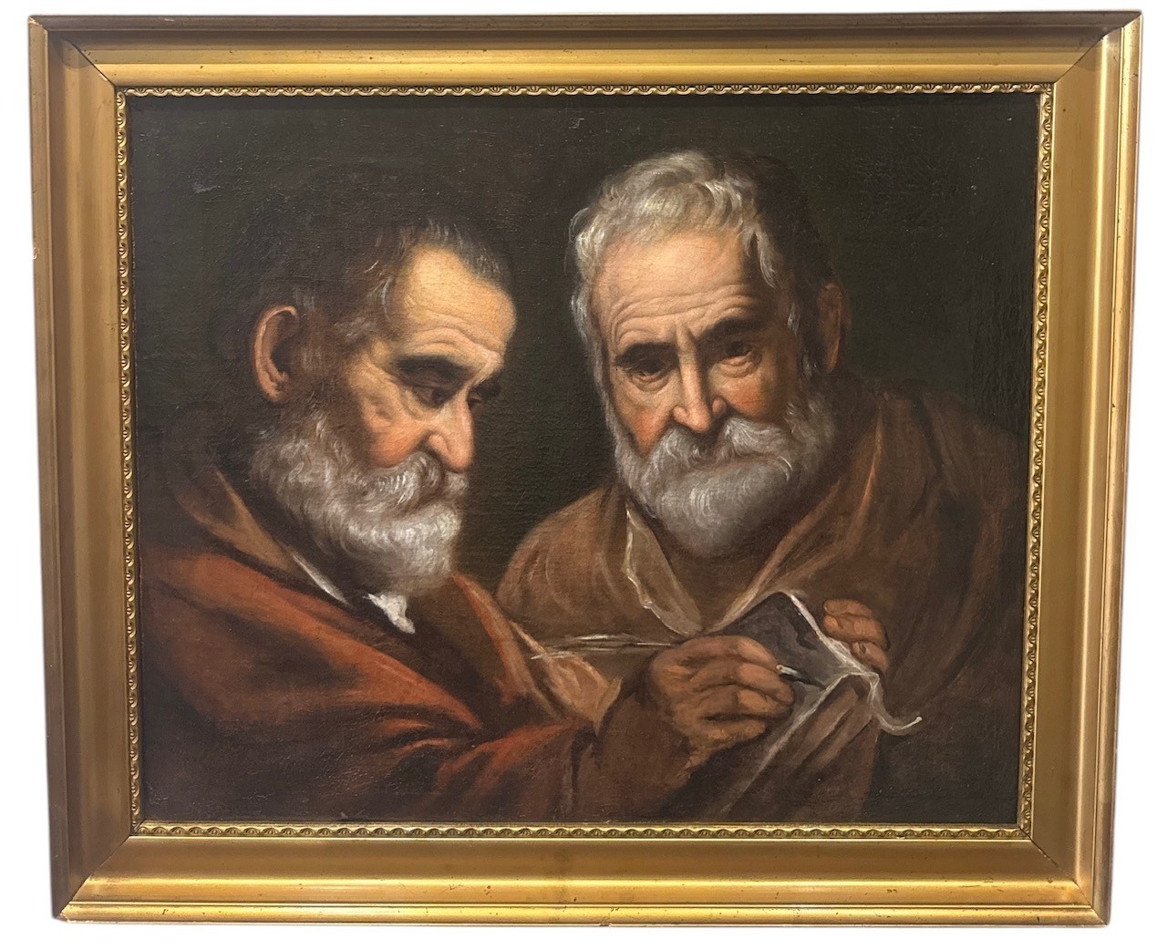 Portrait of two bearded Saints believed to be Peter & Paul, holding a book and quail writing, held in a giltwood frame, relined.