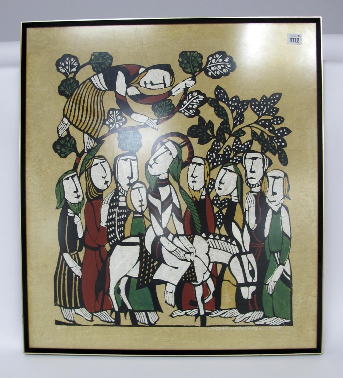 A Japanese Print on Monigami Kozo (crumpled paper), depicting figures and a donkey, another person climbing a tree, number 33 of a limited edition of 70, signed by the artist in white in the margin and dated 1974,