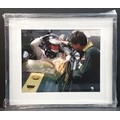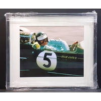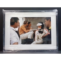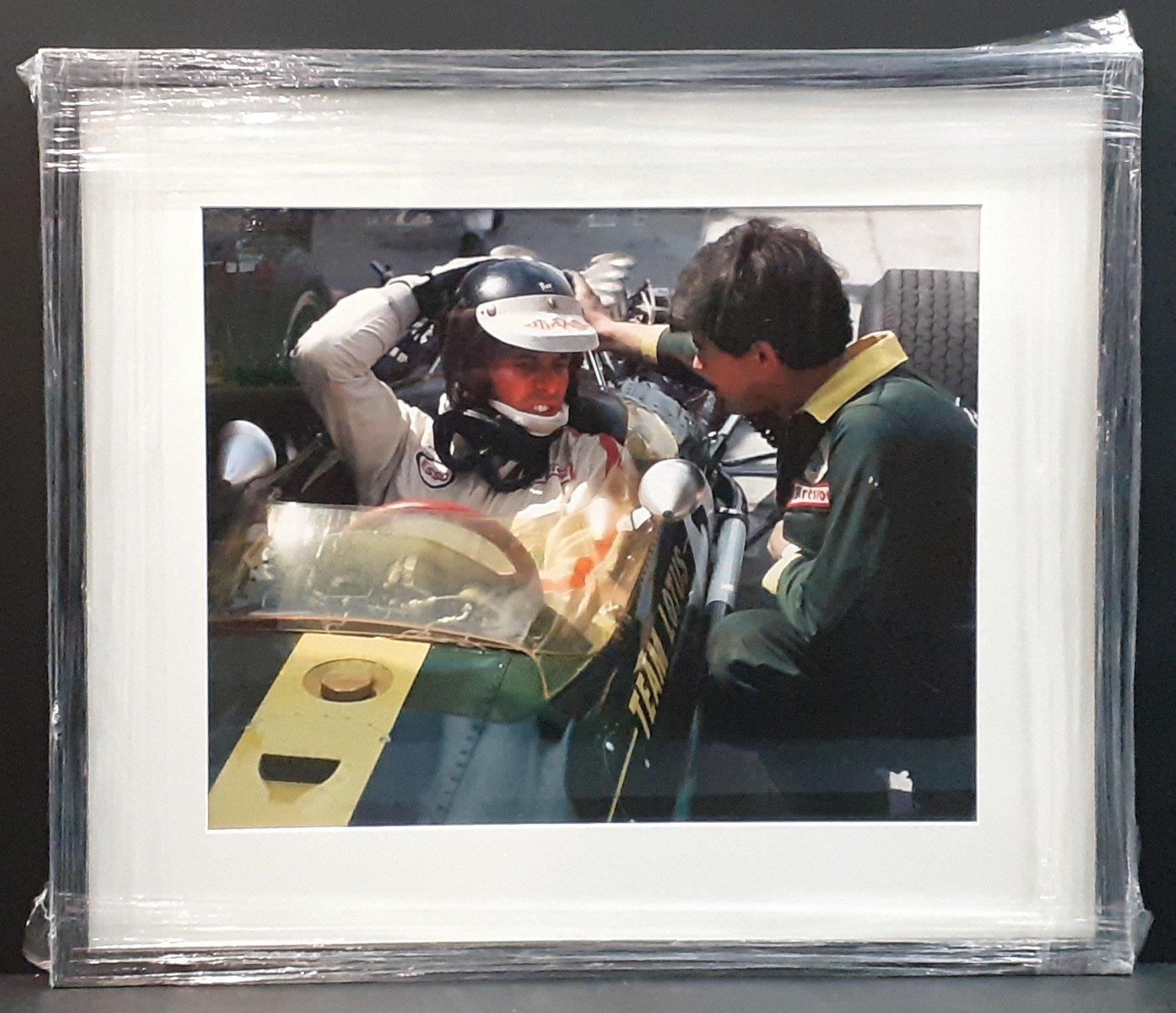 JIM CLARK Motor racing Interest Art print. A beautiful framed print of borders Legend and F1 World Champion JIM CLARK sitting in Team Lotus car in animated discussion with legendary mechanic Keith Duckworth. Printed on high quality heavyweight paper Frame size 69cm x 59cm. A stunning piece ready to hang.