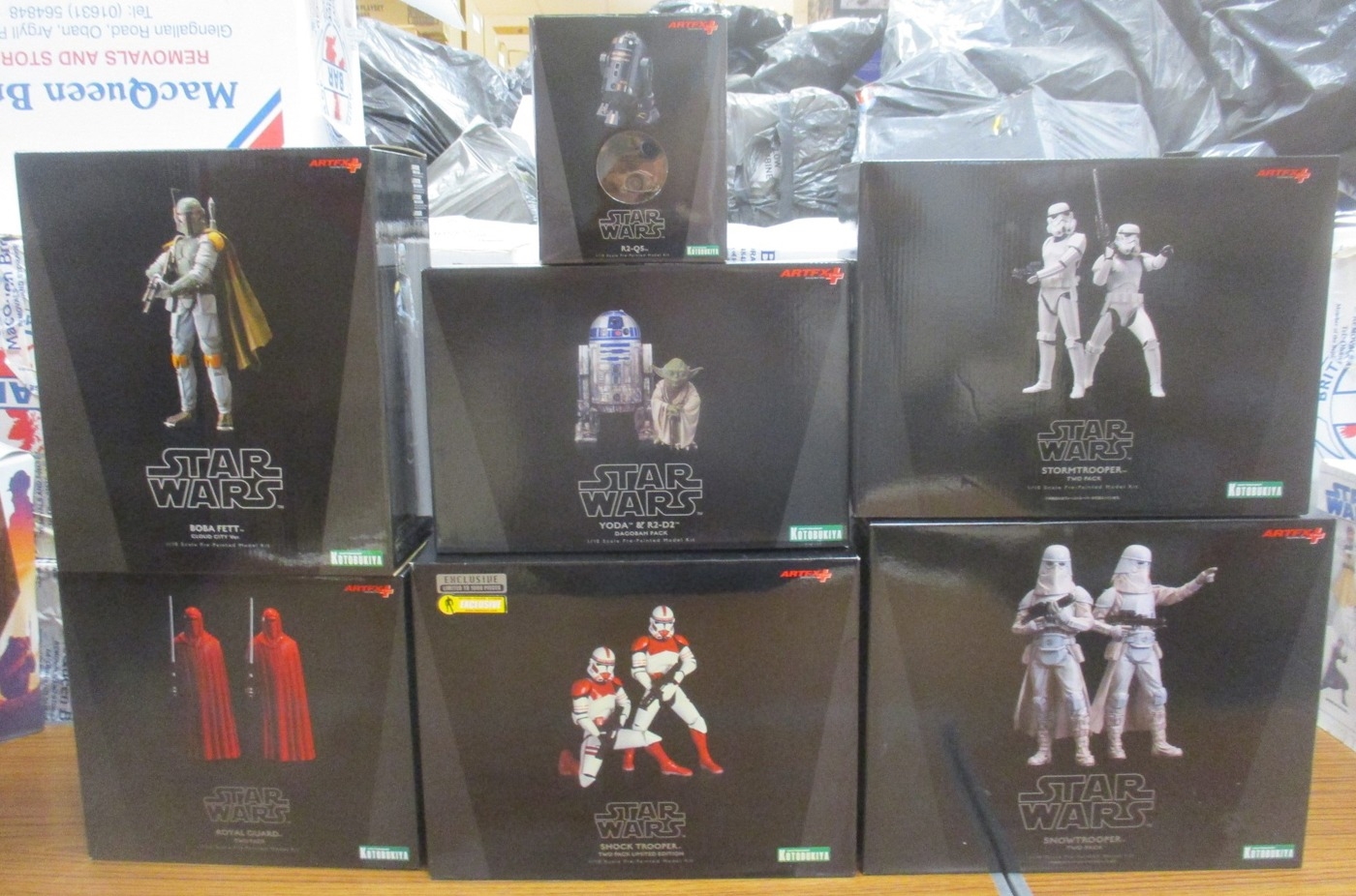 Star Wars. ARTFX. Range of unassembled 1/10 scale pre painted kits, generally mint in excellent plus to near mint boxes, with Boba Fett, Royal Guard two pack, R2-Q5, Shock Trooper two pack limited edition, Snowtrooper two pack, Stormtrooper two pack and Yoda & R2-D2 Dagobah pack. Qty 7 (3B)