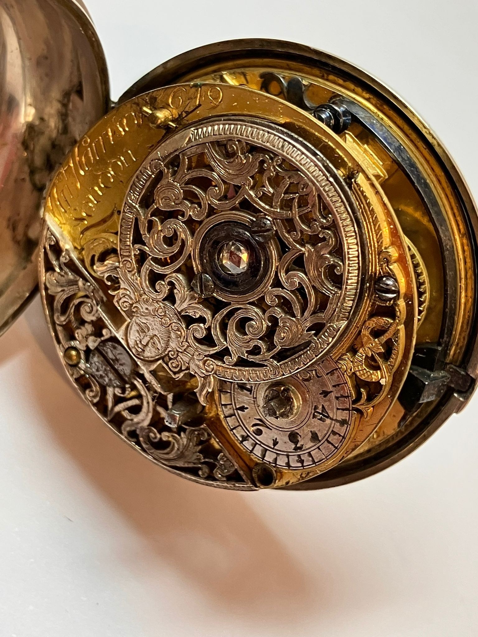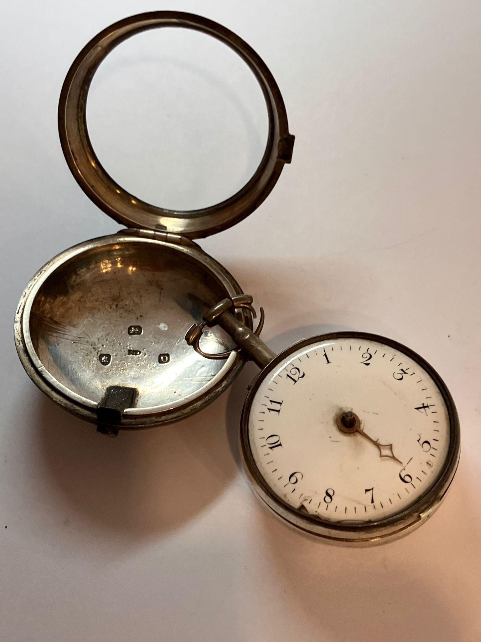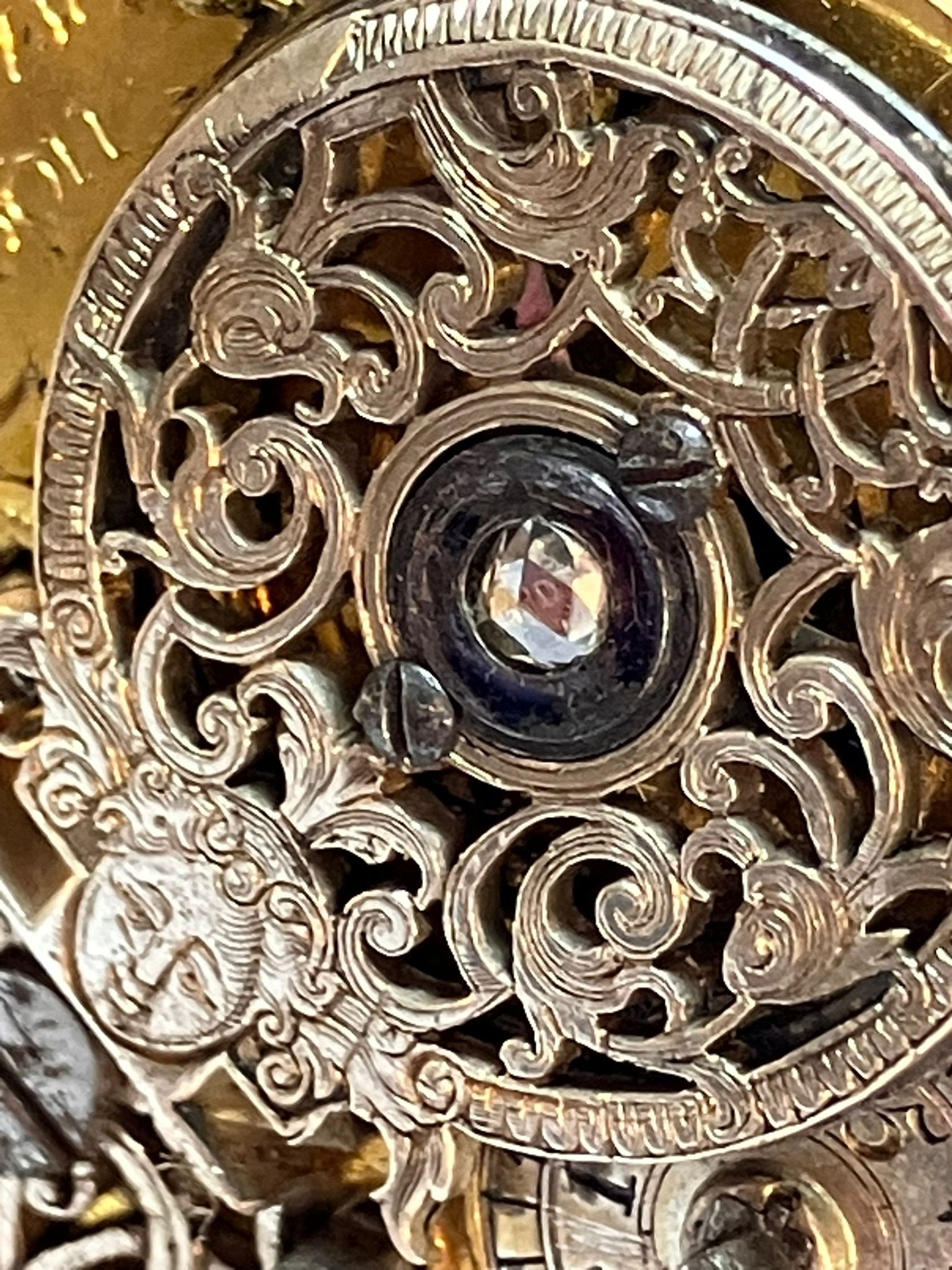 Rare Antique SILVER PAIRED POCKET WATCH. Outer Silver Case Hallmarked London 1799. Exquisite Inner Mechanism set with 0.2 CARAT DIAMOND to Filigree Centre. Mechanism signed Harrison London. Missing a hand. Ticks nicely when agitated. Please see all pictures. af.