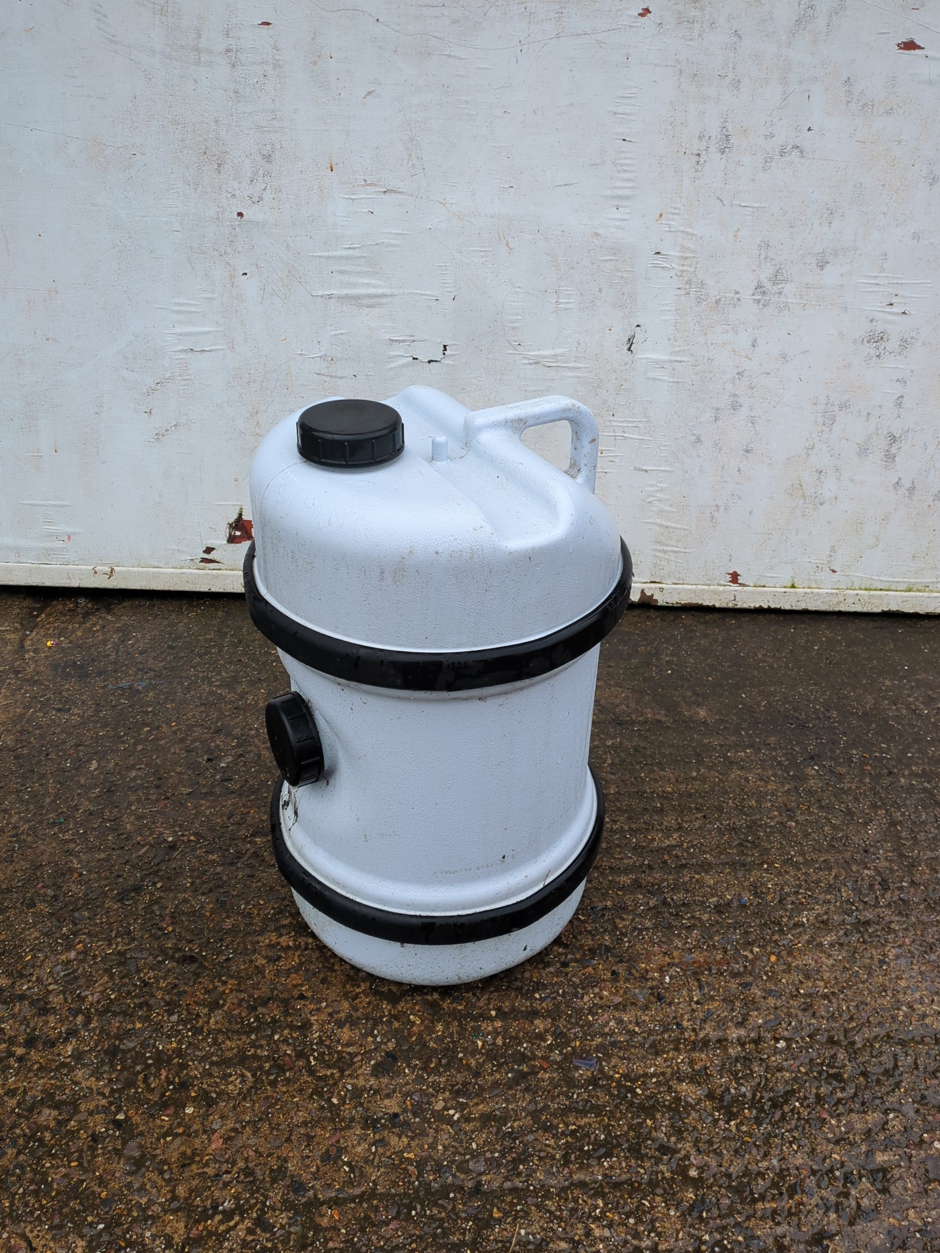 A durable Water Hog container designed for efficient water storage. The container features a sturdy handle and a secure screw cap for easy carrying and filling. Its simple, robust design makes it ideal for outdoor use or gardening needs.