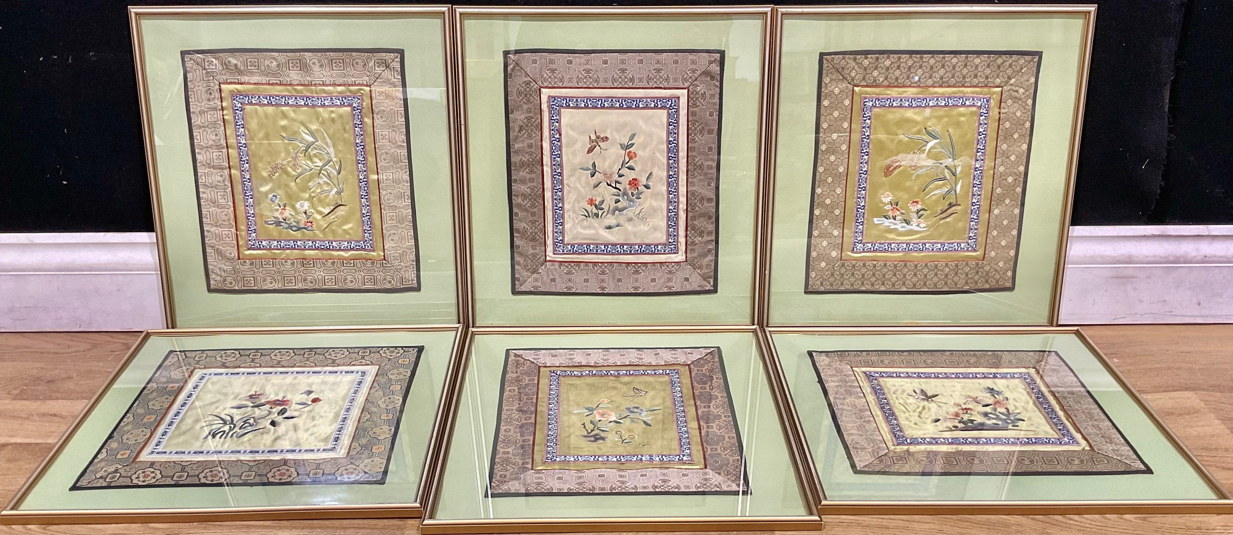 A set of six Chinese embroidered panels, depicting traditional flowers and insects, each approx 28cm x 25cm, framed (6)