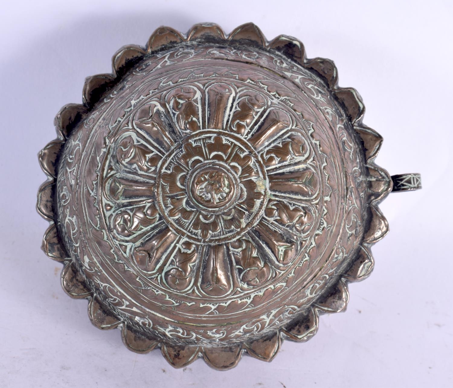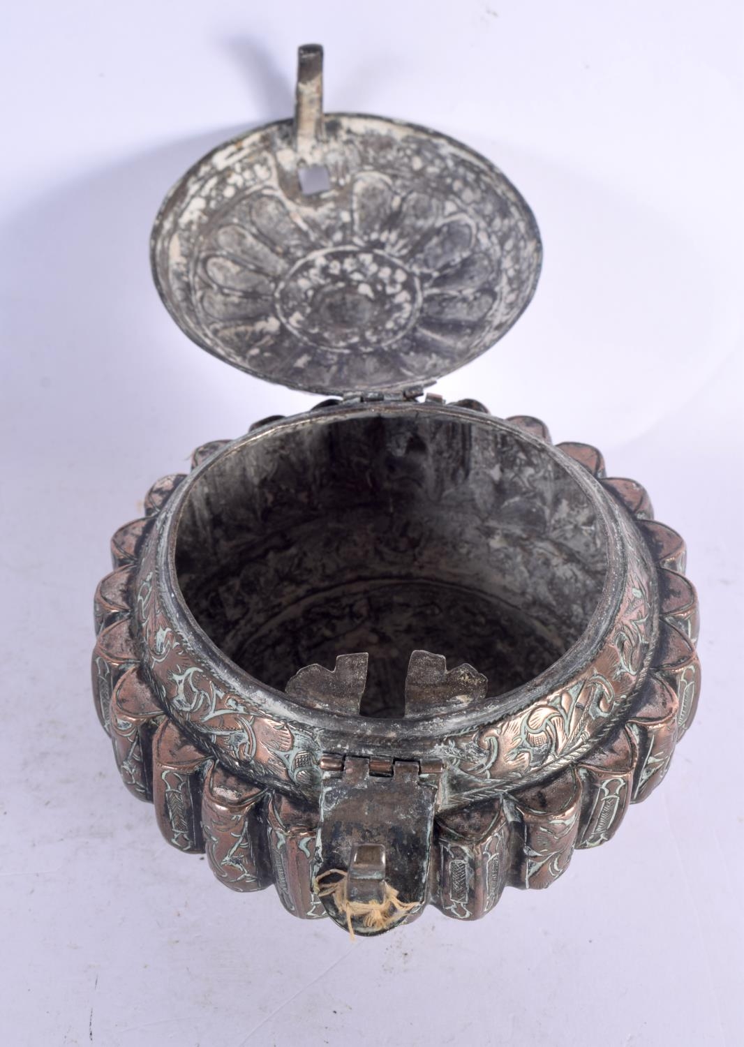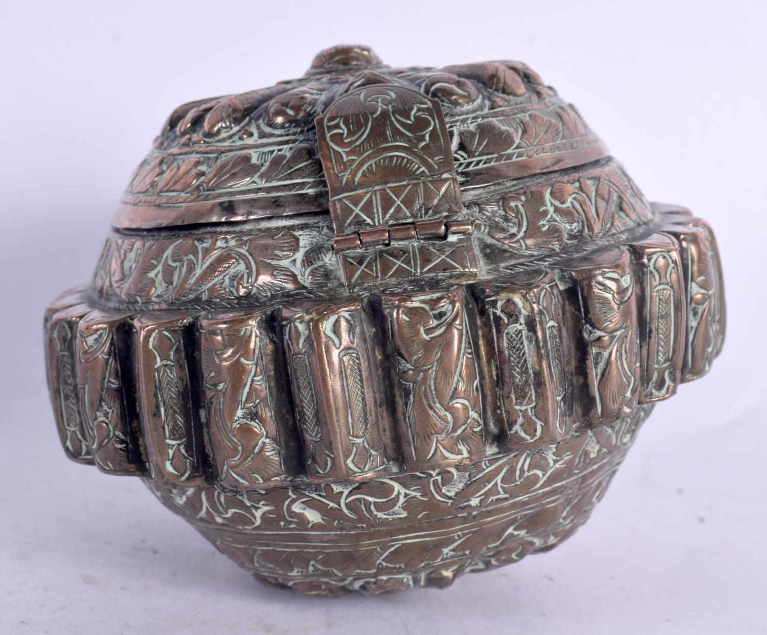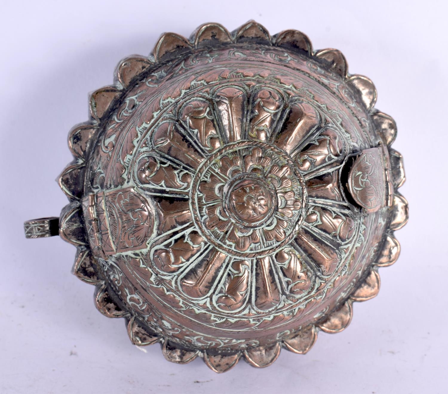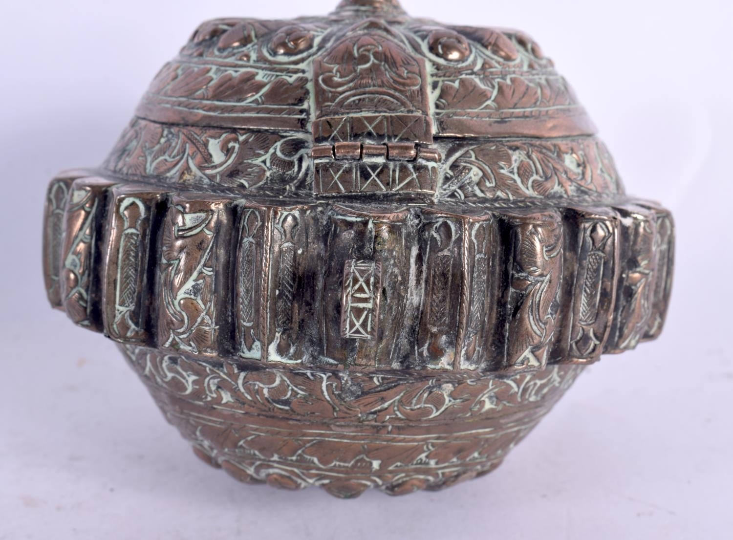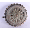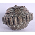 A 19TH CENTURY MIDDLE EASTERN COPPER ALLOY BETEL LIME BOX possibly Bhutan. 10 cm wide.
