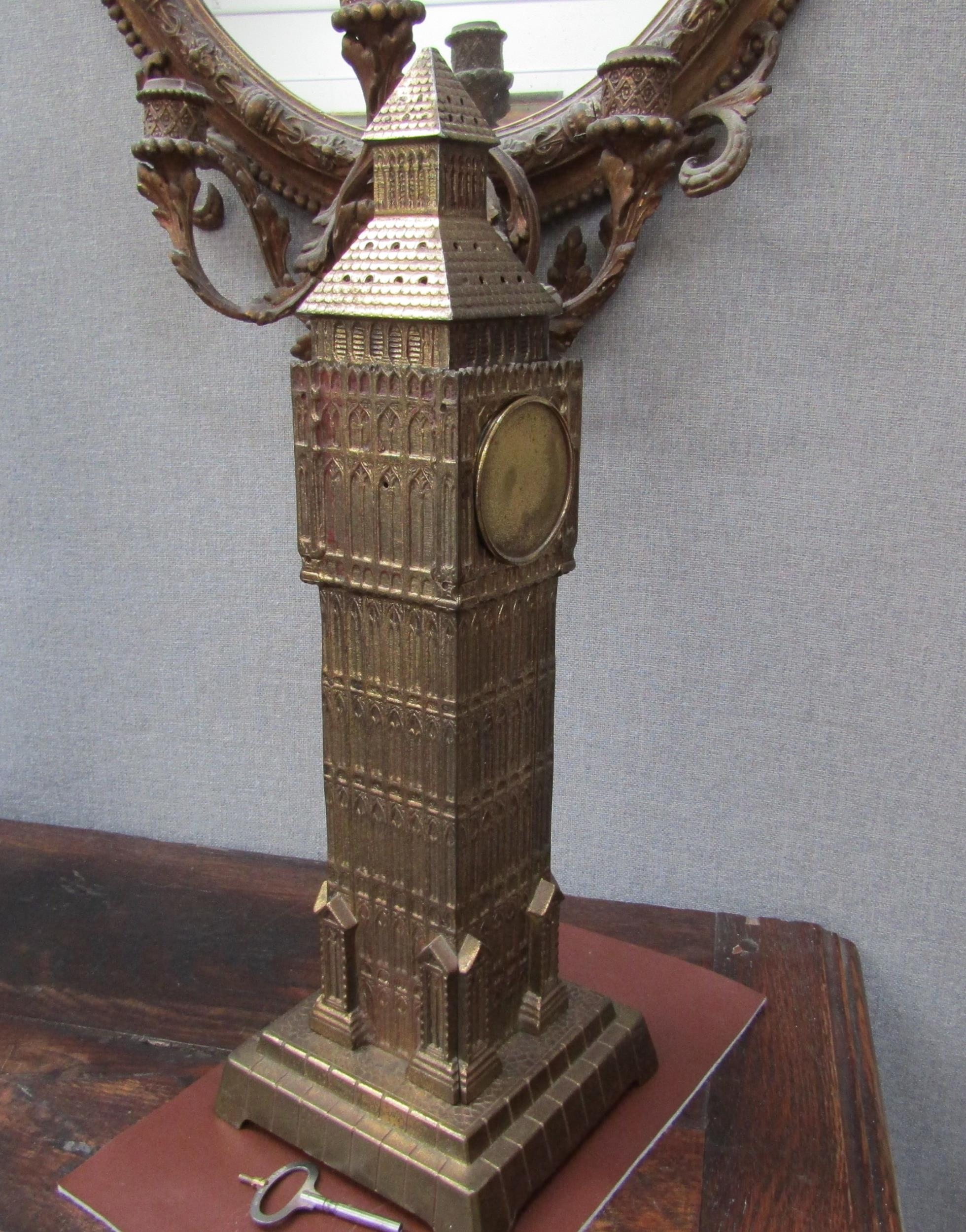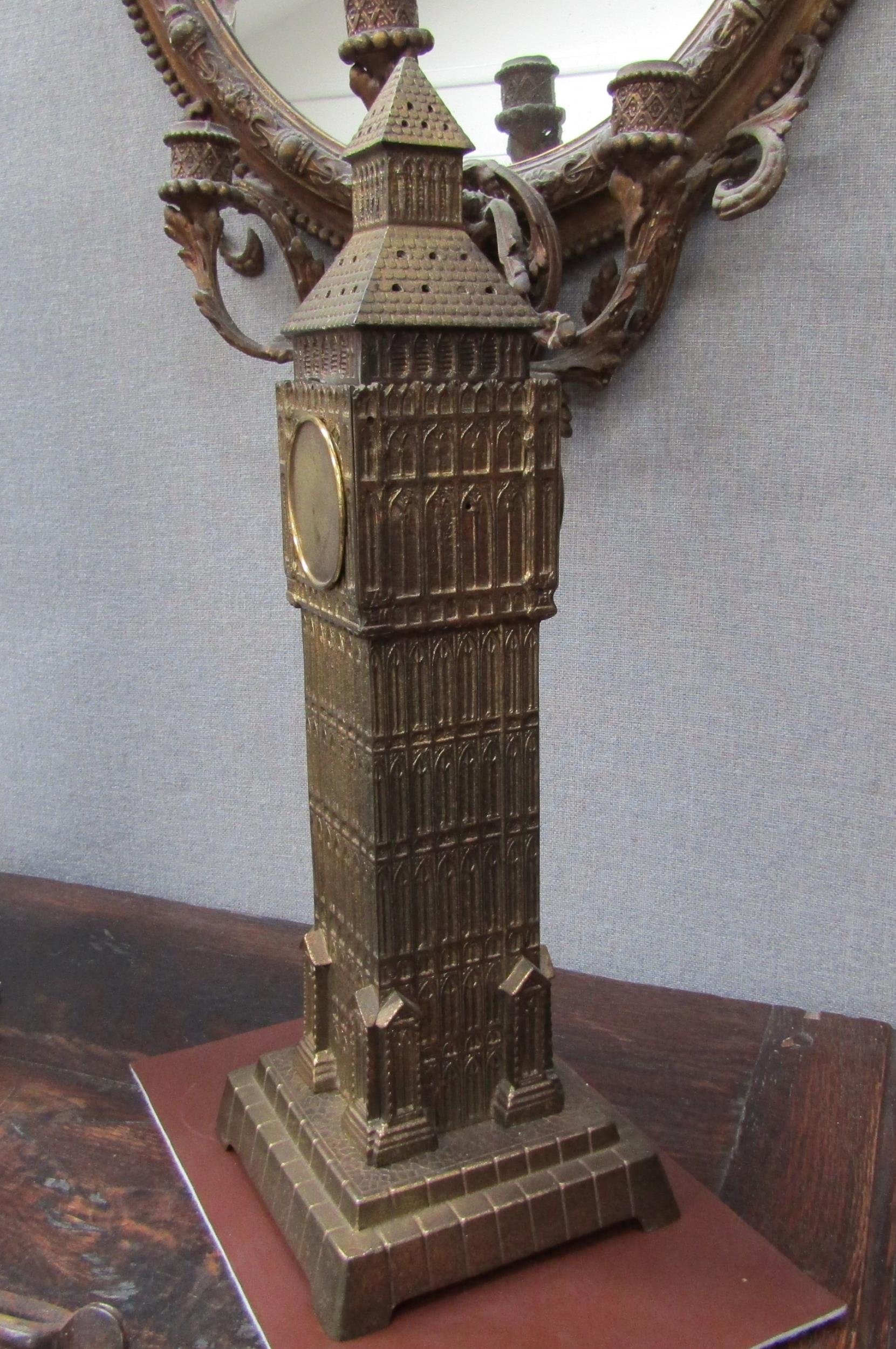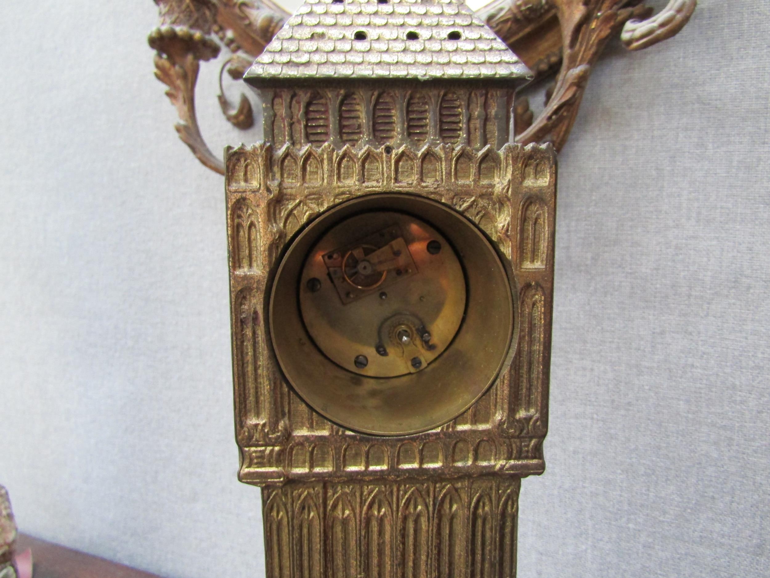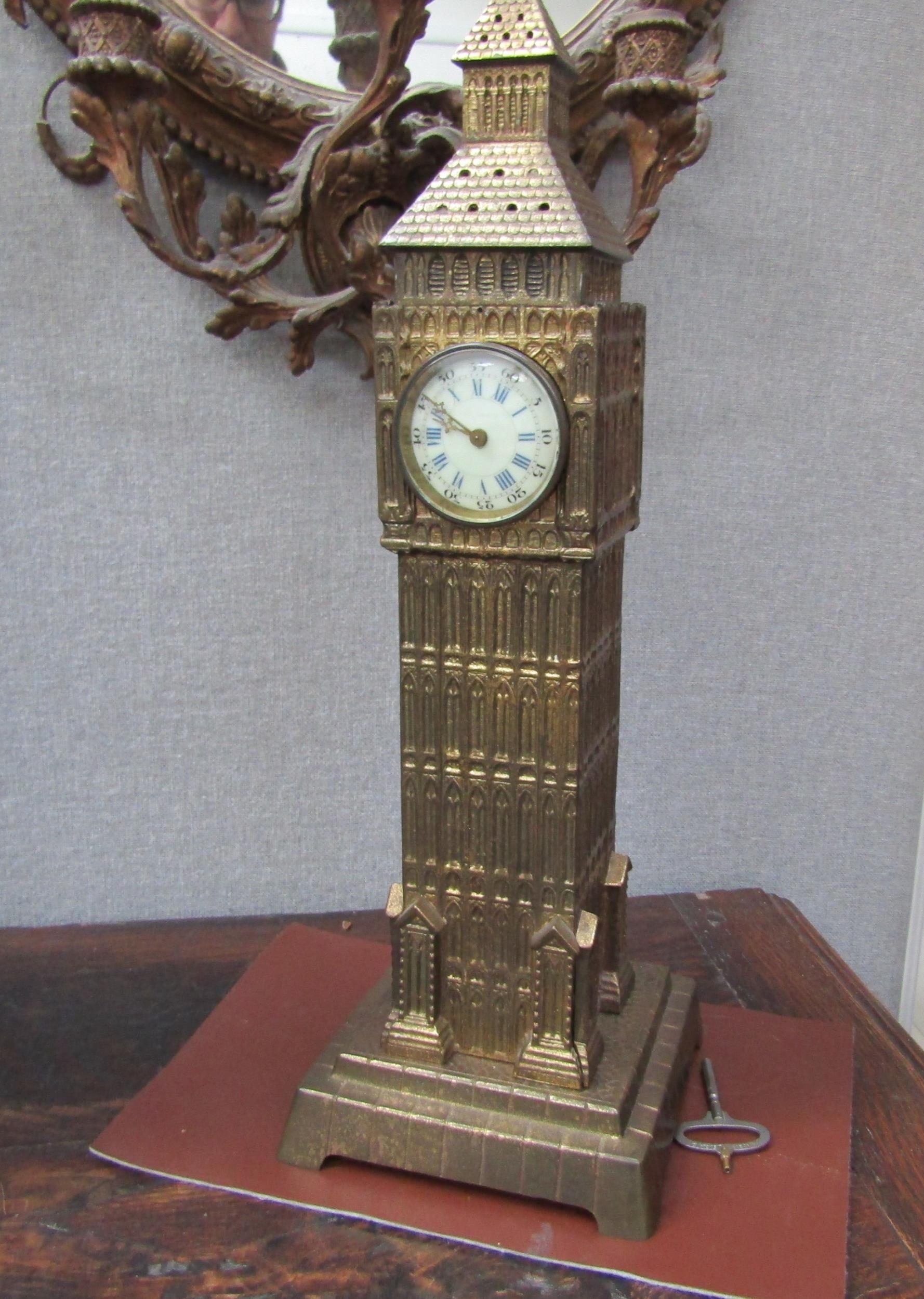 An early 20th Century mantel timepiece in the form of The Palace of Westminster "Elizabeth Tower", (Big Ben) with Arabic and Roman numeral enamel face, cylinder movement, 55cm tall x 18.5cm wide