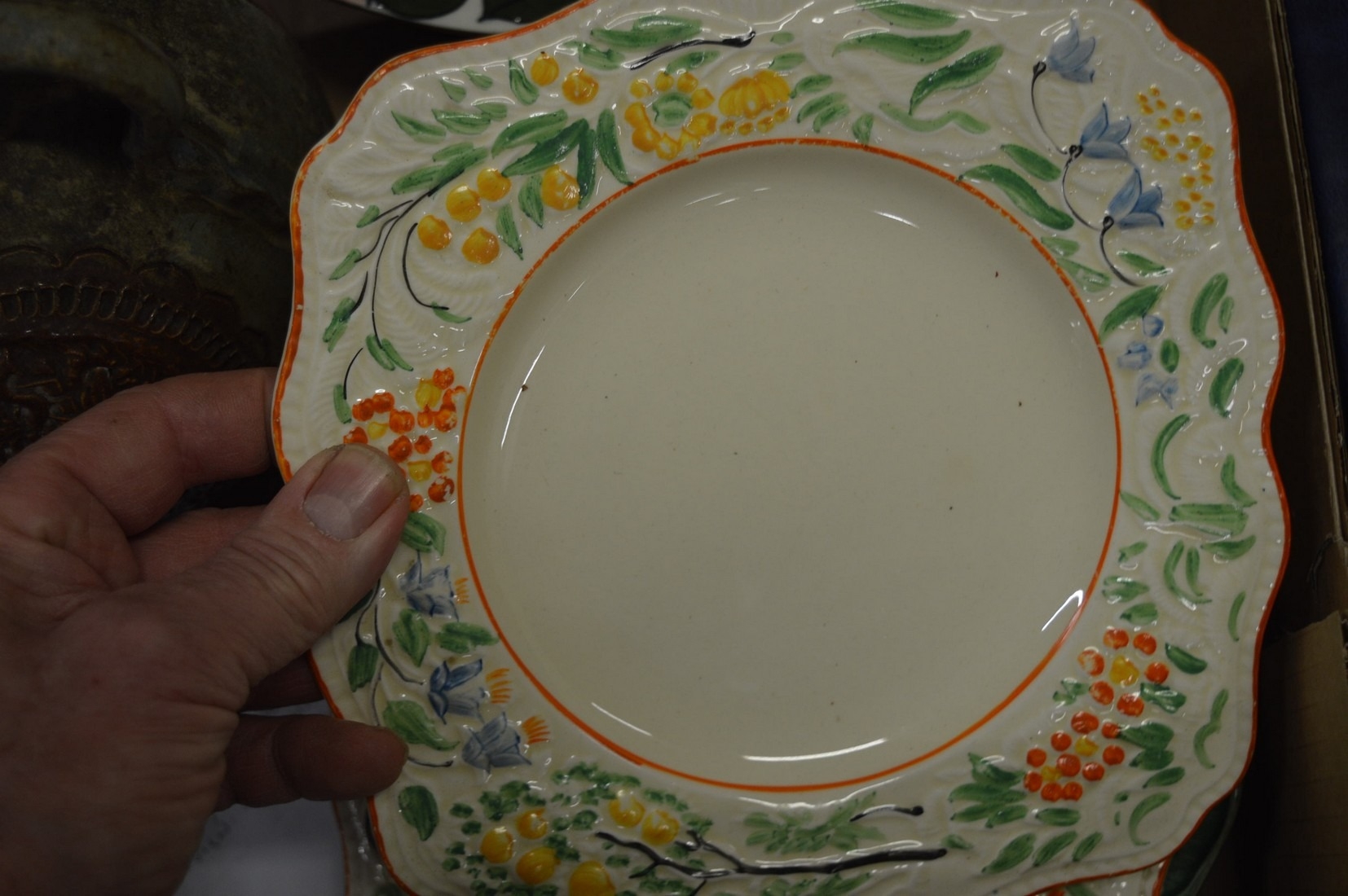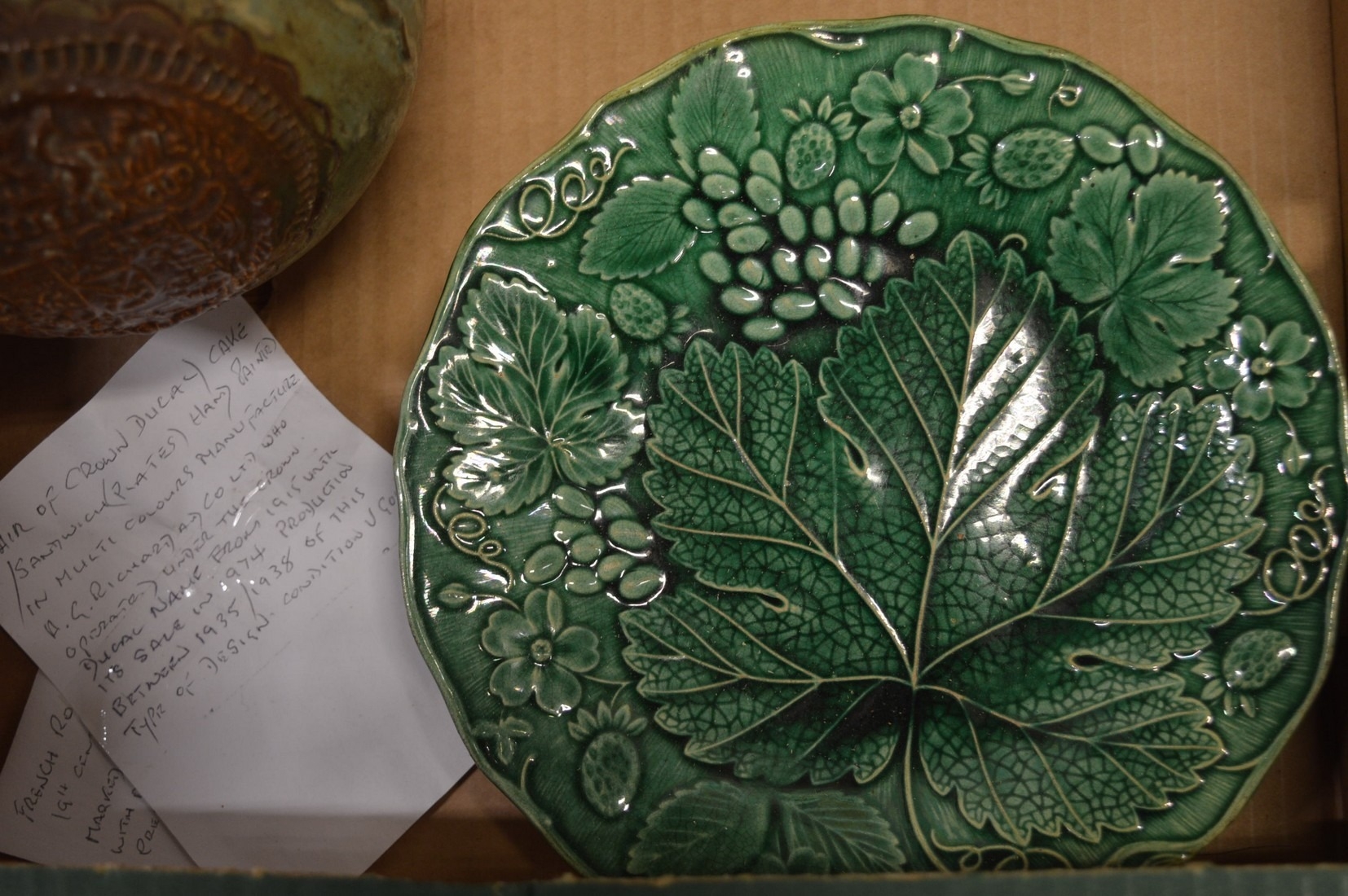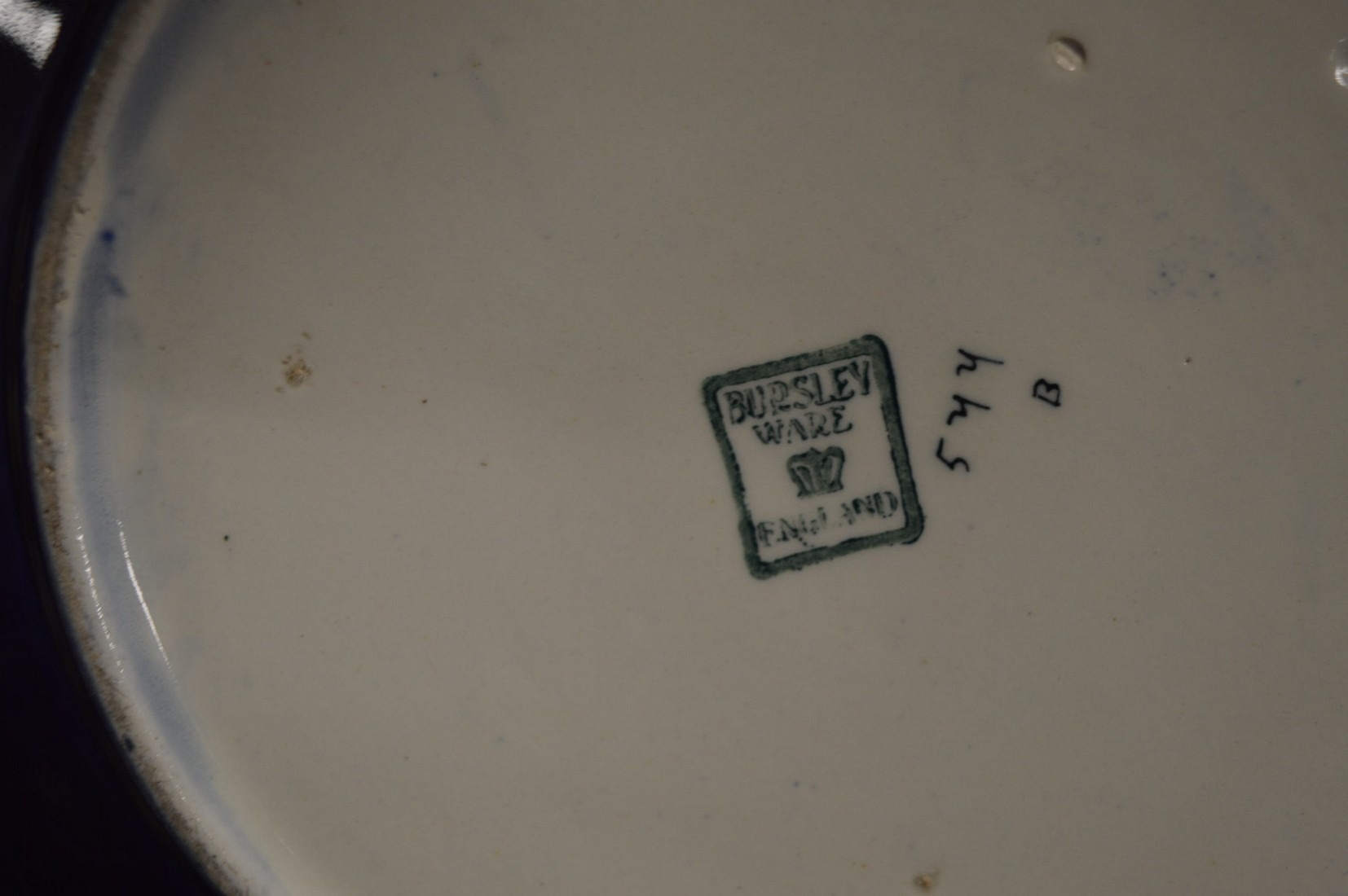 A French Rouen dish, Bursley ware bowl, salt glazed bottle vase and other items.
