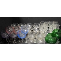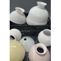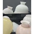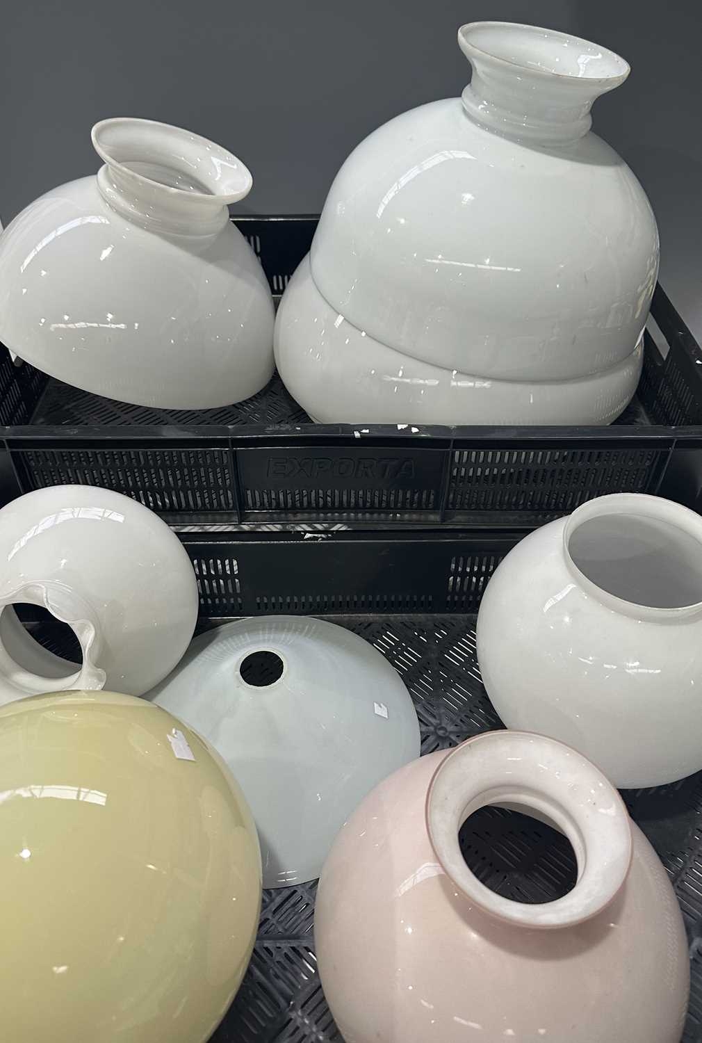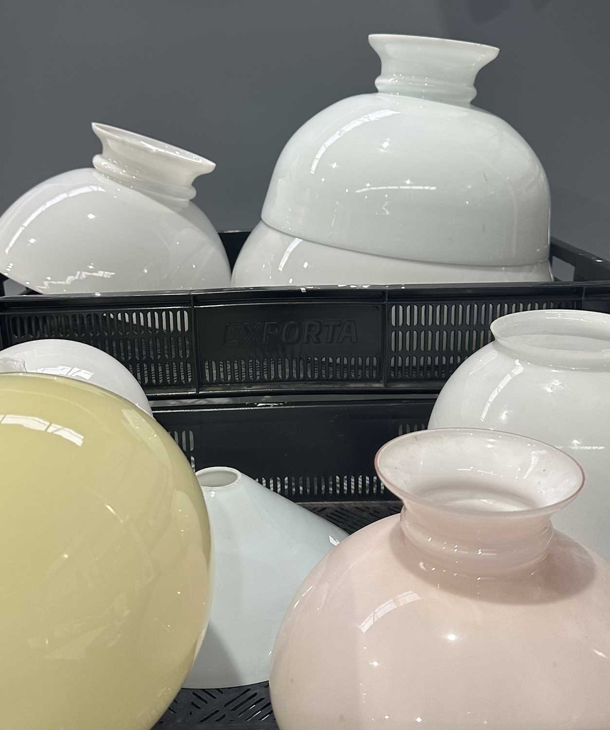 Two trays of glass oil lamp shades, various forms, some coloured, majority opaque white glass, 30cm to 14.5cm diameter fitting (2 trays)