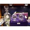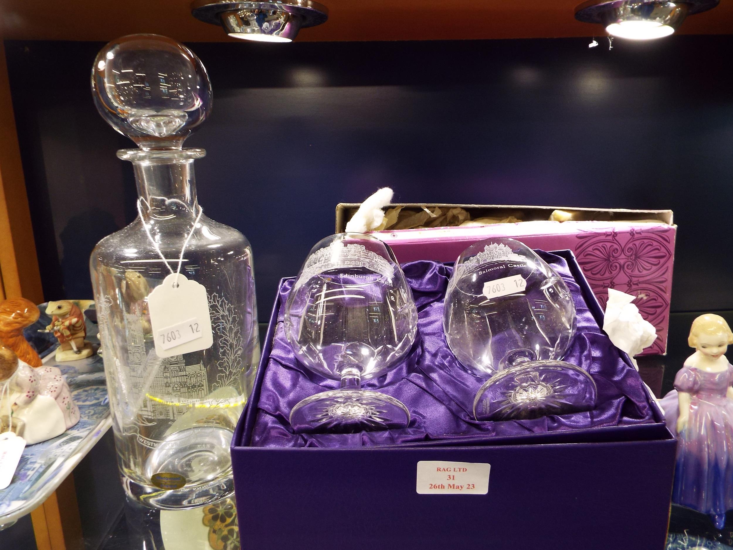A Wedgwood glass bottle decanter and a boxed pair of Edinburgh crystal goblets with castle decoration