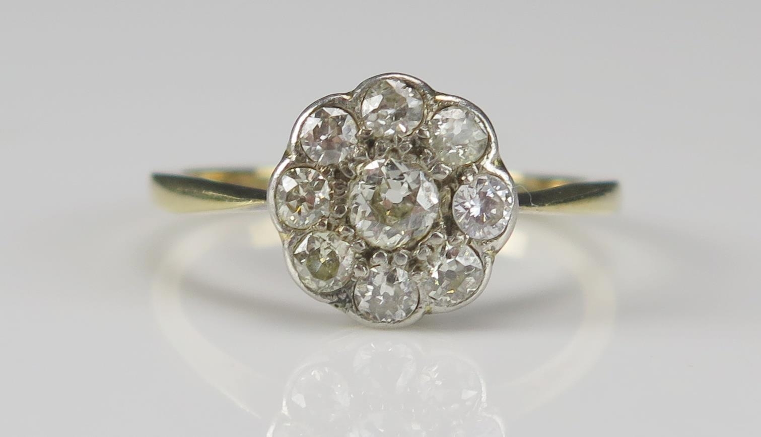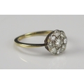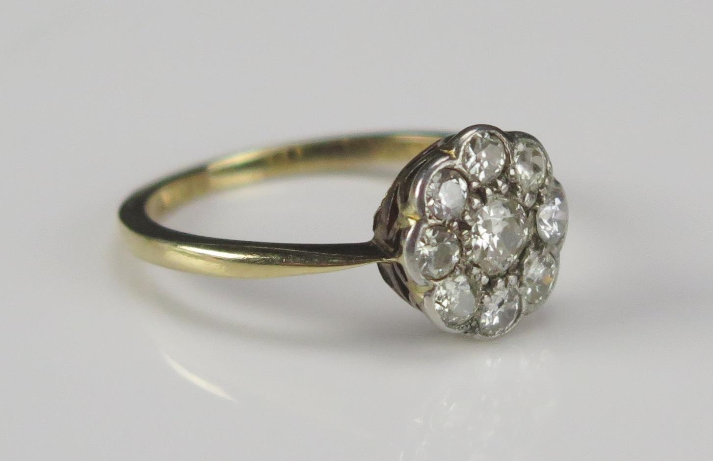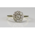 An Old Cut Diamond Cluster Ring in a precious yellow metal setting, 10.5mm head, size P.5, rubbed mark, KEE tests as 18ct, 2.9g. UNLESS OTHERWISE STATED, THE KEE TEST IS A SURFACE TEST ONLY AND IS NOT A GUARANTEE OF GOLD PURITY.