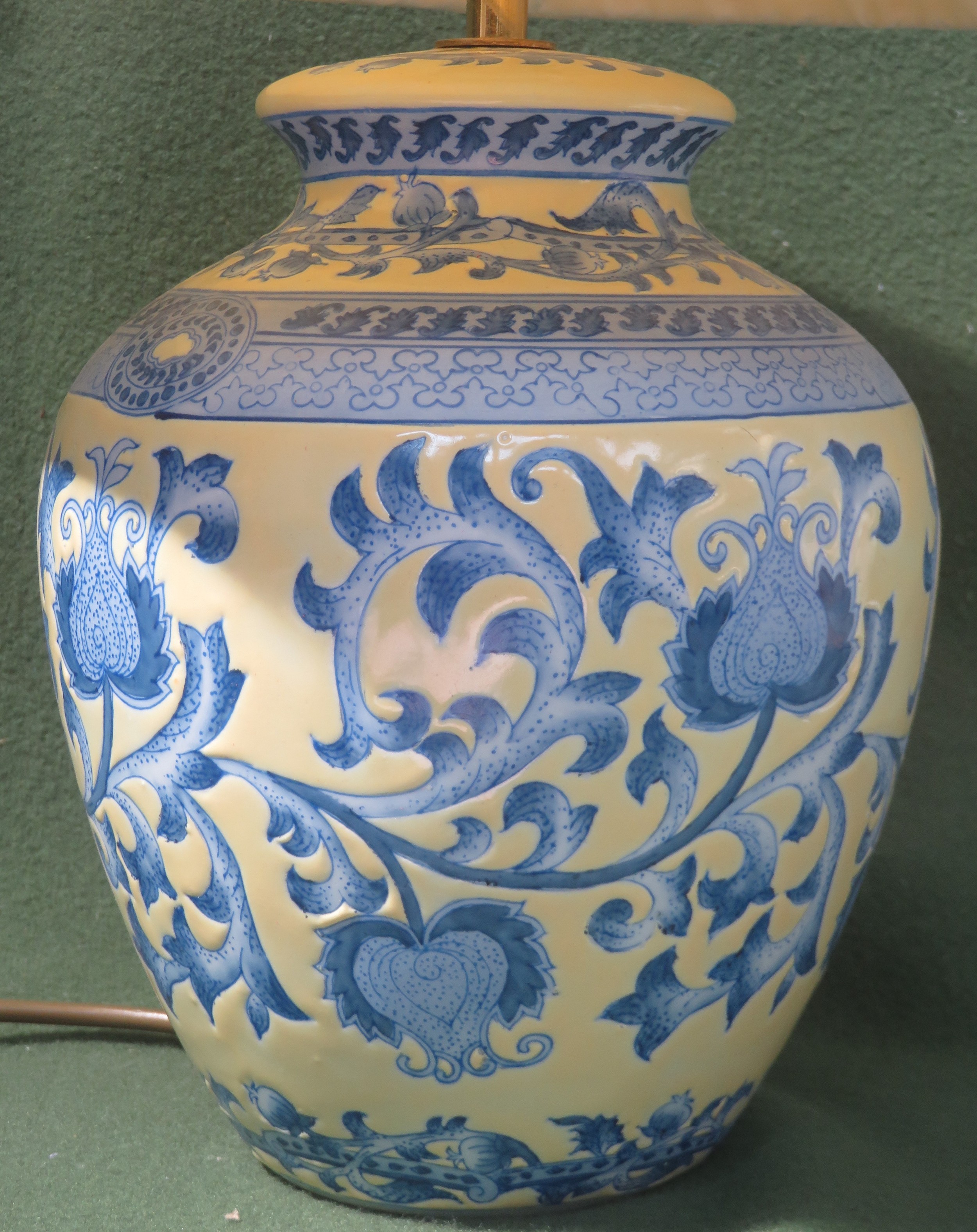 20th century decorative Oriental style ceramic table lamp with shade. lamp base measures Approx. 24cms High