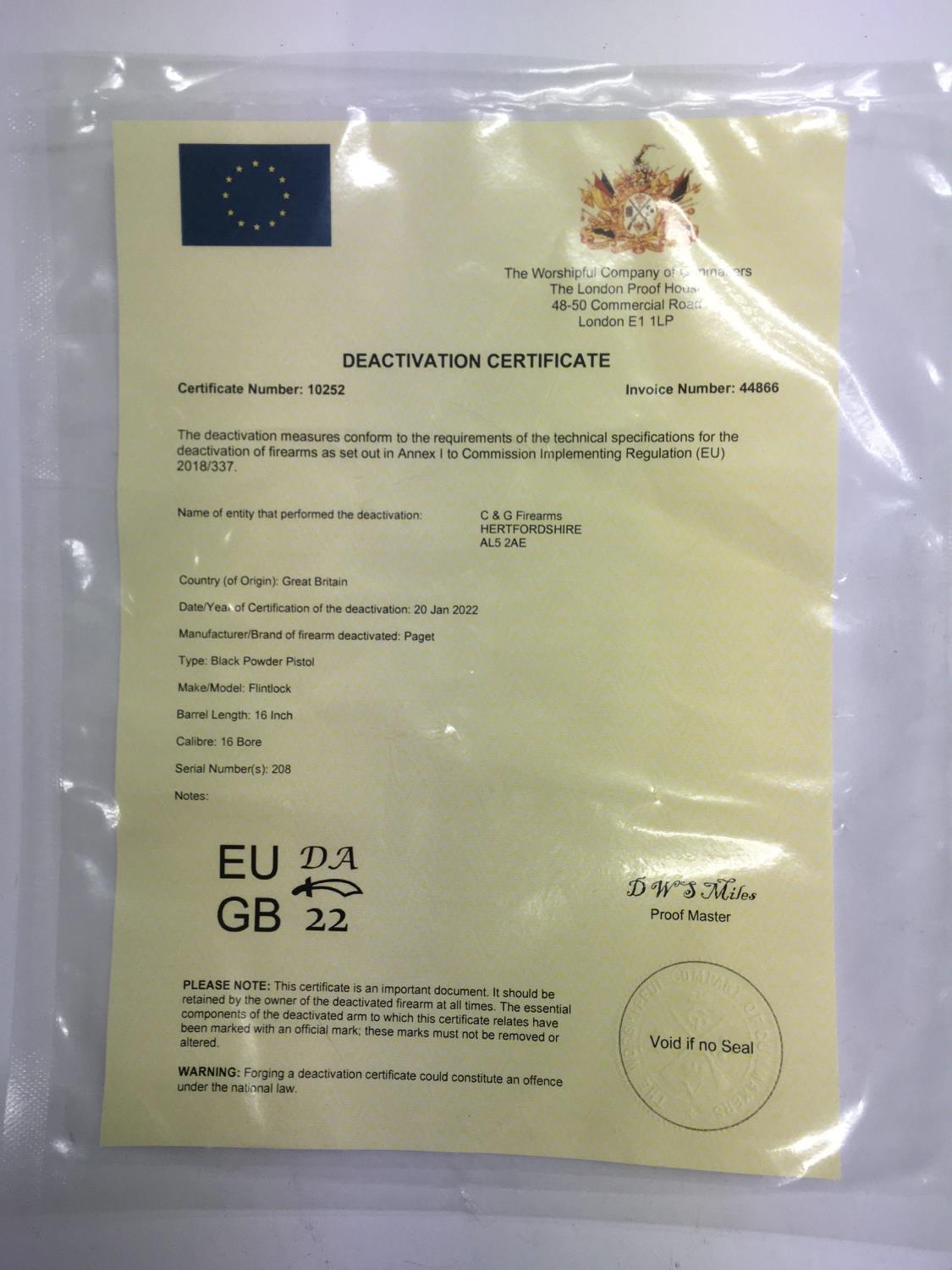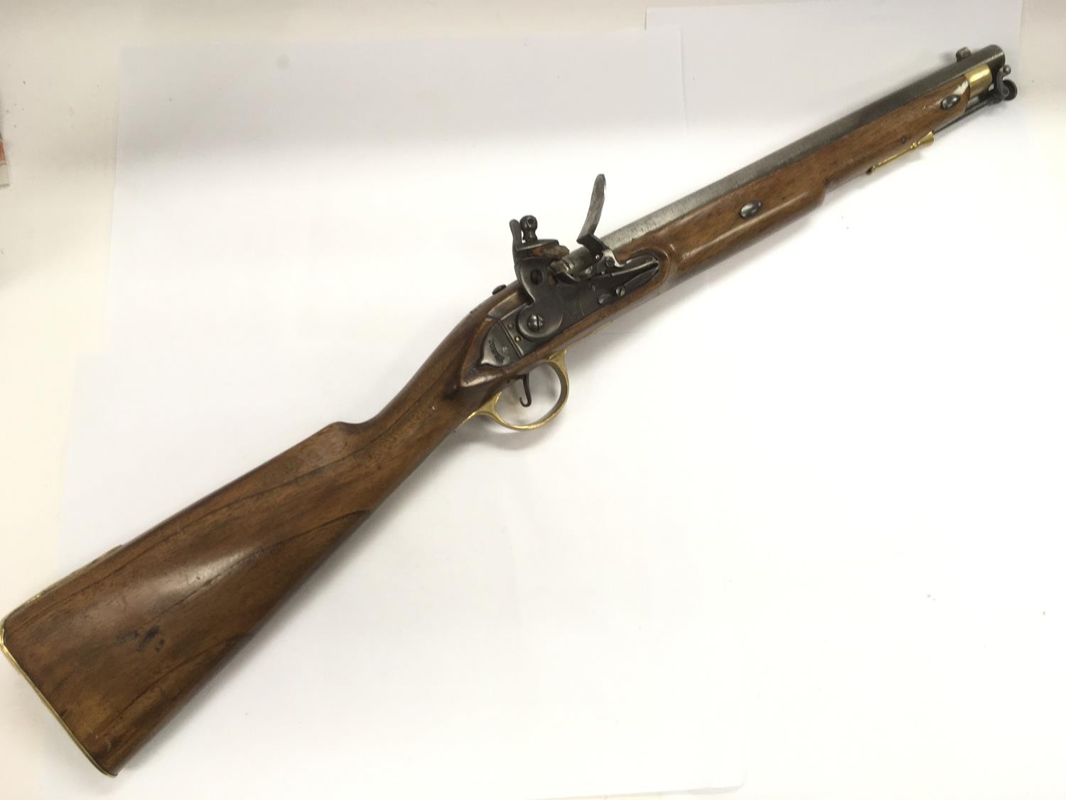 A deactivated copy of a flintlock Volunteer cavalry carbine by Paget, serial number 208, barrel 16", 16 bore, certificate number 10252. Comes supplied with a deactivation certificate.