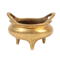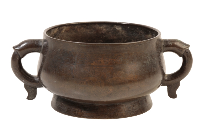 A CHINESE BRONZE CENSER, Ming, the circular bulbous body lightly engraved with archaistic style decoration within geometric key-pattern borders, the zoomorphic scroll handles modelled as serpents with shaped tails, 17cm dia. across the handles