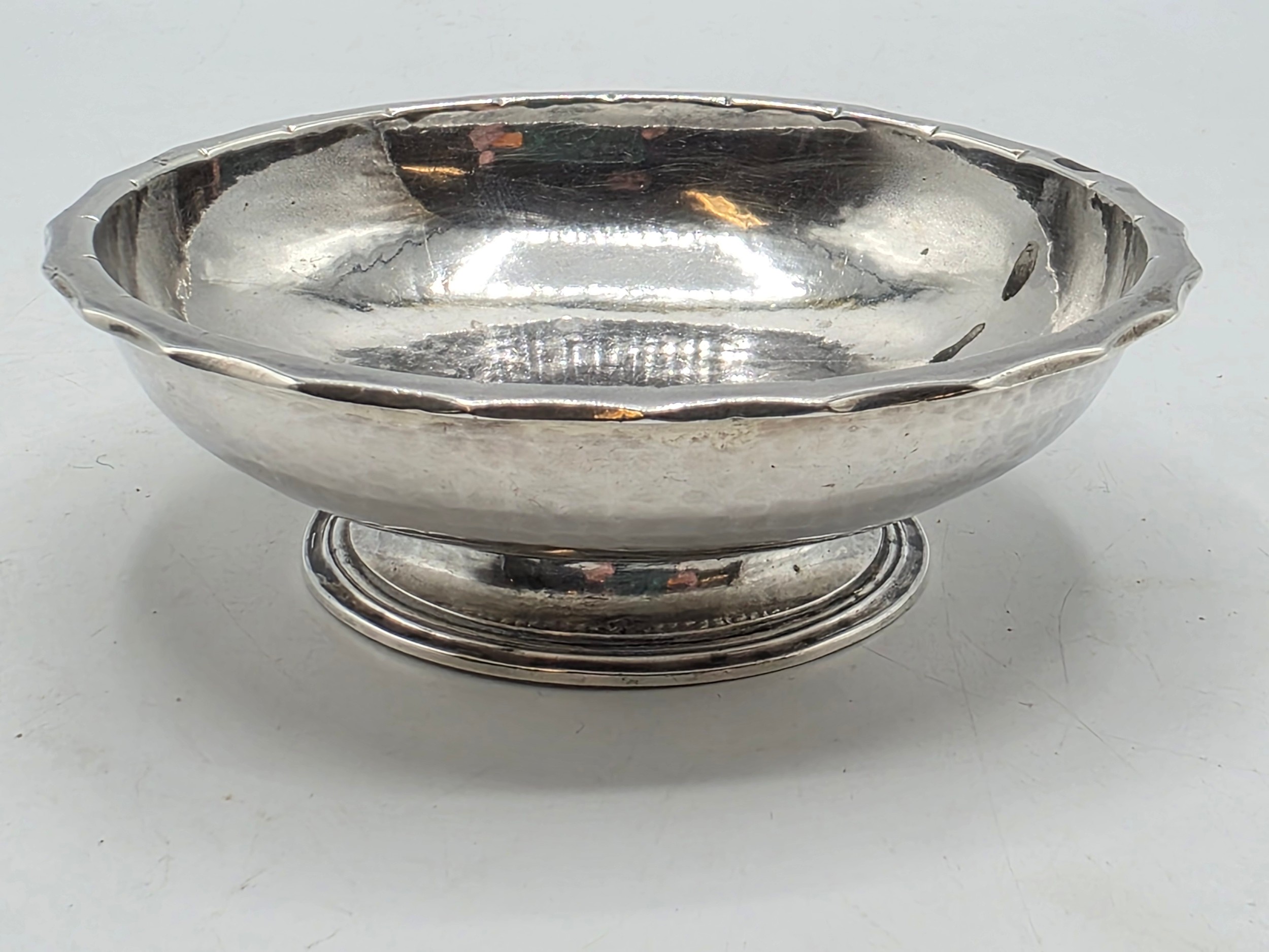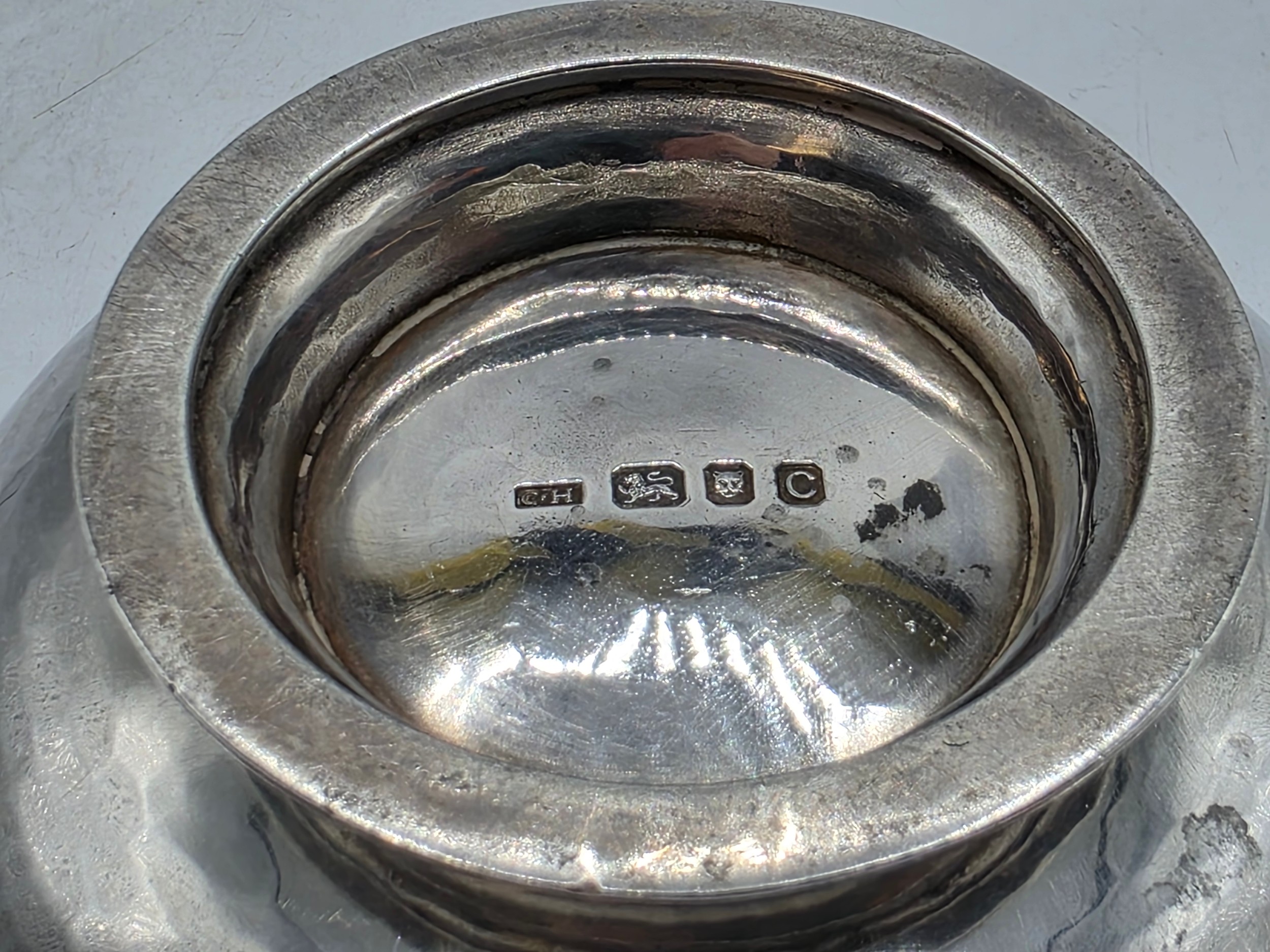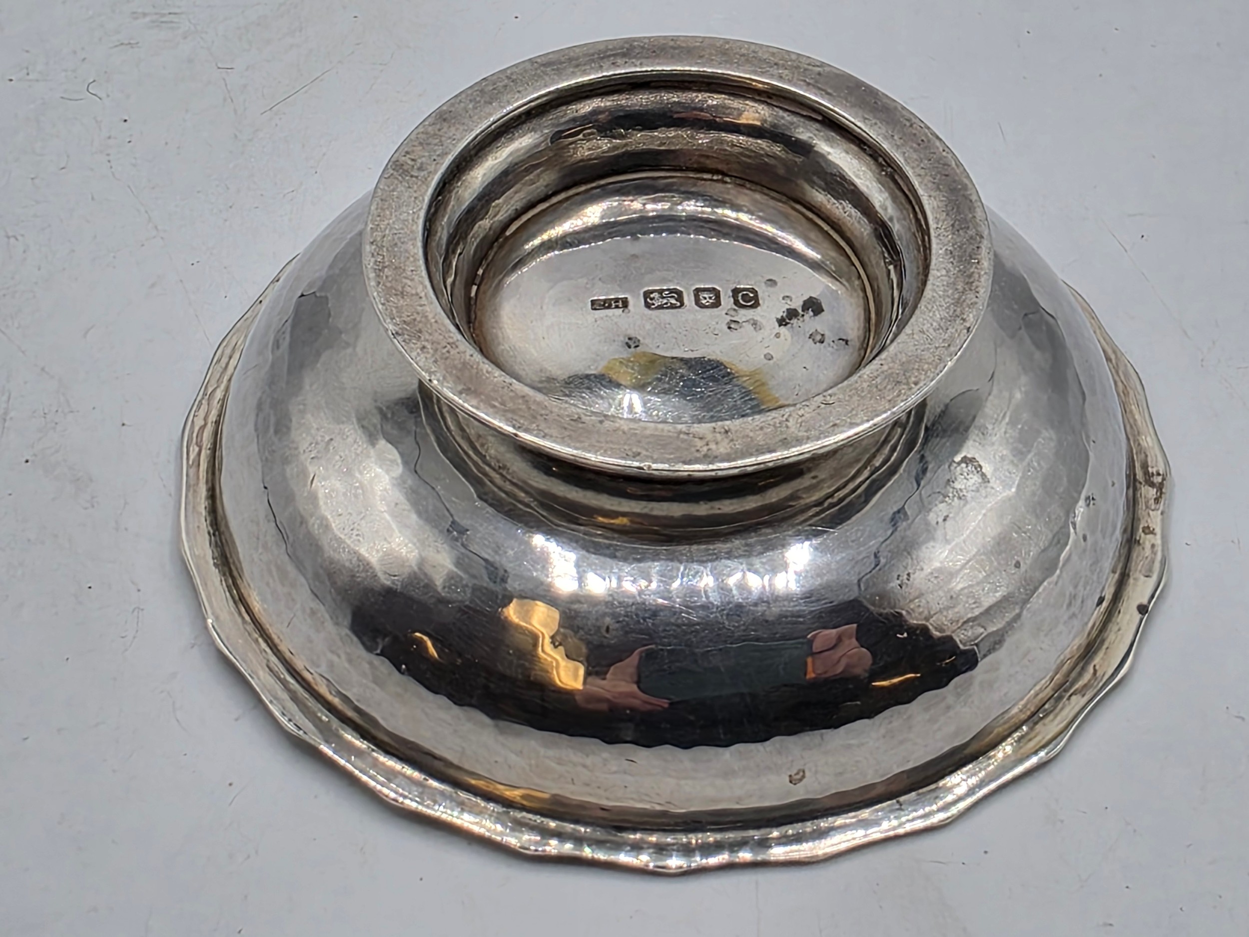 A sterling silver small footed bowl with plannished decoration, GF London 2002. 141g