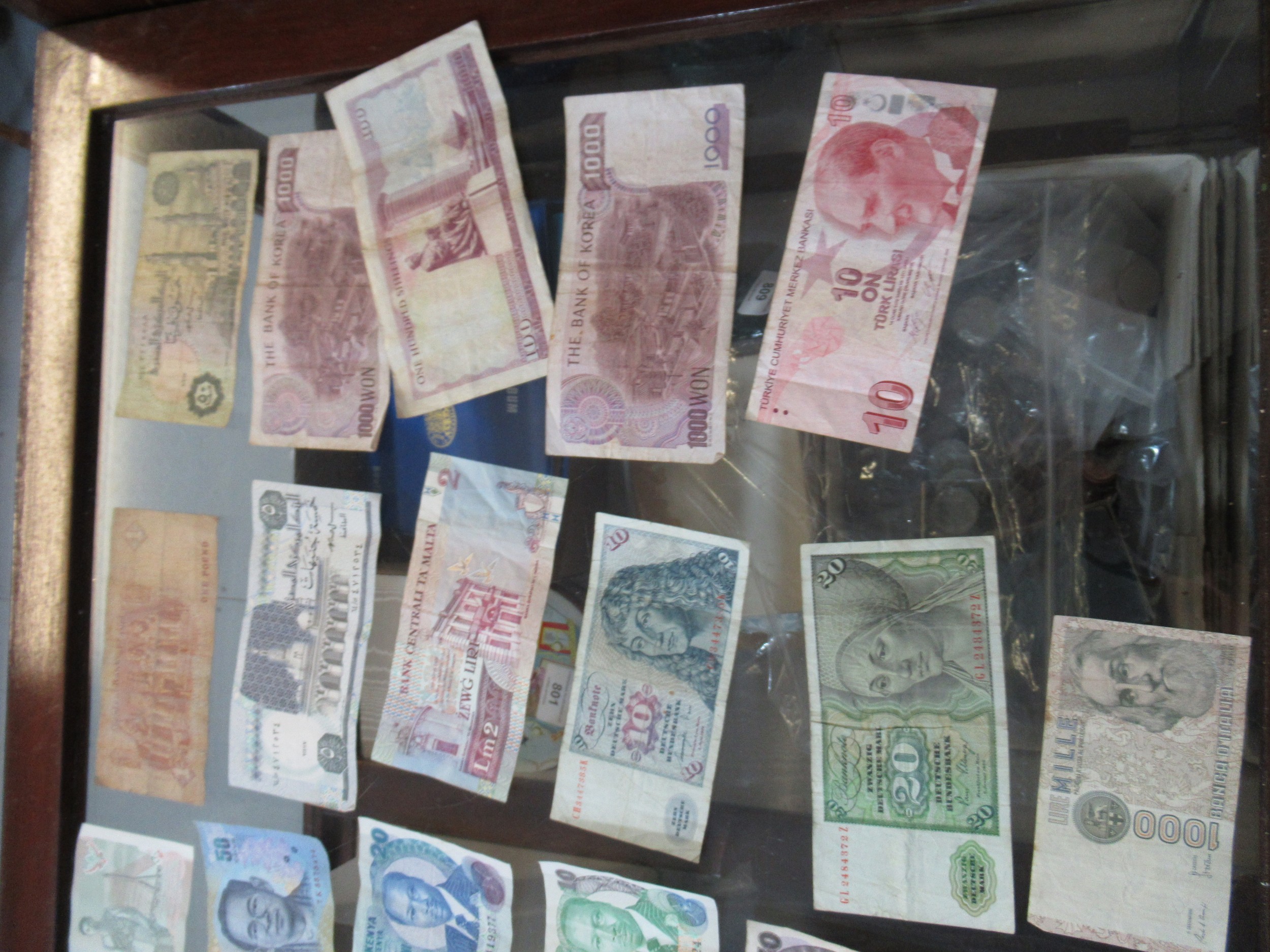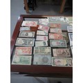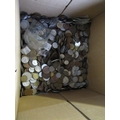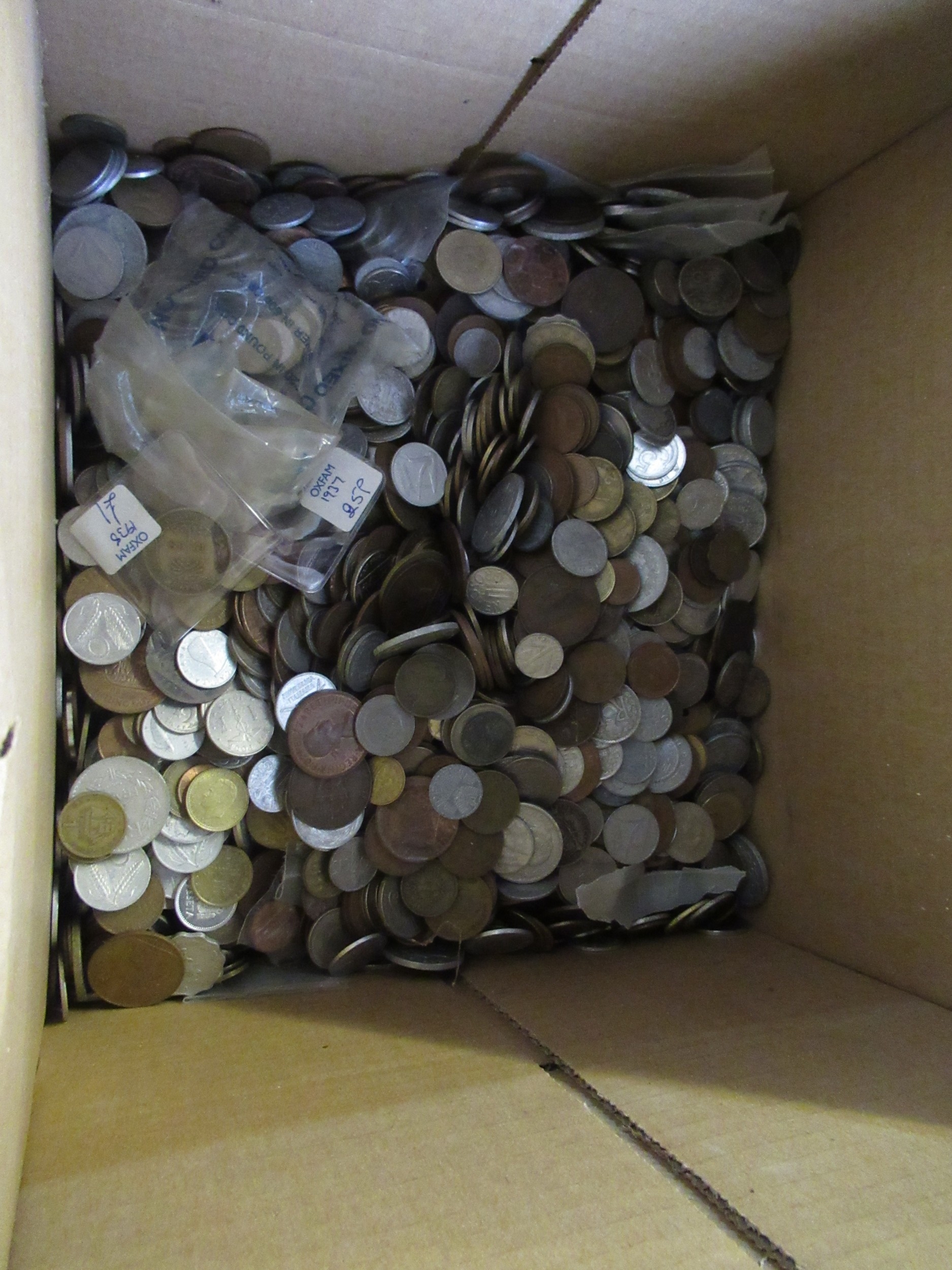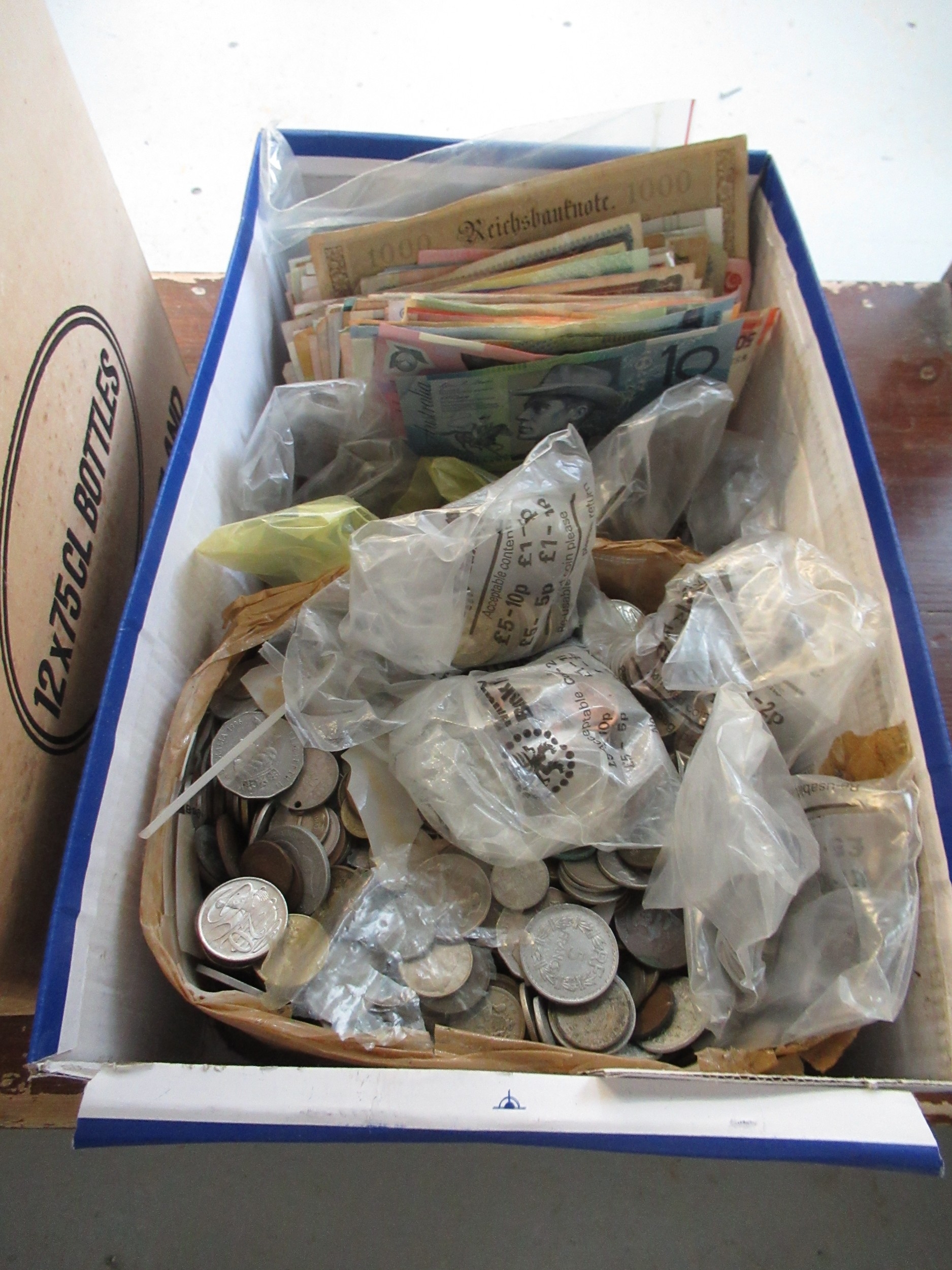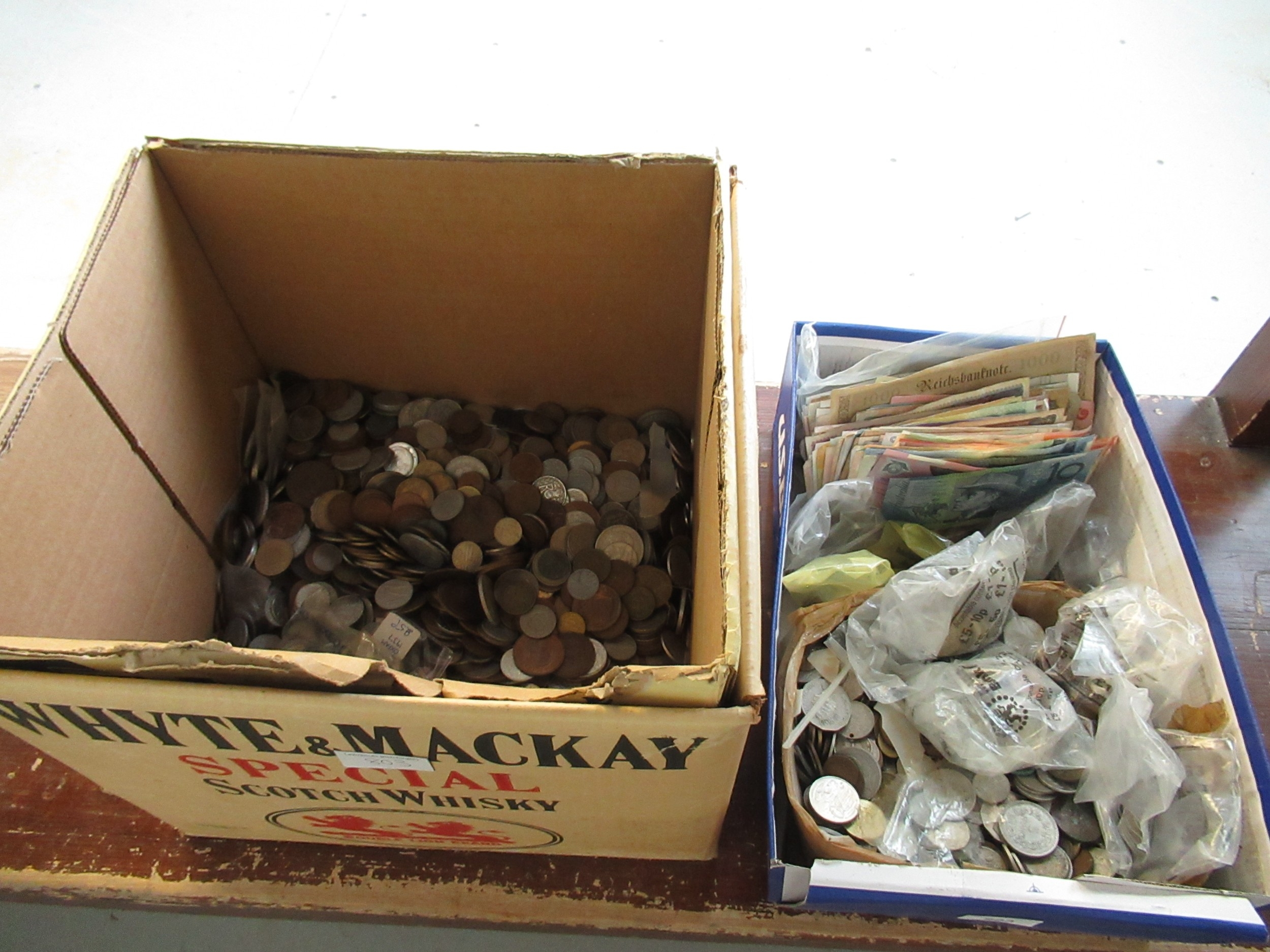 Two boxes containing a large quantity of various World coinage and bank notes including two antique hammered coins, a wheel penny etc