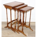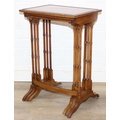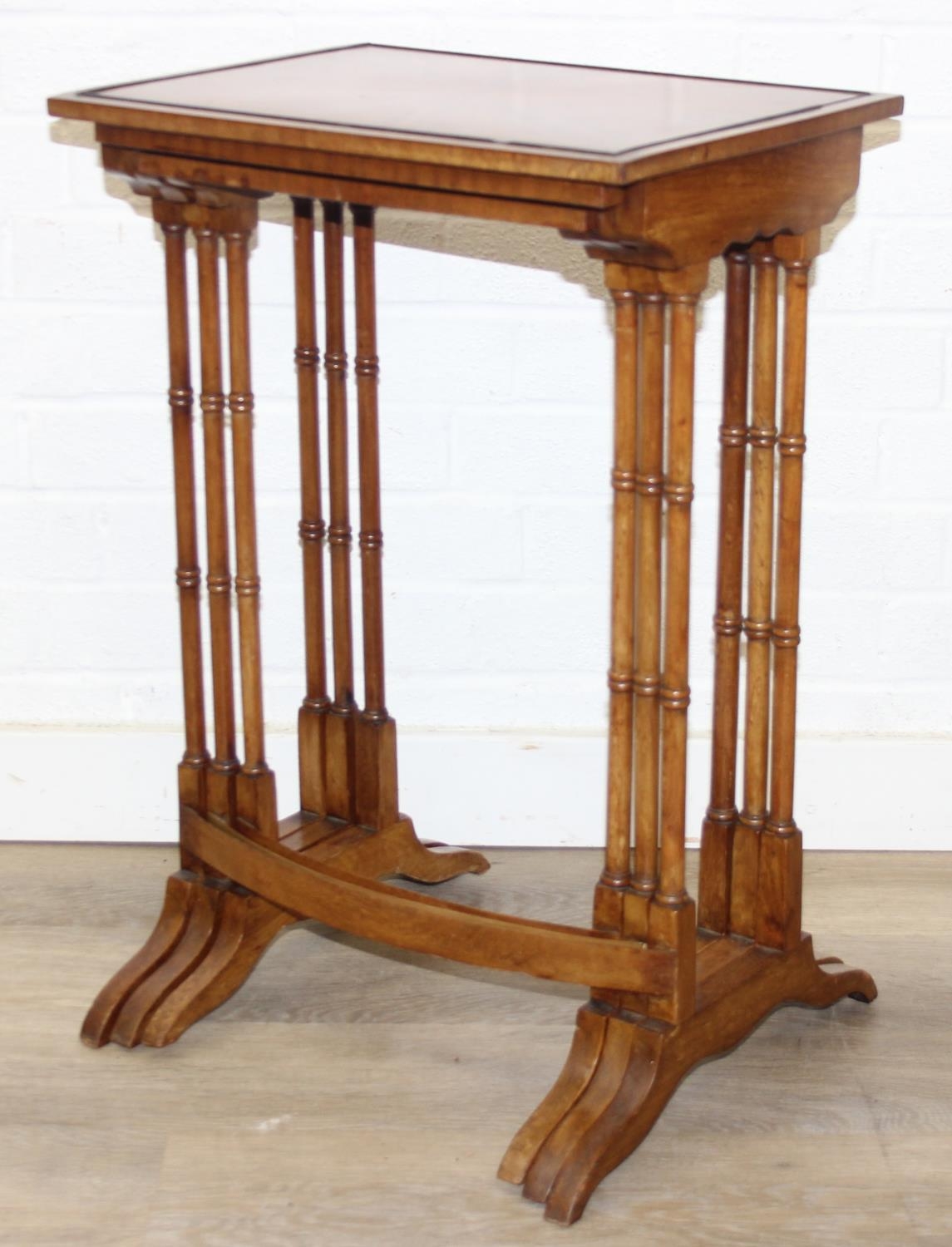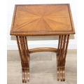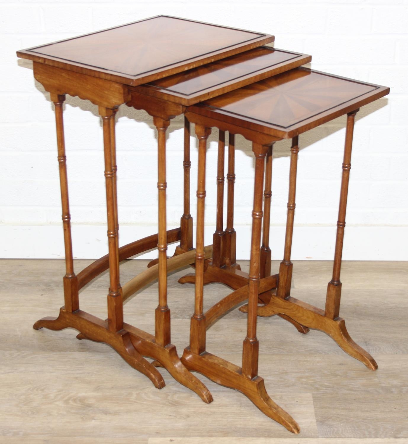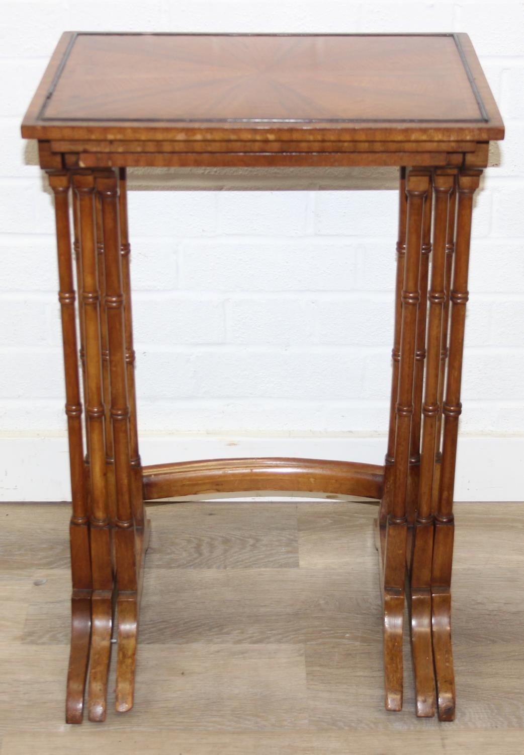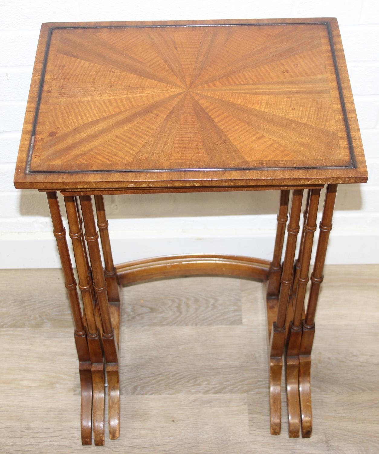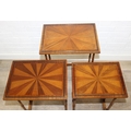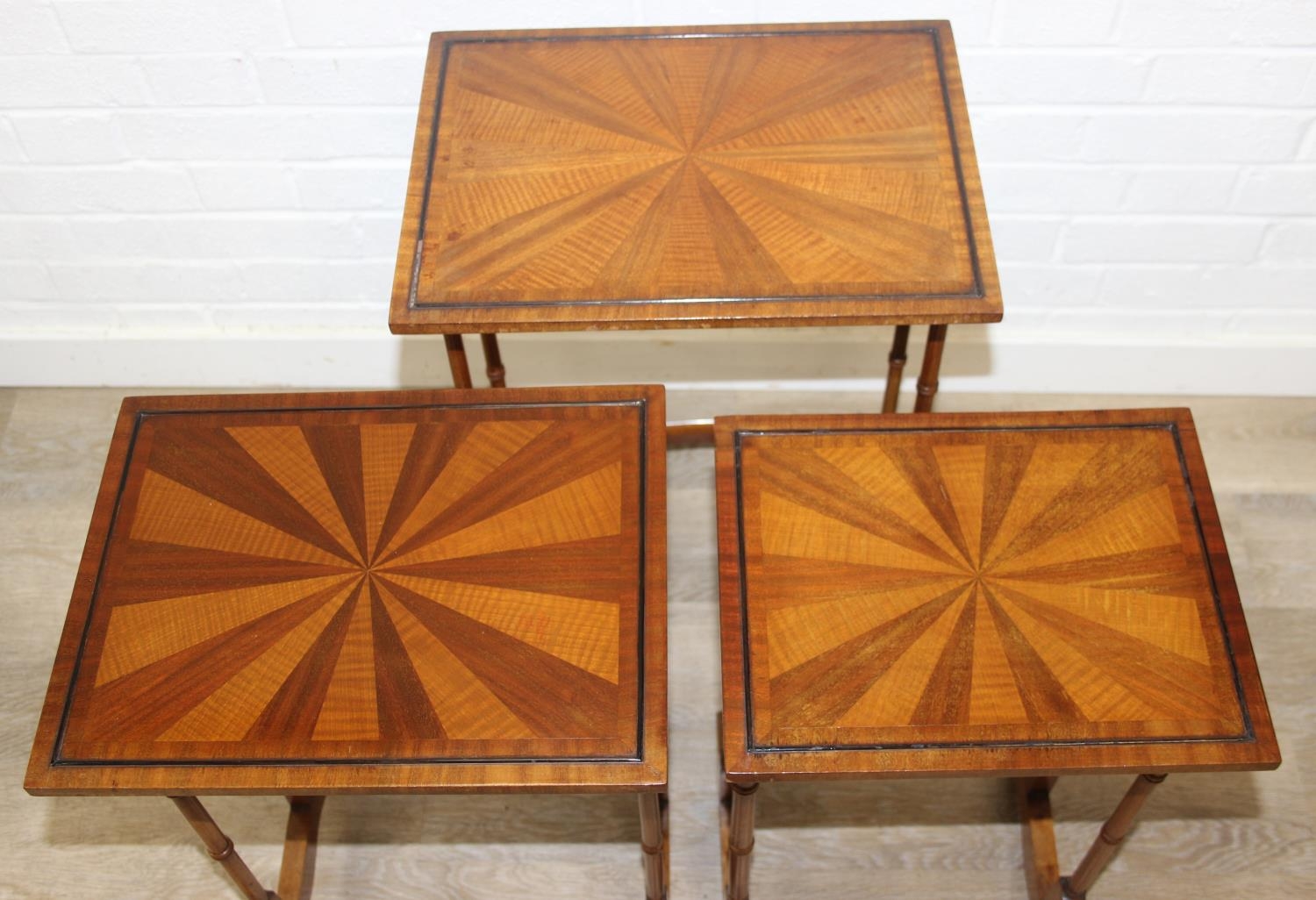 Vintage nest of tables with bamboo style turned legs, sunburst design inlaid tops and raised inlaid beading, the largest 44cm x 33cm x 65cm