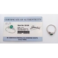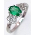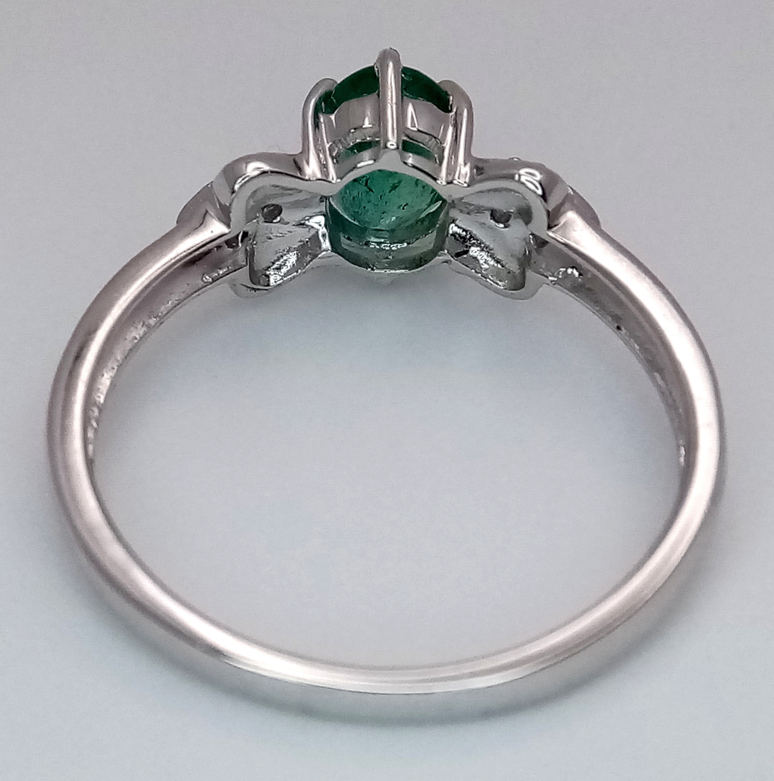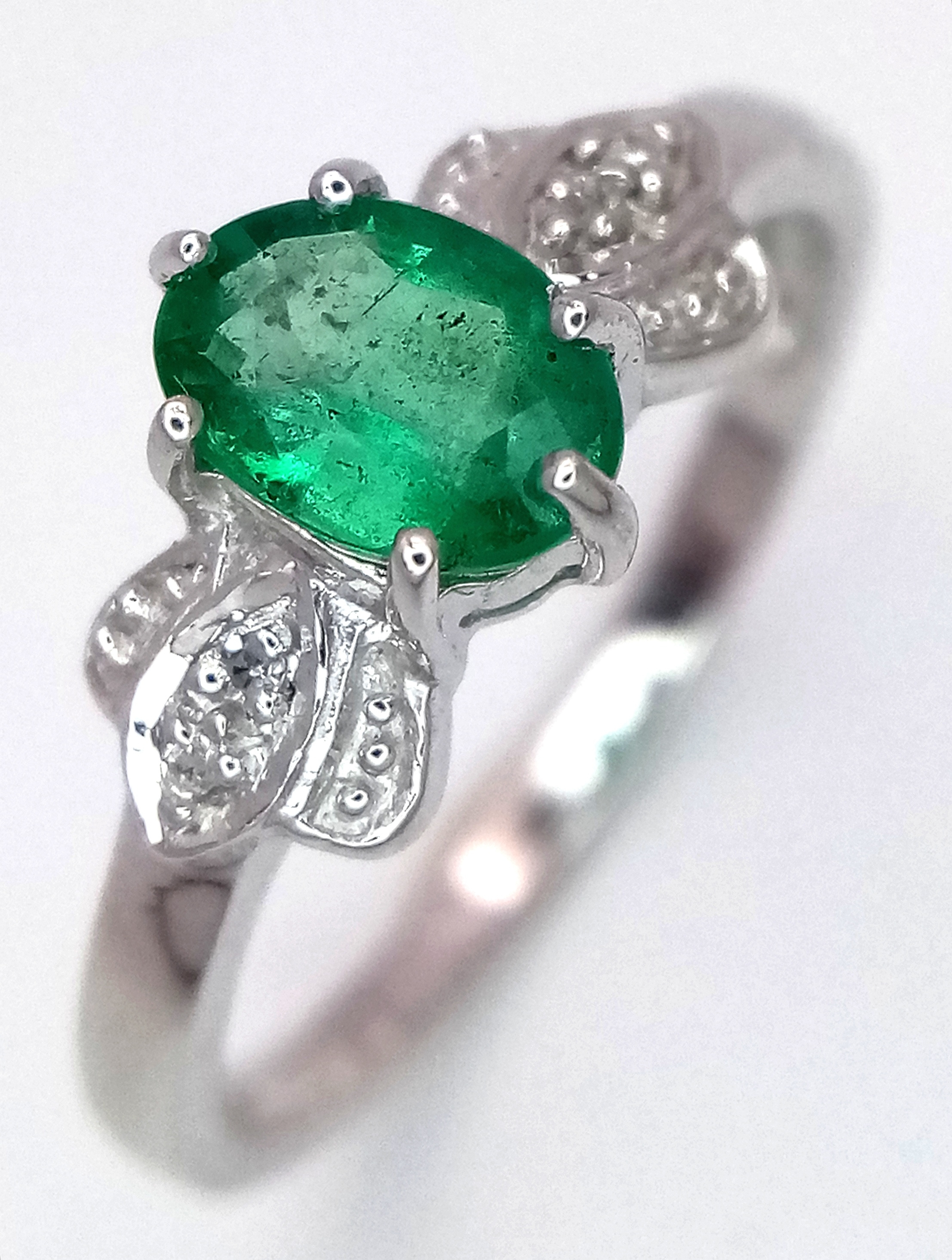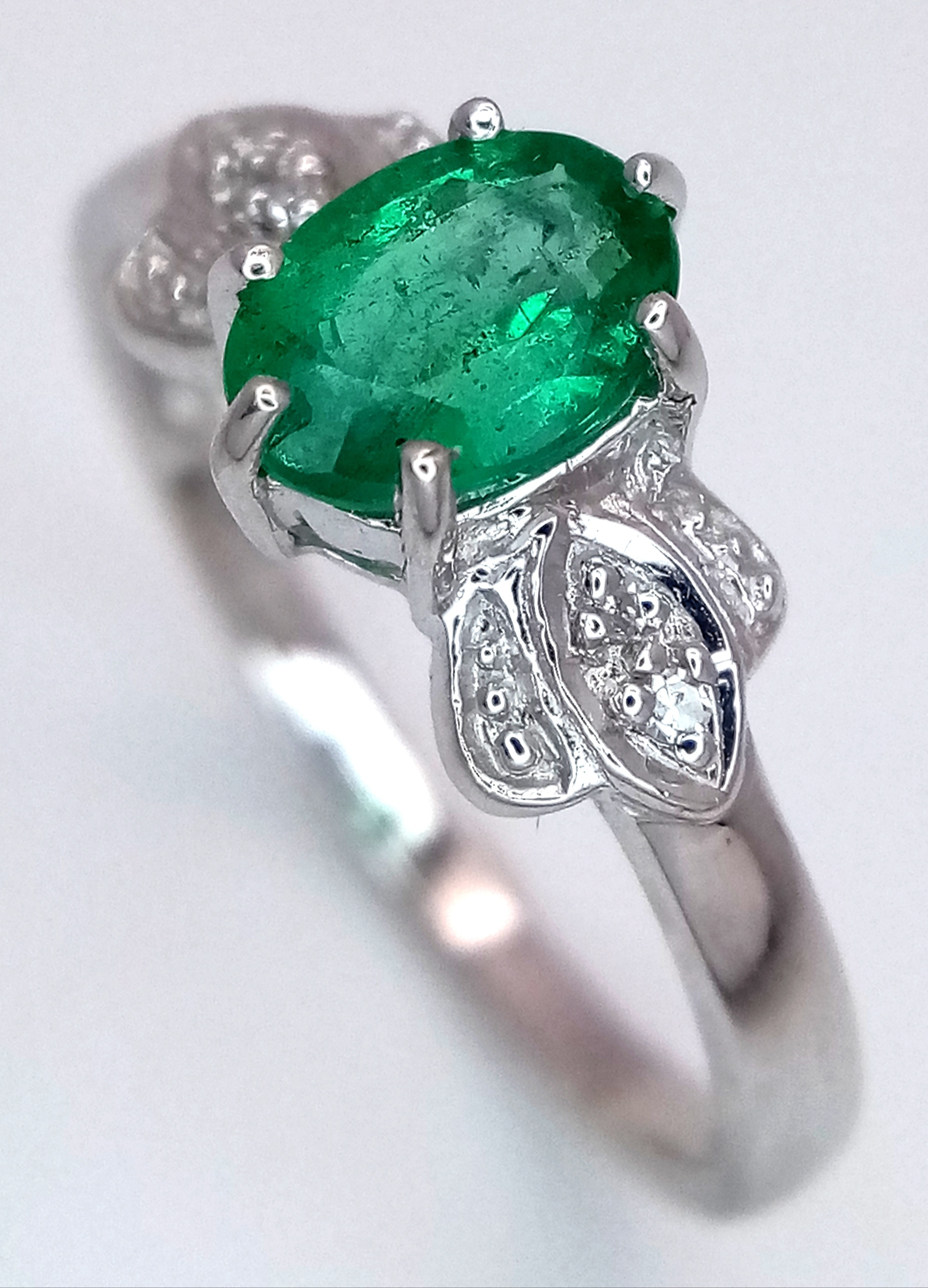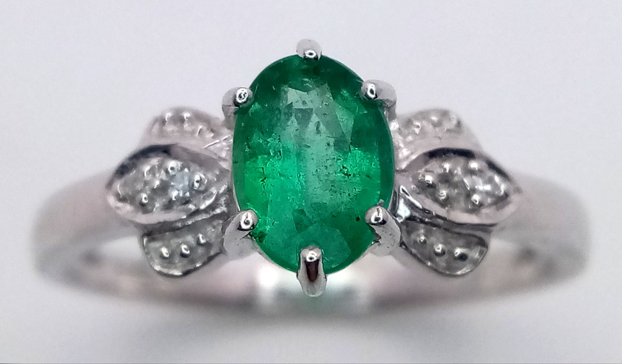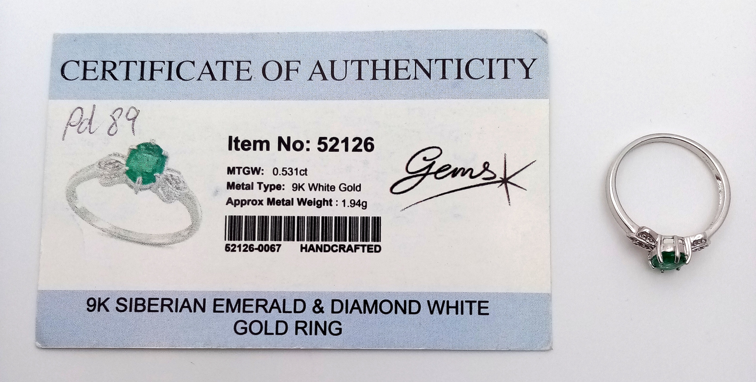 A 9k White Gold, Emerald and Diamond Ring. An oval cut, 0.515ct Siberian emerald with 0.016ctw of diamond accents. Size N. 2.1g total weight. NL 20/51005. Comes with a certificate of authenticity.