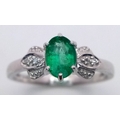 A 9k White Gold, Emerald and Diamond Ring. An oval cut, 0.51...