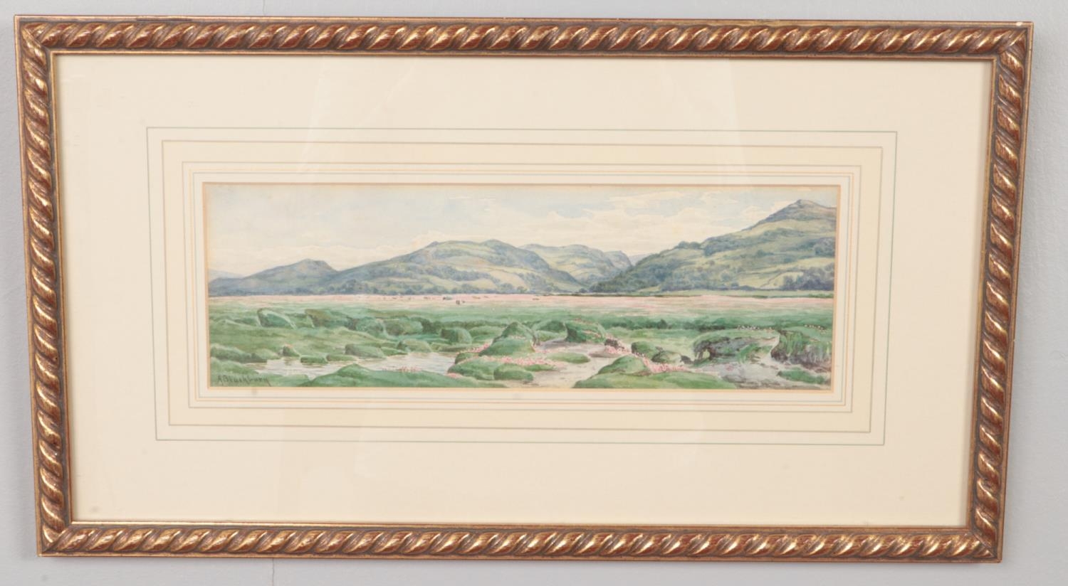 Arthur Blackburn, gilt framed watercolour on board, landscape scene. (10cm x 30cm)